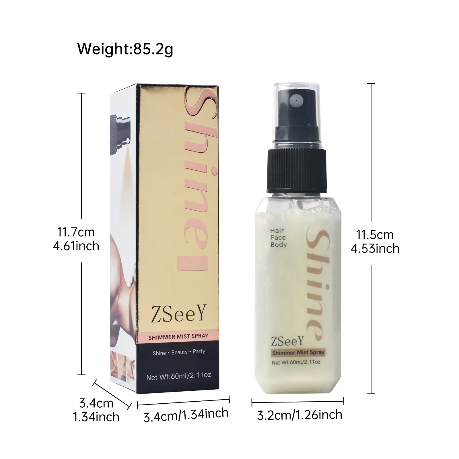 2. Application: Hold the bottle 20–30cm away from the area you want to highlight. For the face: Close your eyes and mouth, then spritz lightly on cheekbones, nose bridge, brow bones, or eye corners. For the body: Spray evenly on collarbones, neck, shoulders, arms, or legs—build up the intensity by spritzing a little more if desired. For hair: Mist lightly on dry hair (focus on the ends or crown) for a subtle, sparkly finish.