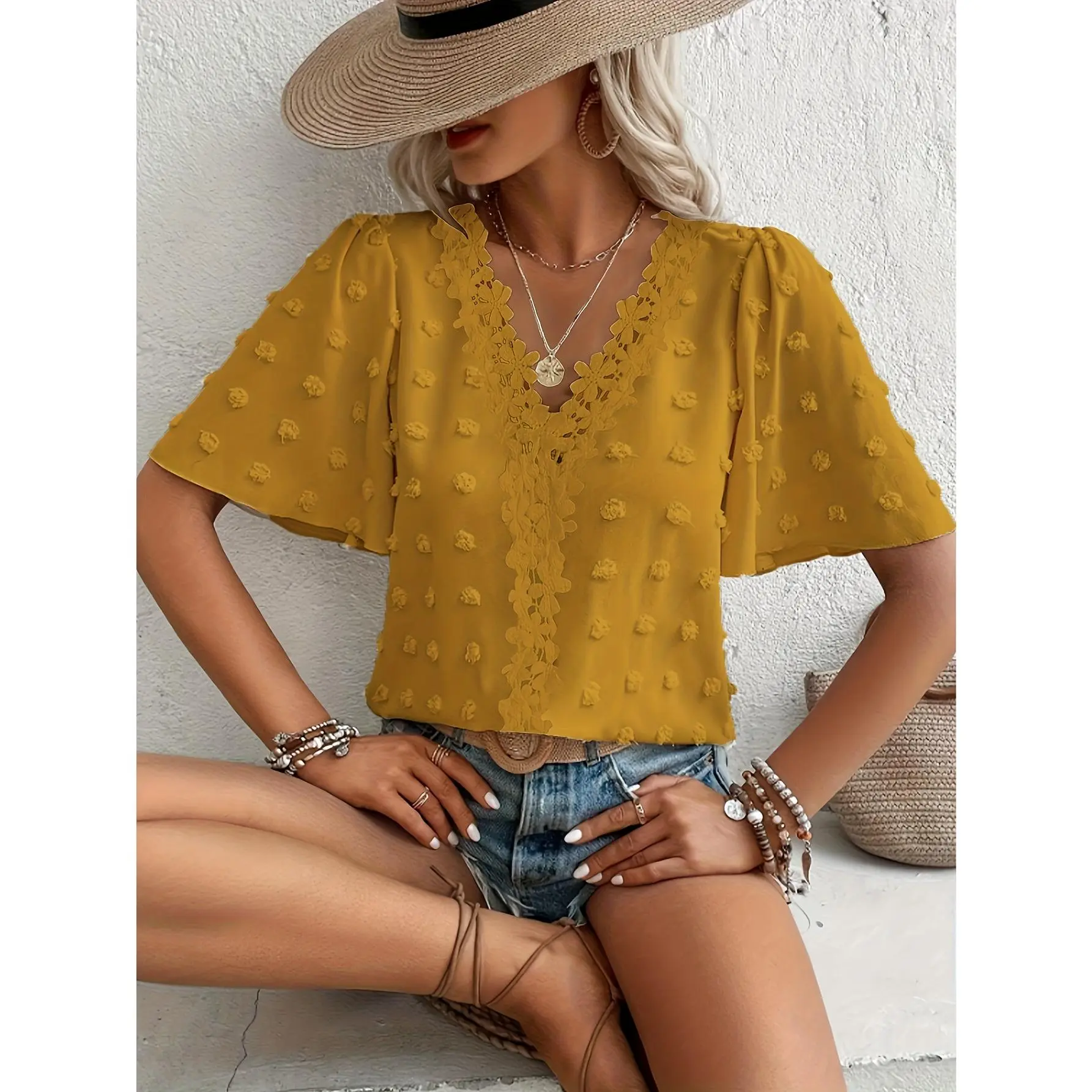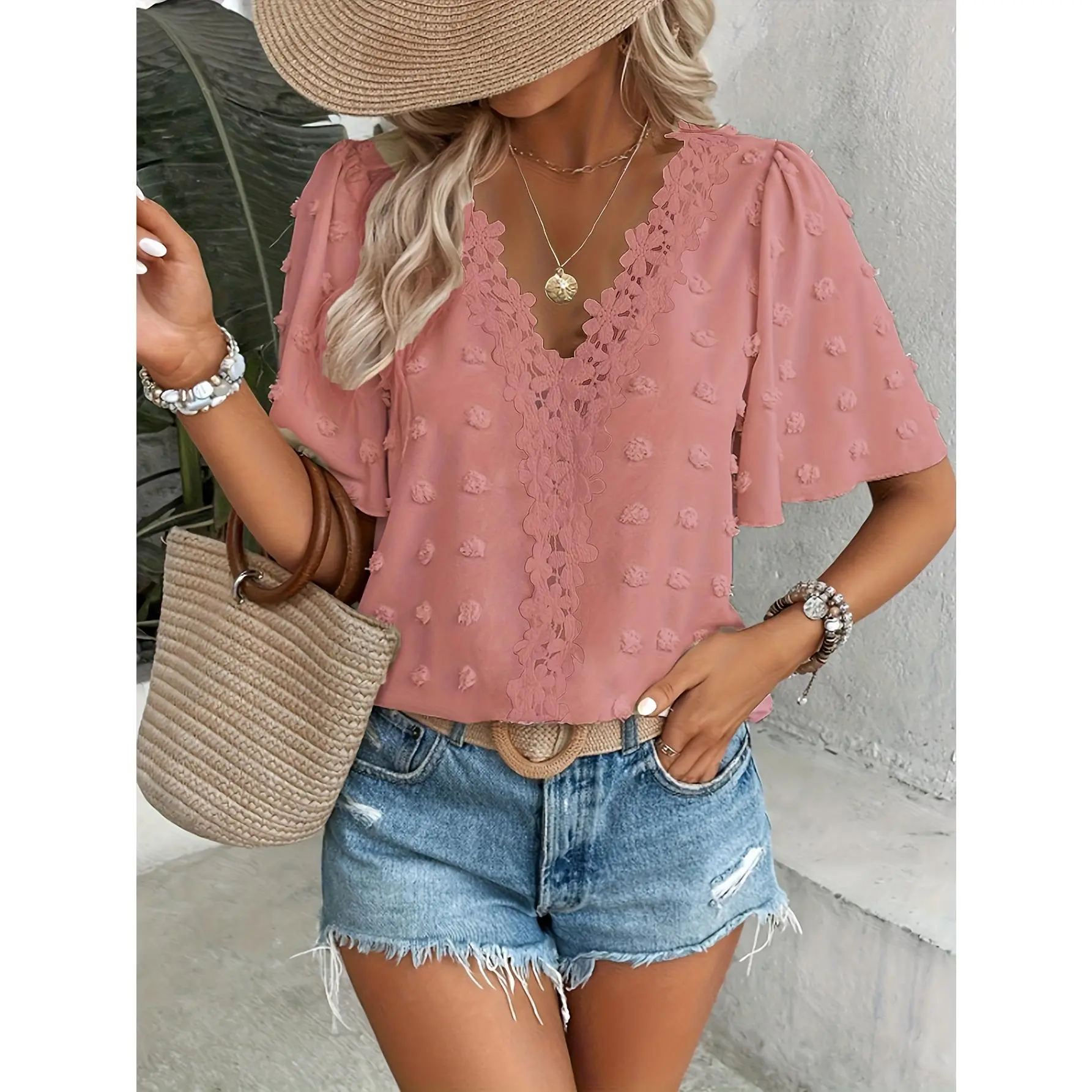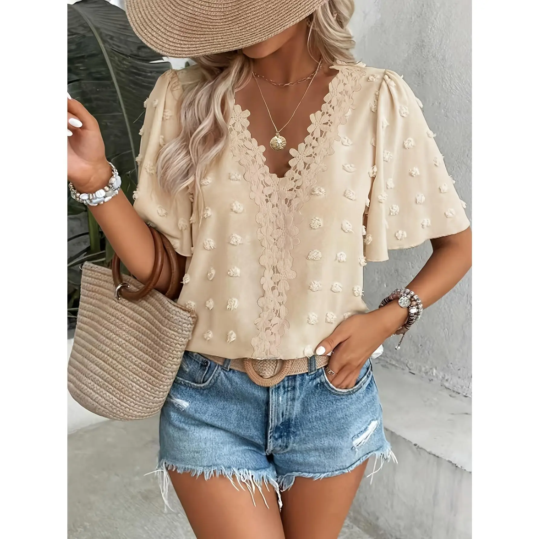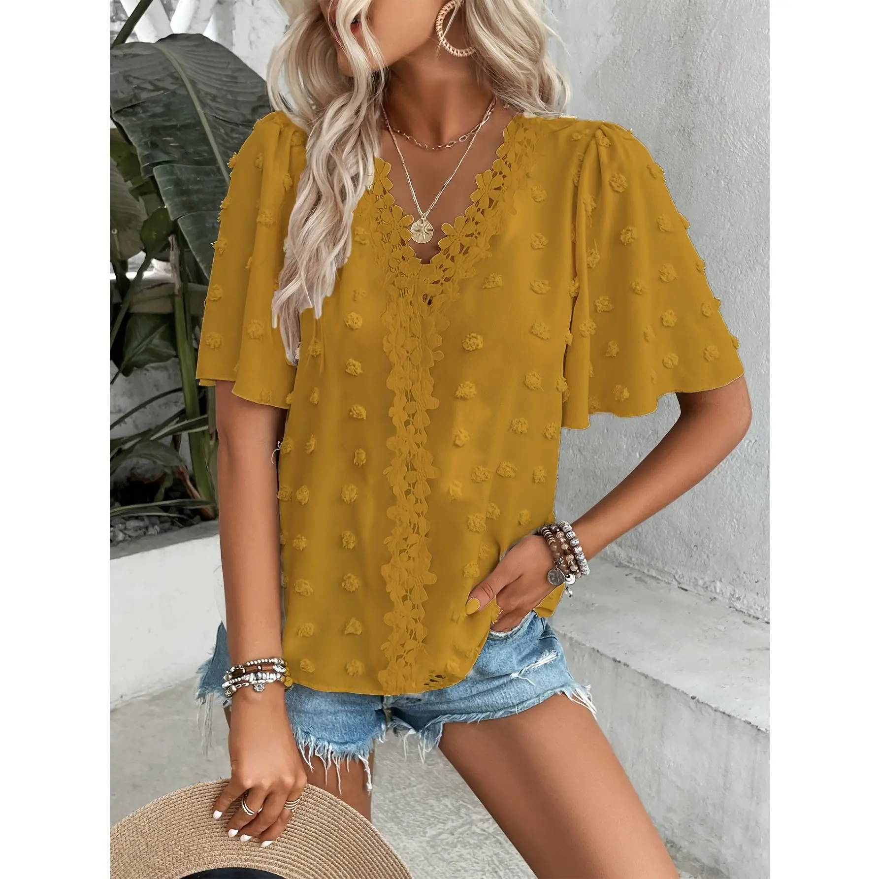 Elevate your summer wardrobe with this elegant top. Crafted from 100% Polyester Fiber, it offers a solid color design with no printed patterns. The V-neck and butterfly sleeves add a touch of sophistication. Perfect for all seasons, this loose fit top is machine washable and non-dry cleaning. Ideal for global wear, it combines style with practicality. 🌞