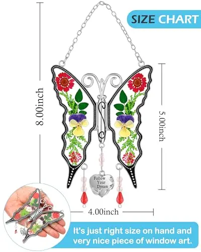 Inspirational Message: The stained glass butterfly suncatchers for windows garden decor features Follow Your Dream engraved on a hanging heart charm expressing your love to mother. The butterfly suncatcher is also a good holiday decoration. You can hang it on the wall, window or yard, garden, patio, corridor, balcony and home, which will make your living room or yard more lively