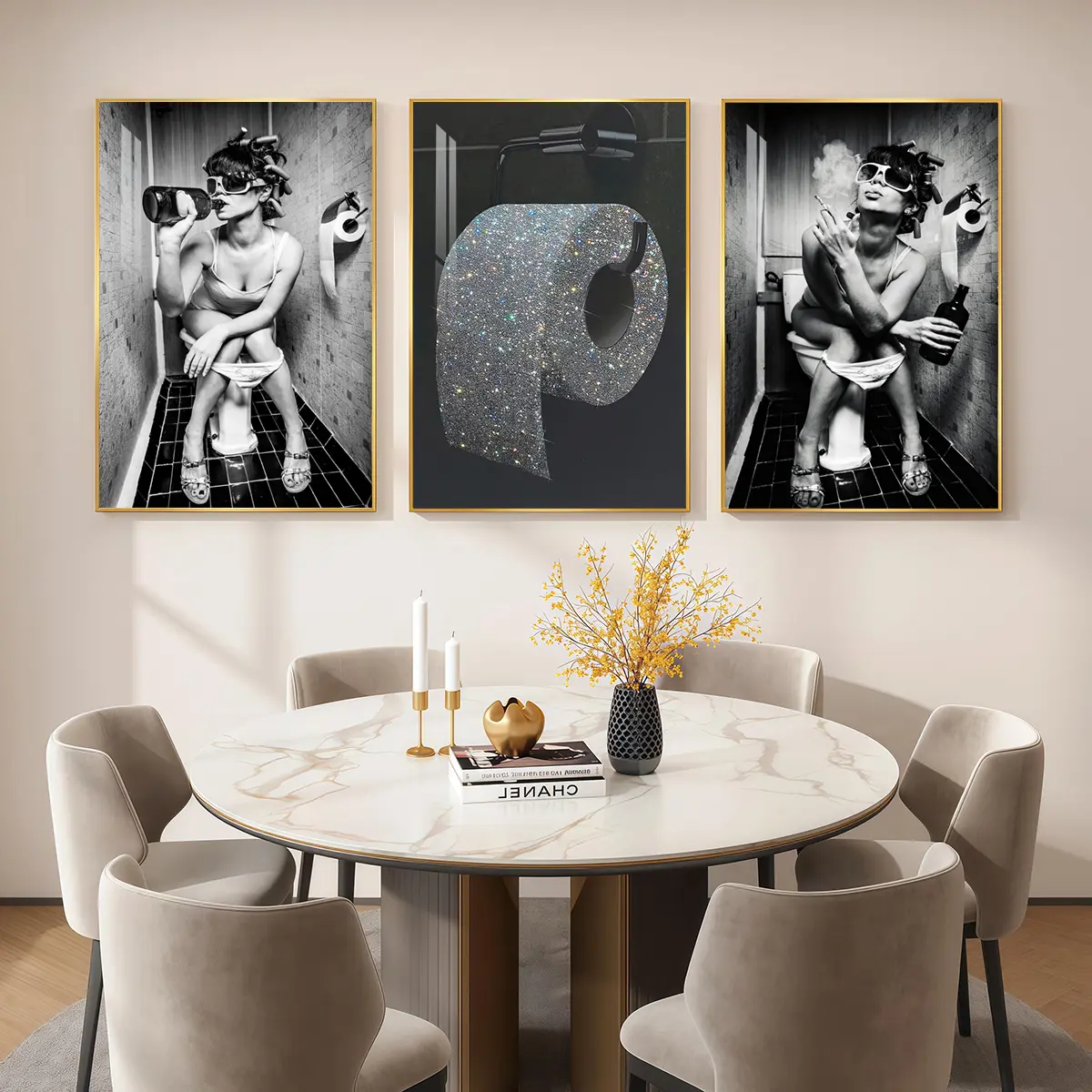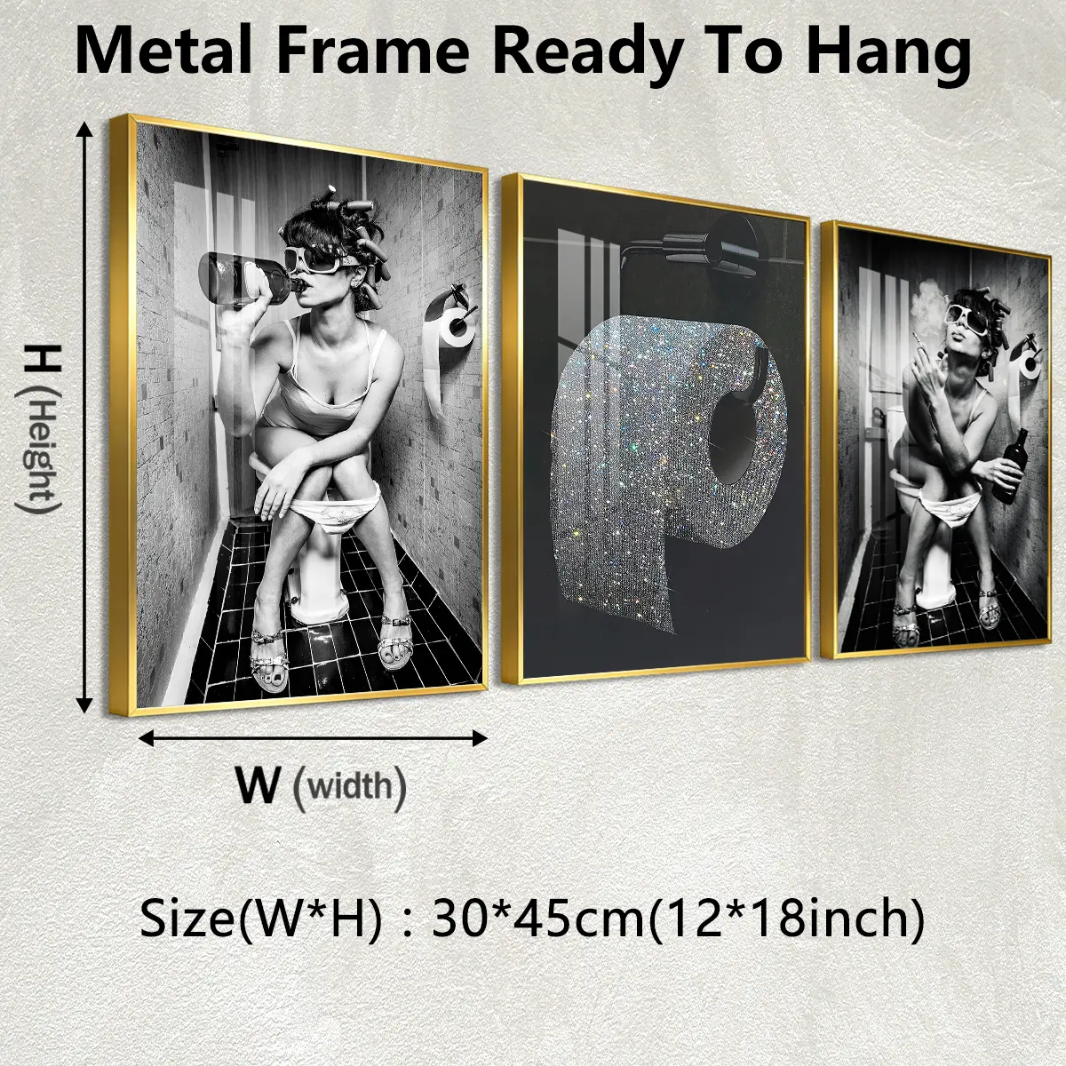 3 Counts Aluminum Alloy Framed Painting, Funny Woman Bathroom Drinking And Smoking Poster, Home Decoration For Living Room, Bedroom, Office, Restaurant, Hallway Wall Decor, Odorless Print Artwork, Luxury Perfect Gift For Friends And Family