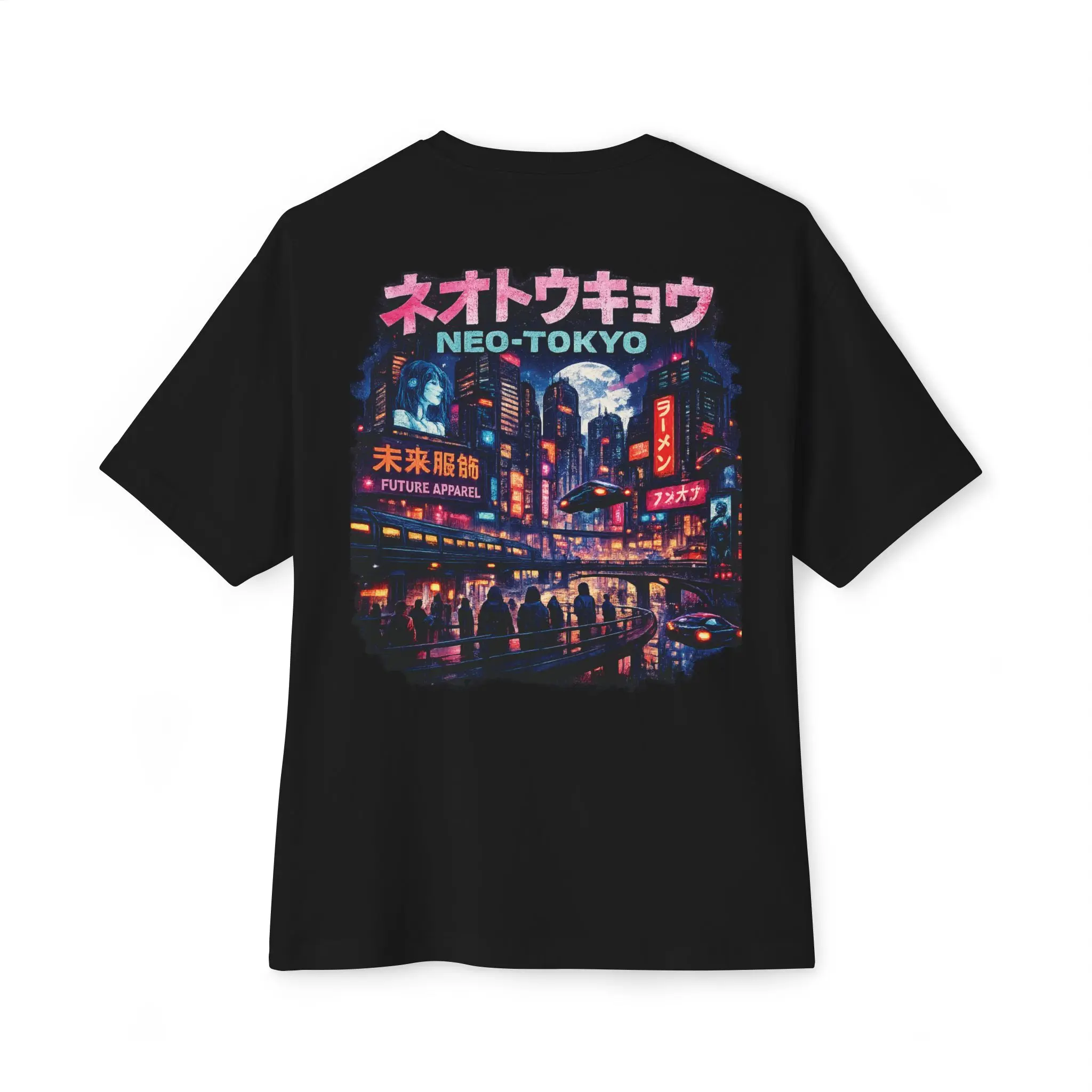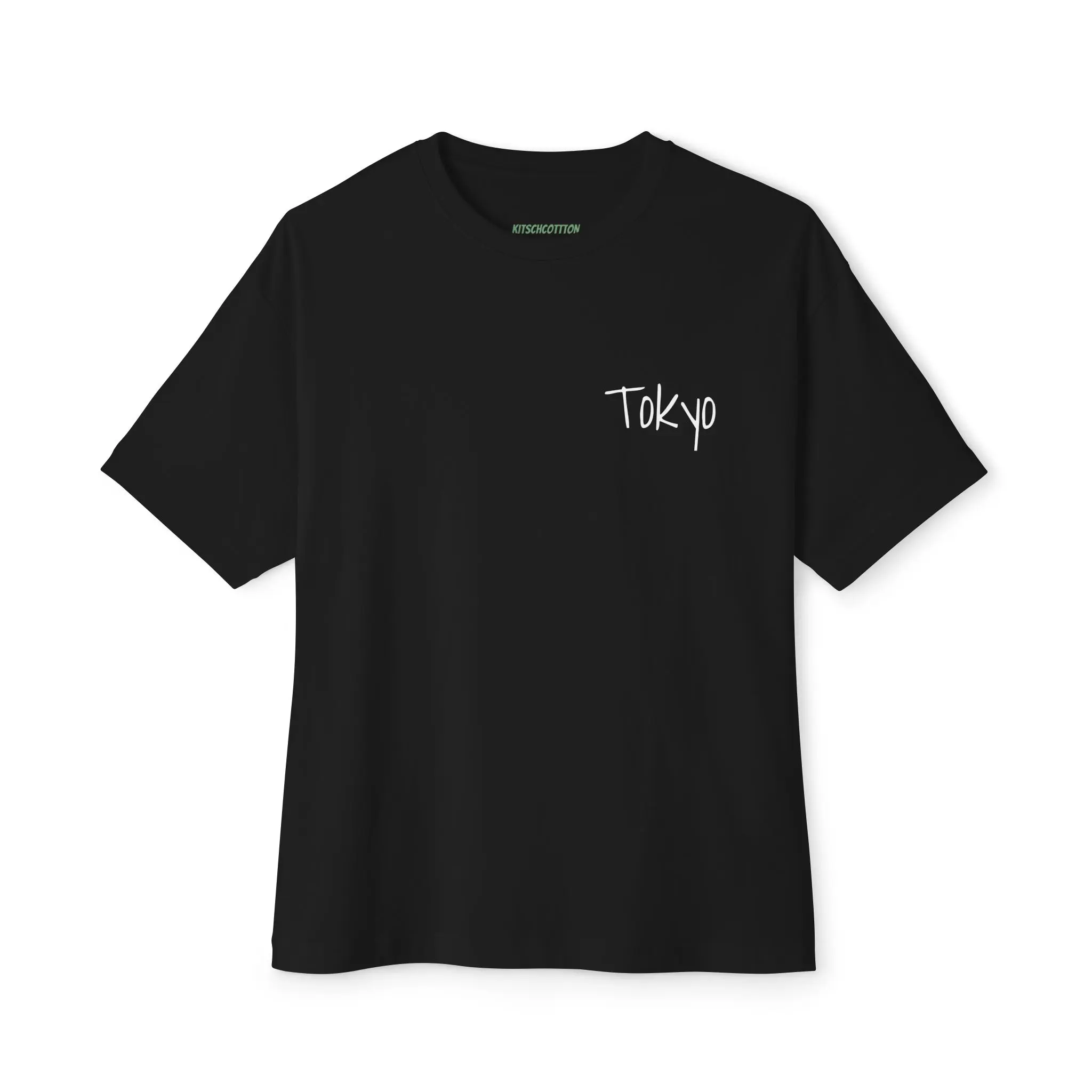 This oversized boxy tee brings the neon-soaked streets of Neo-Tokyo straight into your everyday rotation. The front carries a small, handwritten “Tokyo” whisper over the heart, while the back explodes with a rainy, cyberpunk cityscape in vivid pinks and blues.