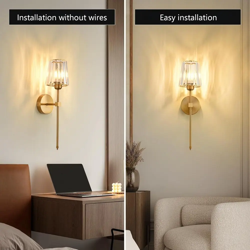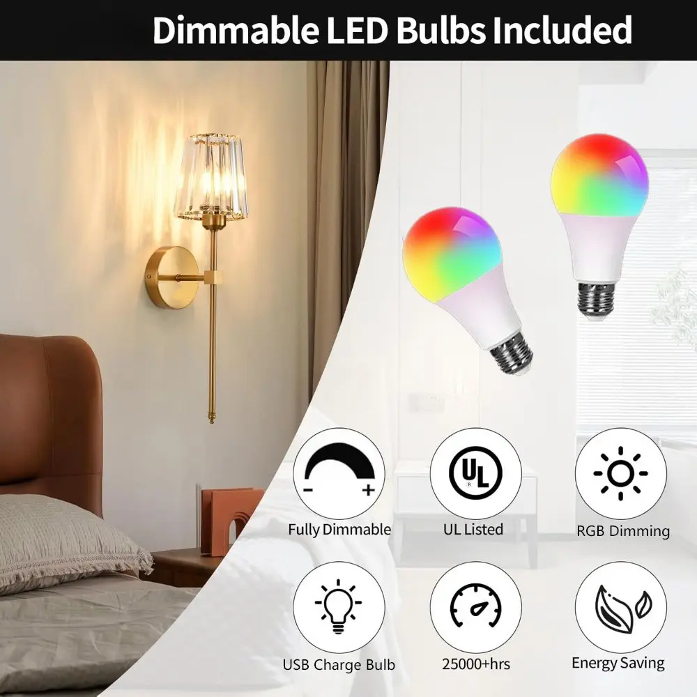 2-Pack Rechargeable Wall Lamps, Crystal Shade, RGB Bulb, Remote Control, Adjustable Light, Ideal for Bedroom, Living Room, Kitchen, Hallway, Entryway