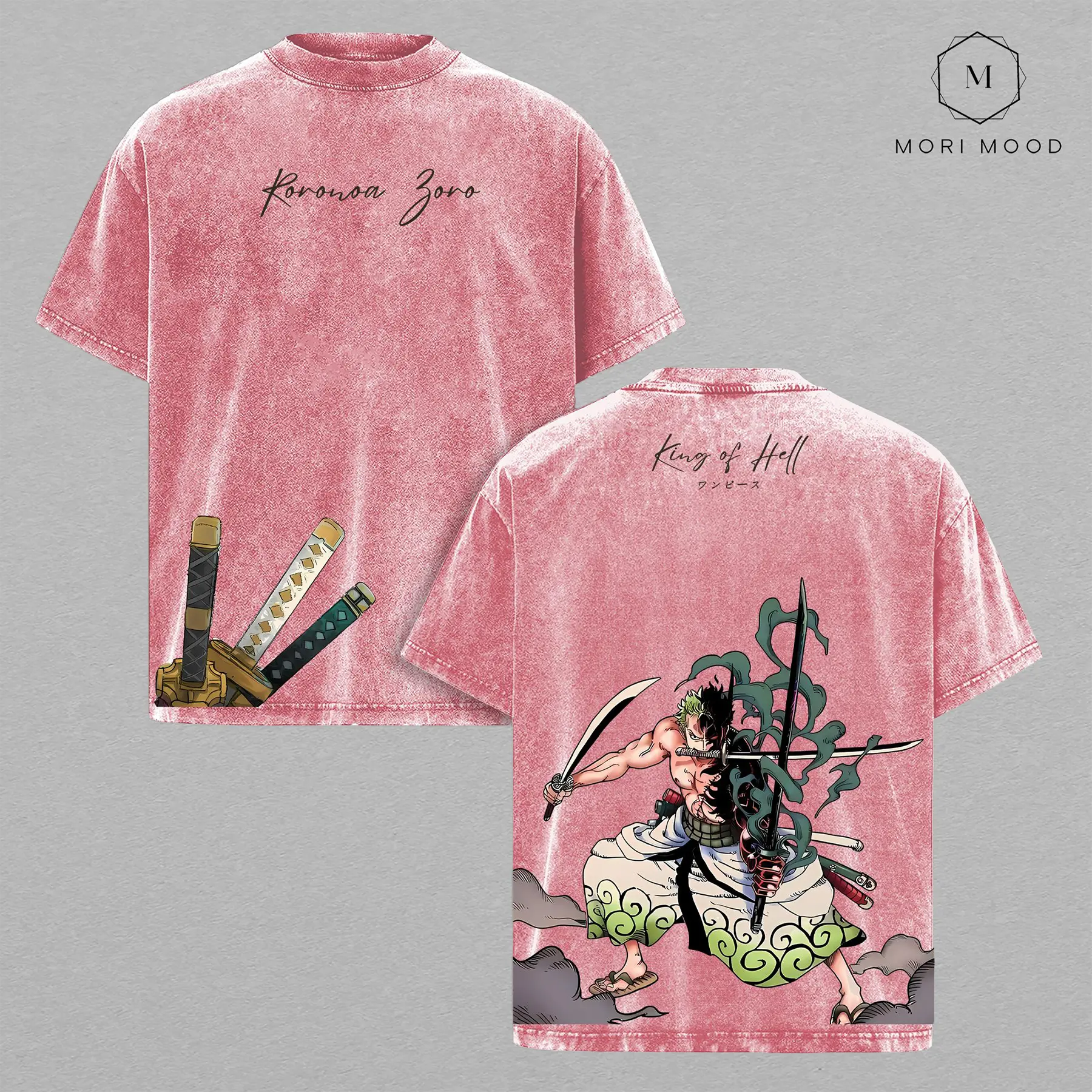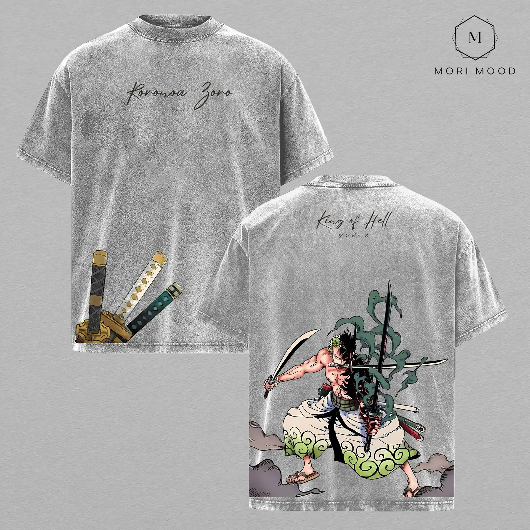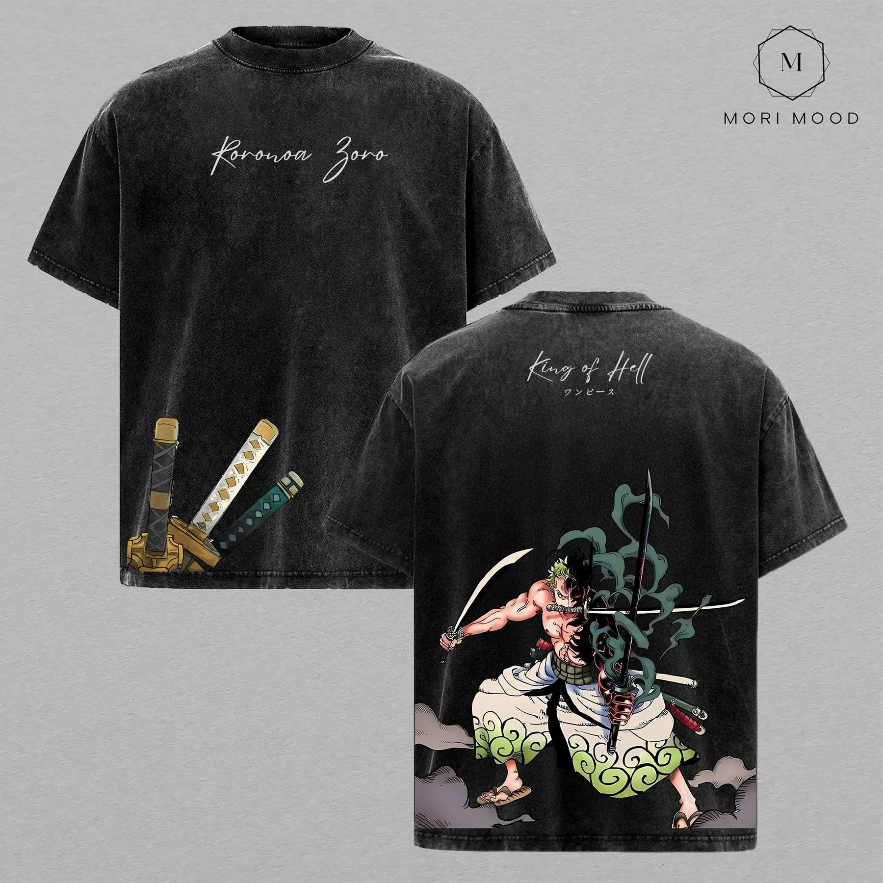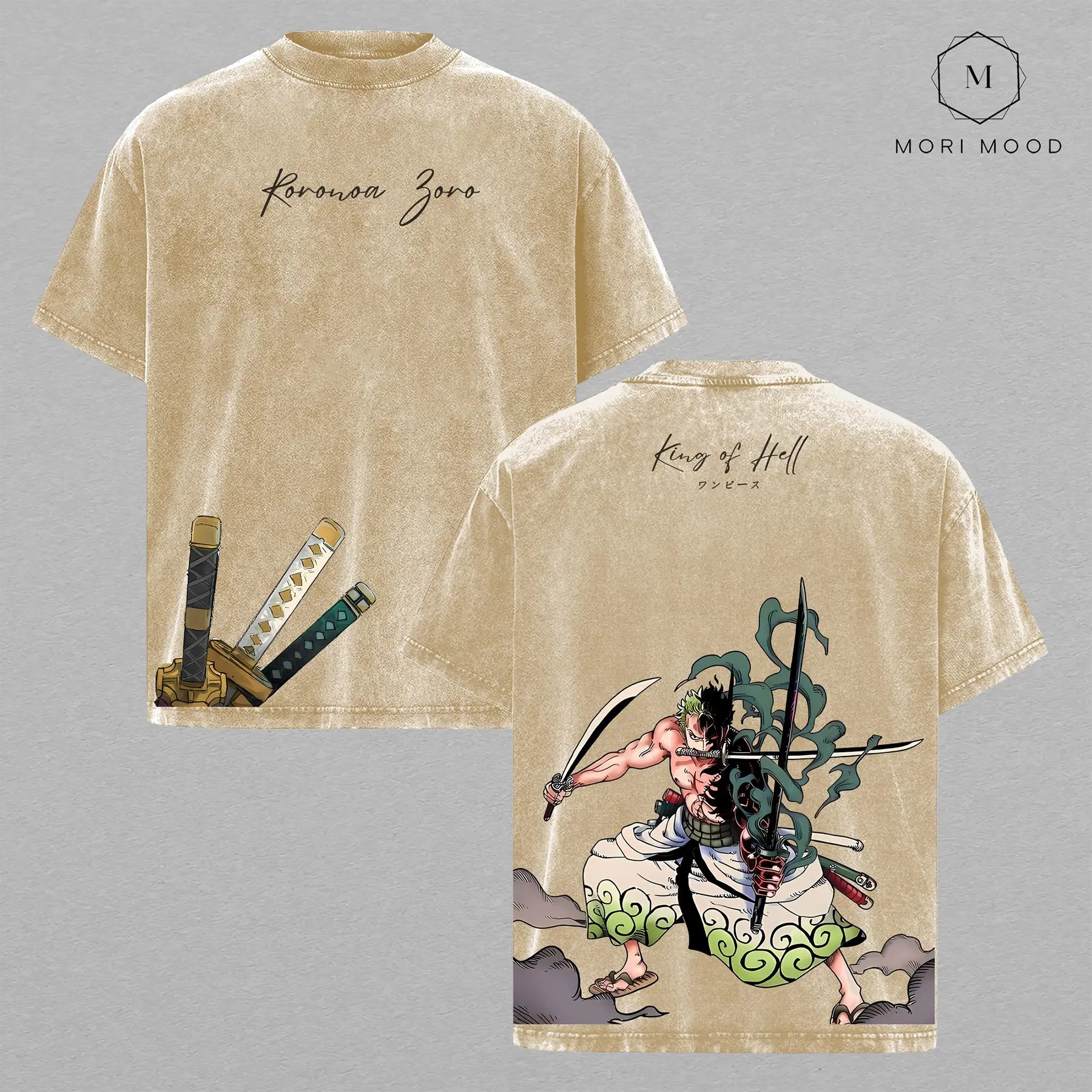 "King Of Hell" Zoro Anime Double Printed Vintage Washed Tee Unisex Oversize Anime Manga Washed Lightweight Cotton T-Shirt, Gift For Anime Fan, Anime Lover