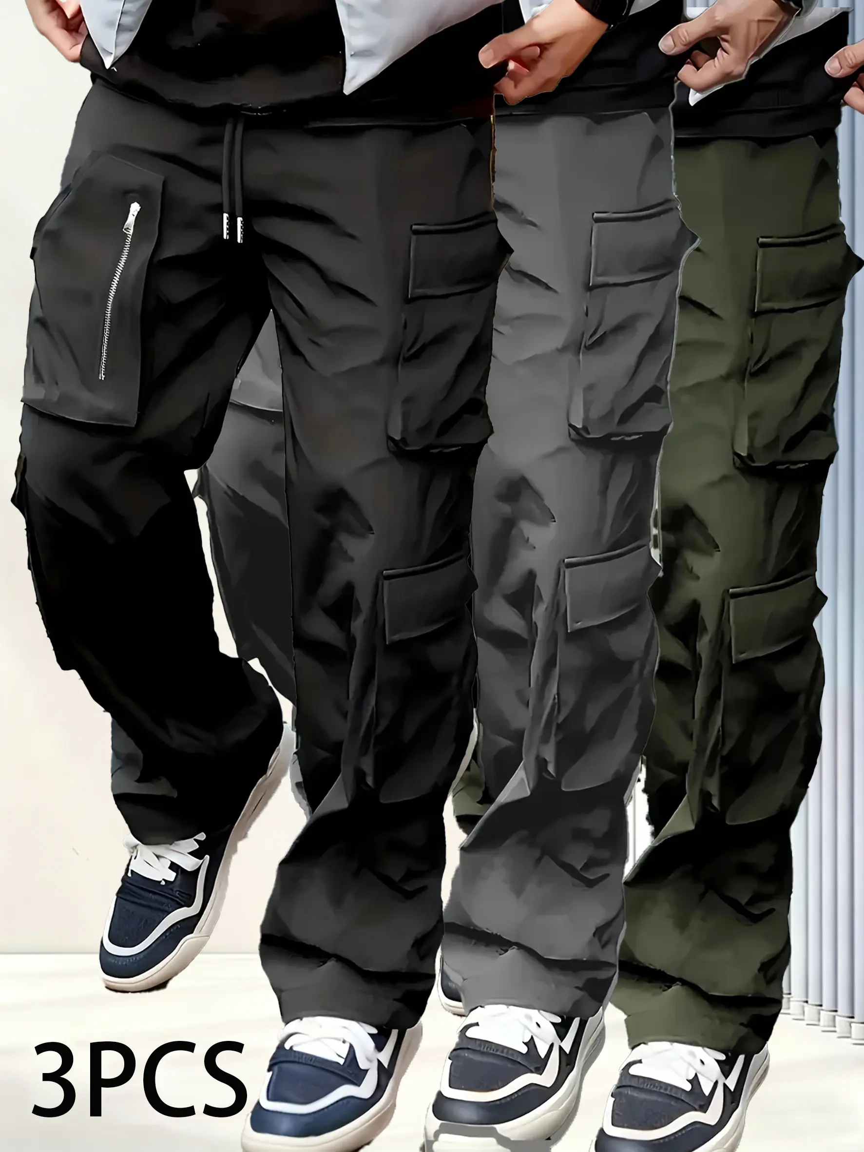 3-Pack Men's Casual Cargo Pants Zipper Detail Multi-Pocket Durable Work Trousers