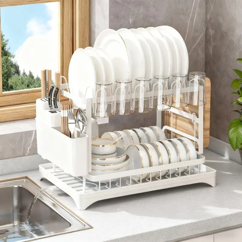 Double drain rack, kitchen countertop dish rack, kitchen accessories with drain tray and cutlery rack