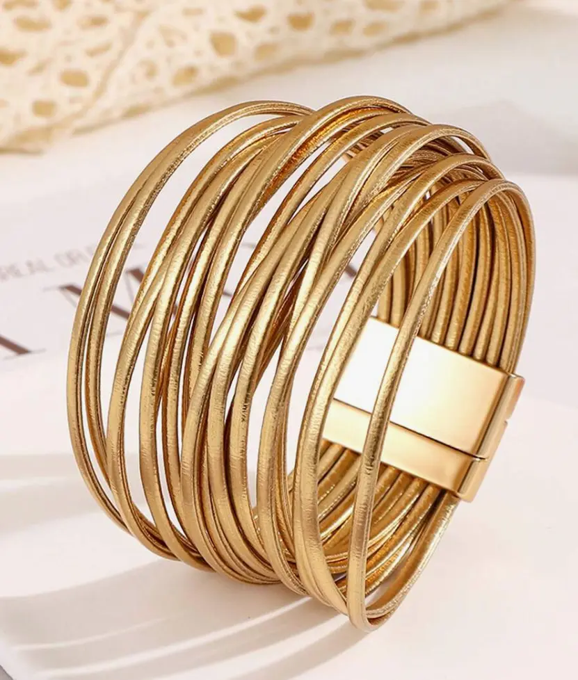 Multi-Layered Structure: The bracelet features multiple intertwined, gradient gold leather strands that create a voluminous, eye-catching silhouette, mimicking the look of stacked bangles in one easy-to-wear piece.