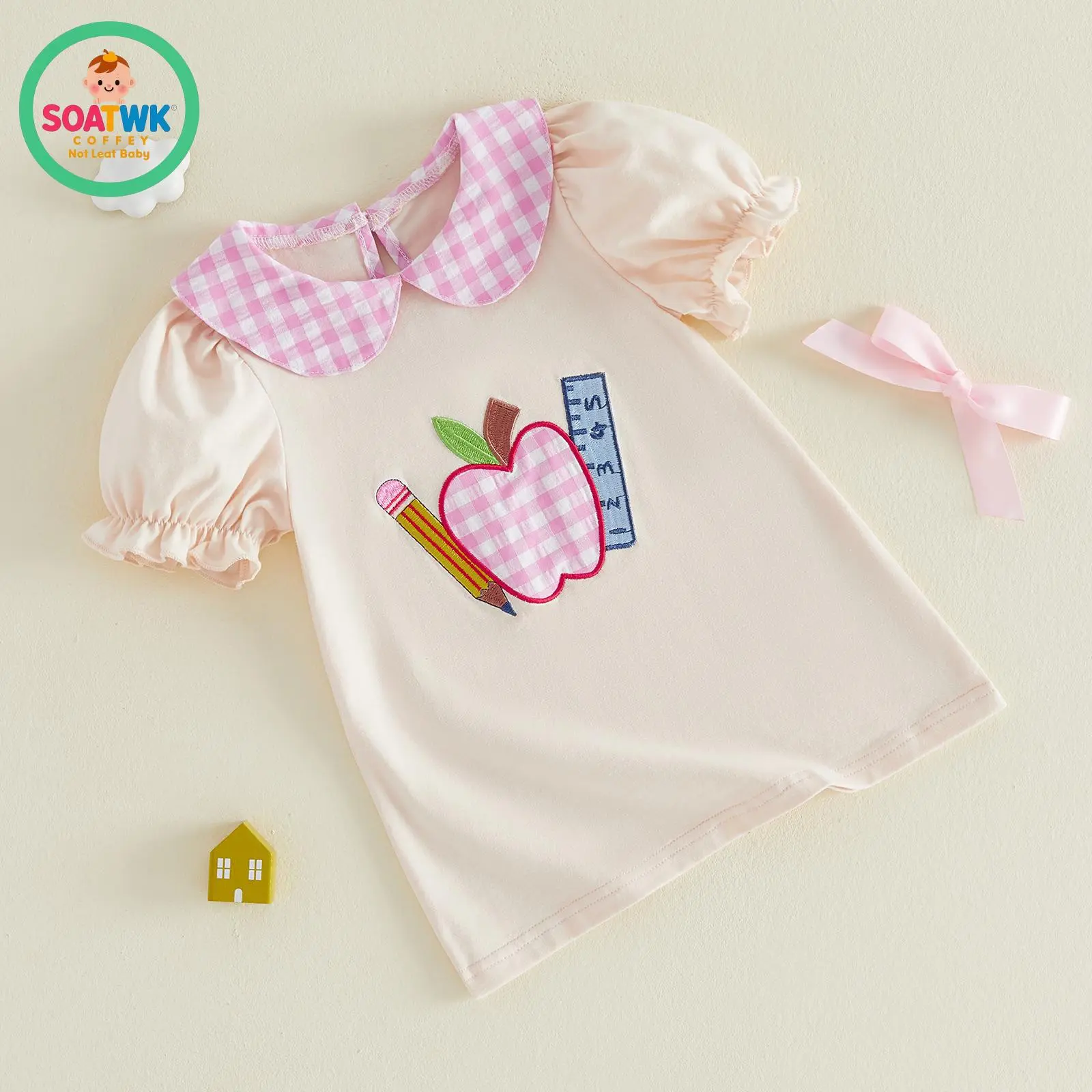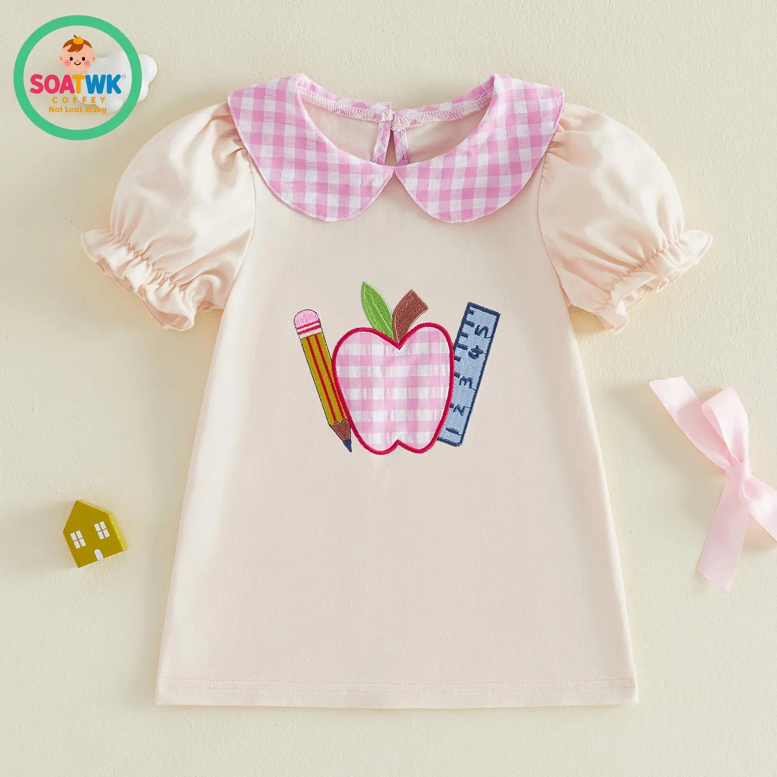 Little Girls Back to School Dress Summer Short Sleeve Plaid Doll Collar Apple Ruler Embroidered Dress