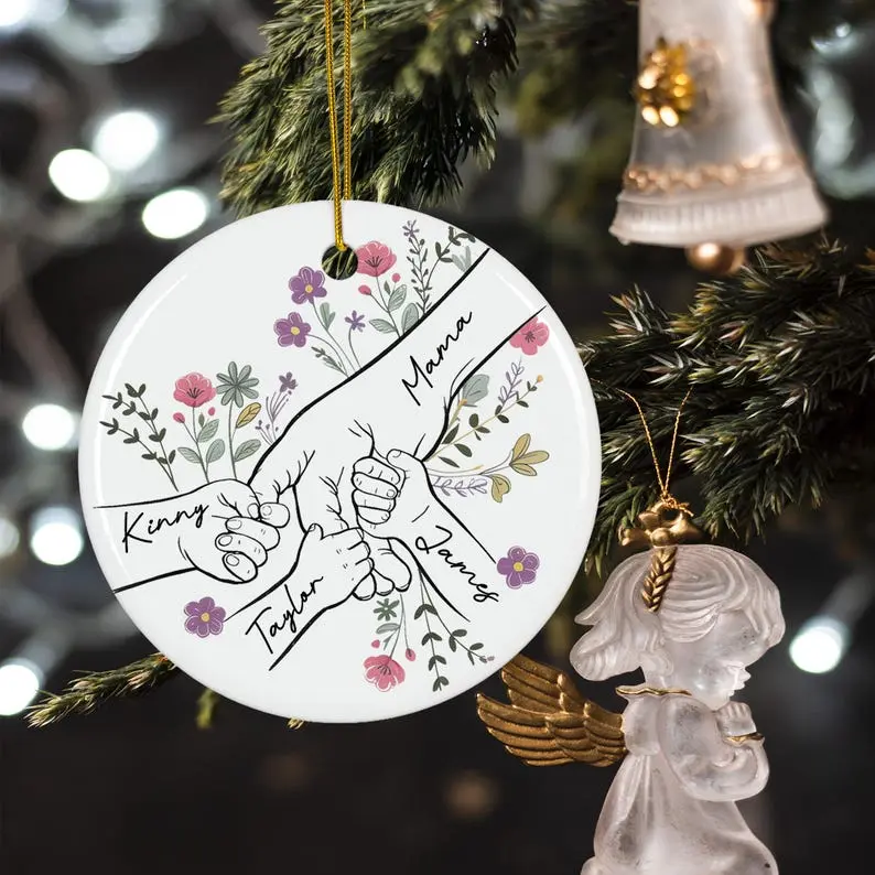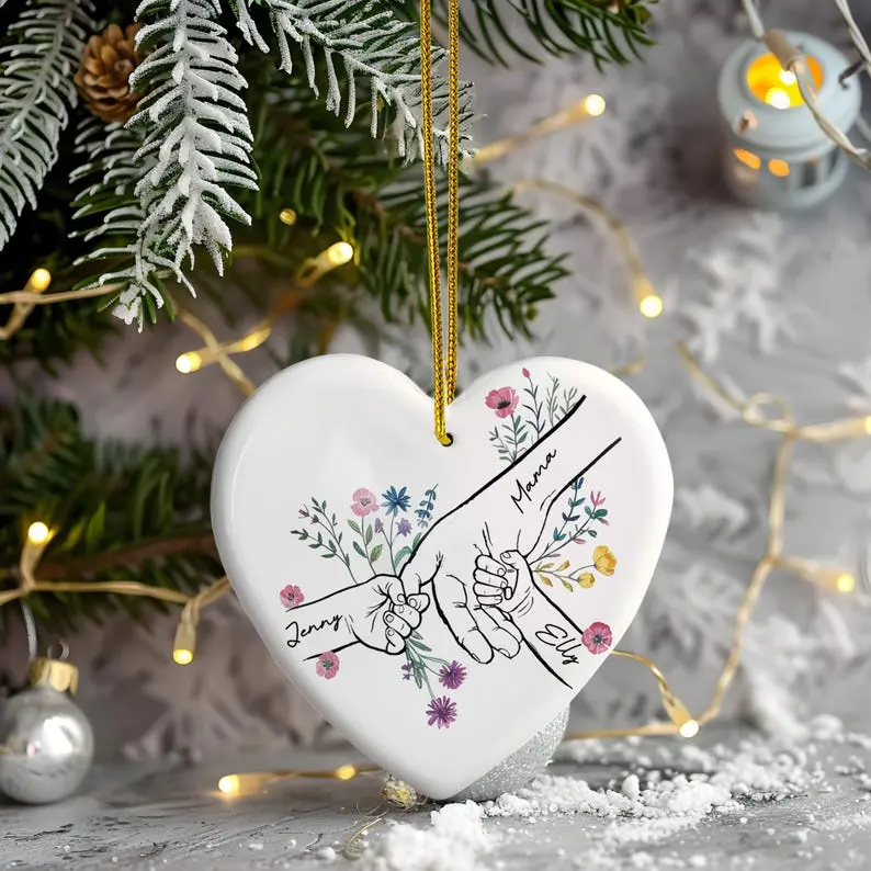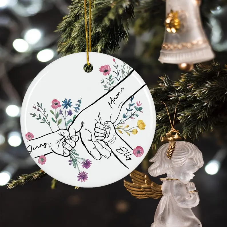 Personalized Ceramic Mommy Ornament, You Hold Hands Also Our Hearts Gift, 3D Style Mother Son Daughter Keepsake