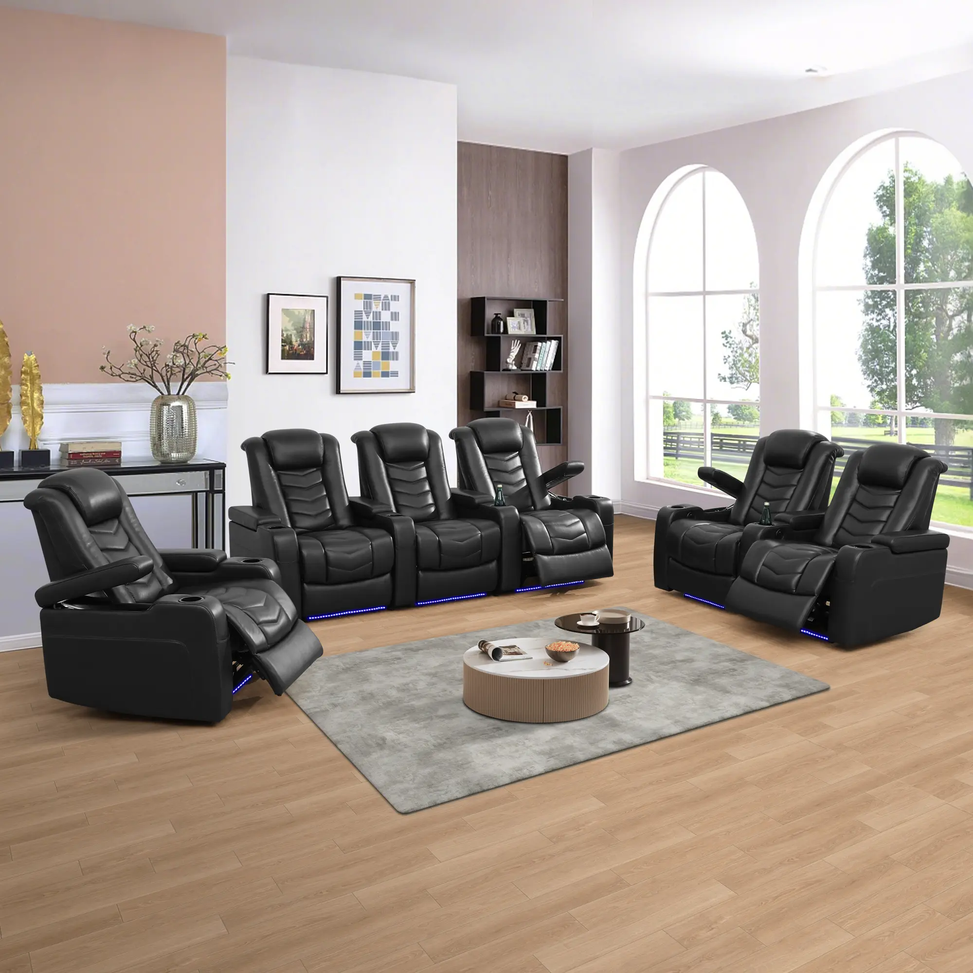 The product (Black) with intelligent functions. The backrest tilts back can reach 110-115° forcomfortable sitting, and also can reach the angle for sleeping. There is a storage bucket under thearmrest for daily using items storage and stainless metal cup-holder for drinks settlement. Controlthe switchgear for adjustable angle in your needs. The bottom of sofa with ambient LED lightingand the whole product with net design, satisfy the visual impact, incredible design makes the lifecolorful