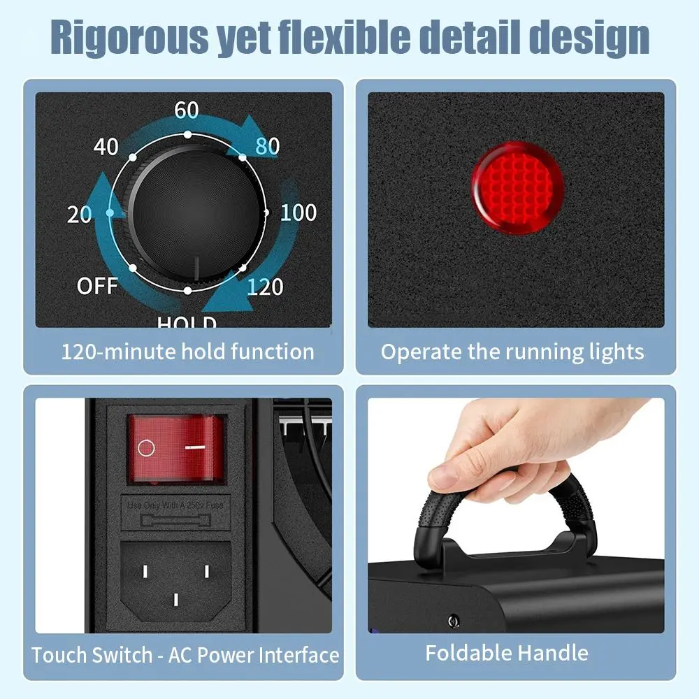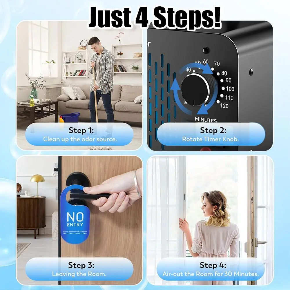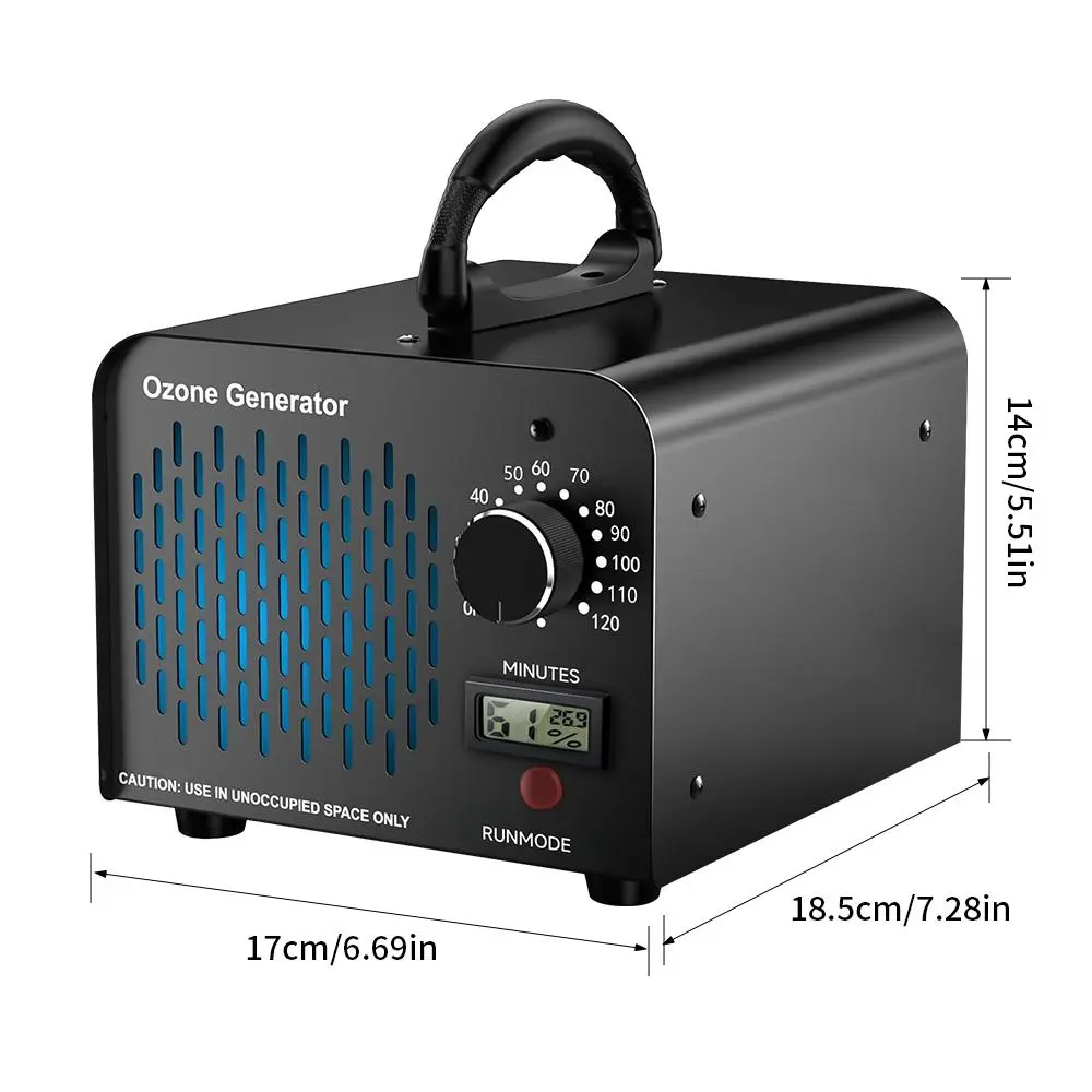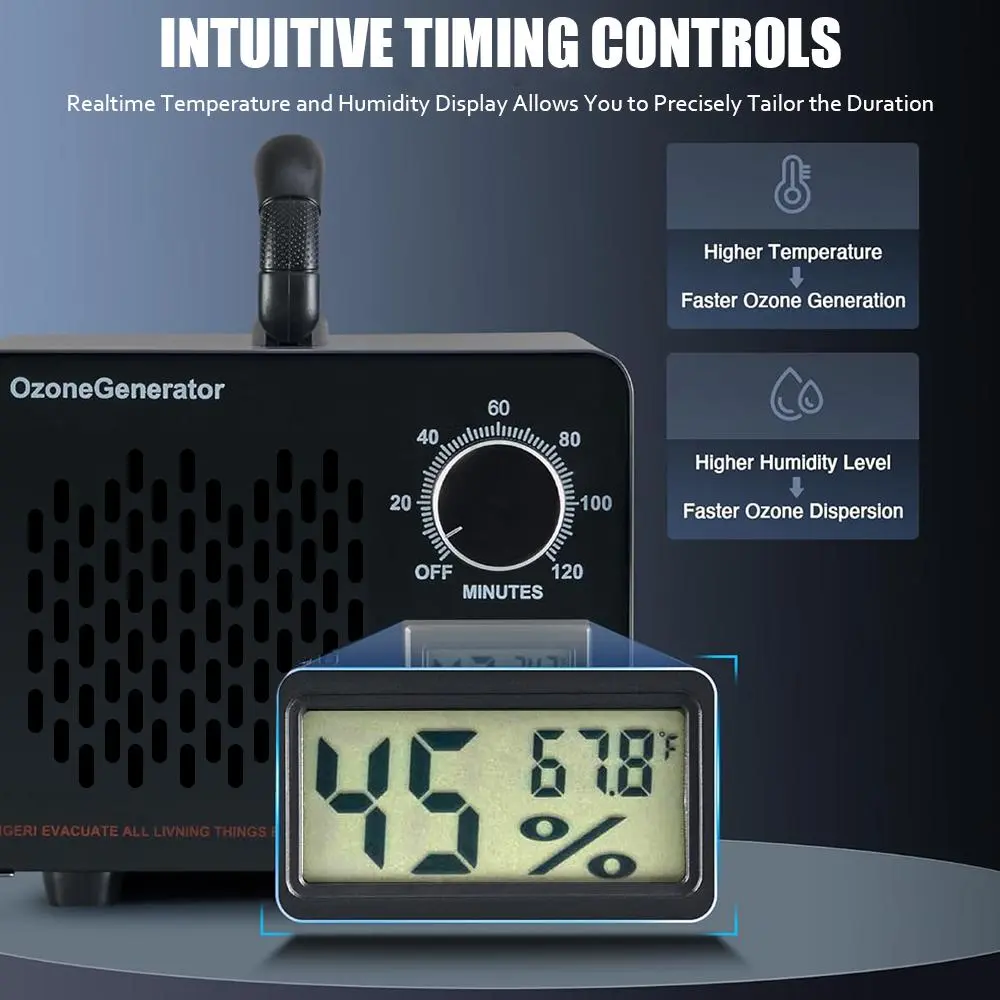 Intelligent Timing Control: This commercial ozone generator machine comes with humidity display and 0-120 minute timer function. You can customize the required operating time for up to 120 minutes, and use the "HOLD" mode to keep it working continuously. The humidity reminder will also prompt you to maintain dry indoor for better odor removal effectiveness.