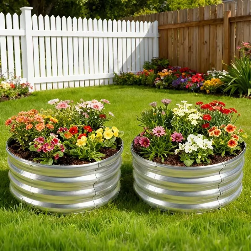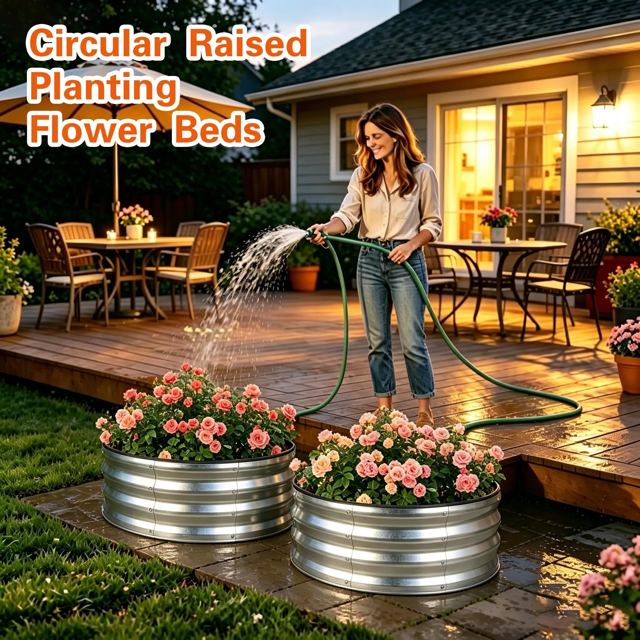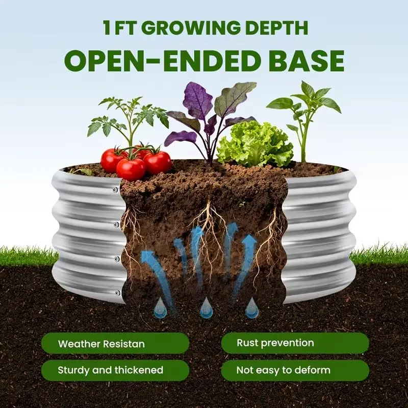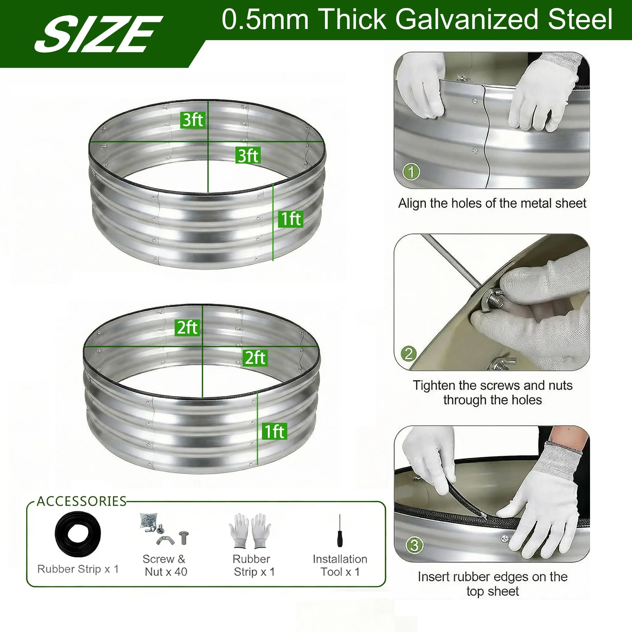 Core Specifications (Clear & Intuitive) - Type: Round Elevated Garden Bed / Galvanized Steel Planter Box - Material: 0.6mm Galvanized Steel (Rust-Resistant, Anti-Aging) - Key Features: Open Bottom, Easy Installation, Elevated Design, Durable, Space-Saving - Size: 2×2×1 Ft (About 60 x 60 x 30.5 cm) - Design: Round Shape, Elevated (No Bending/Kneeling), Open Bottom - Planting Scope: Vegetables, Fruits, Flowers, Herbs & Other Plants - Applicable Scenarios: Outdoor Gardens, Patios, Courtyards, Balconies - Advantages: Low Maintenance, Root Protection, Ample Space, Aesthetic Enhancement