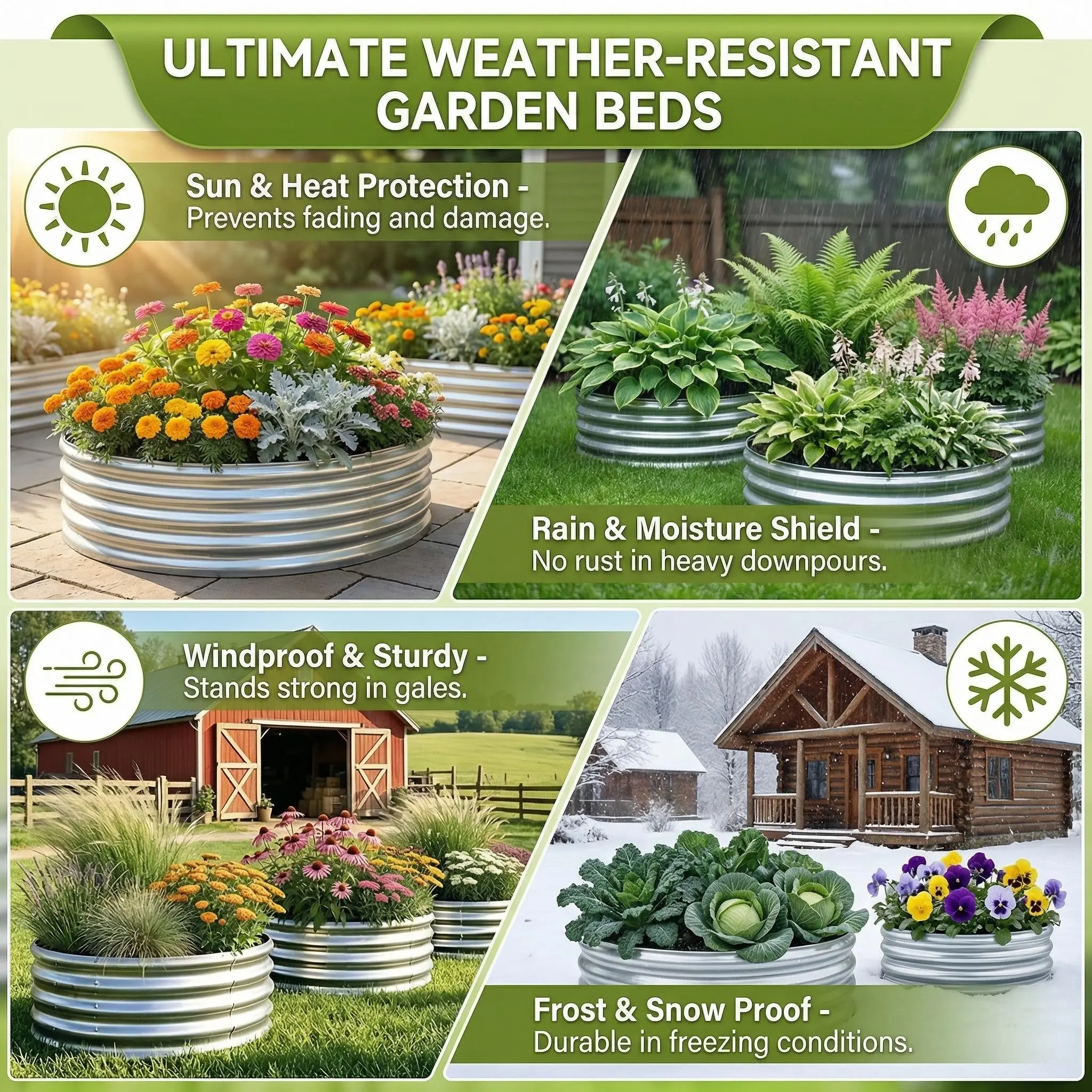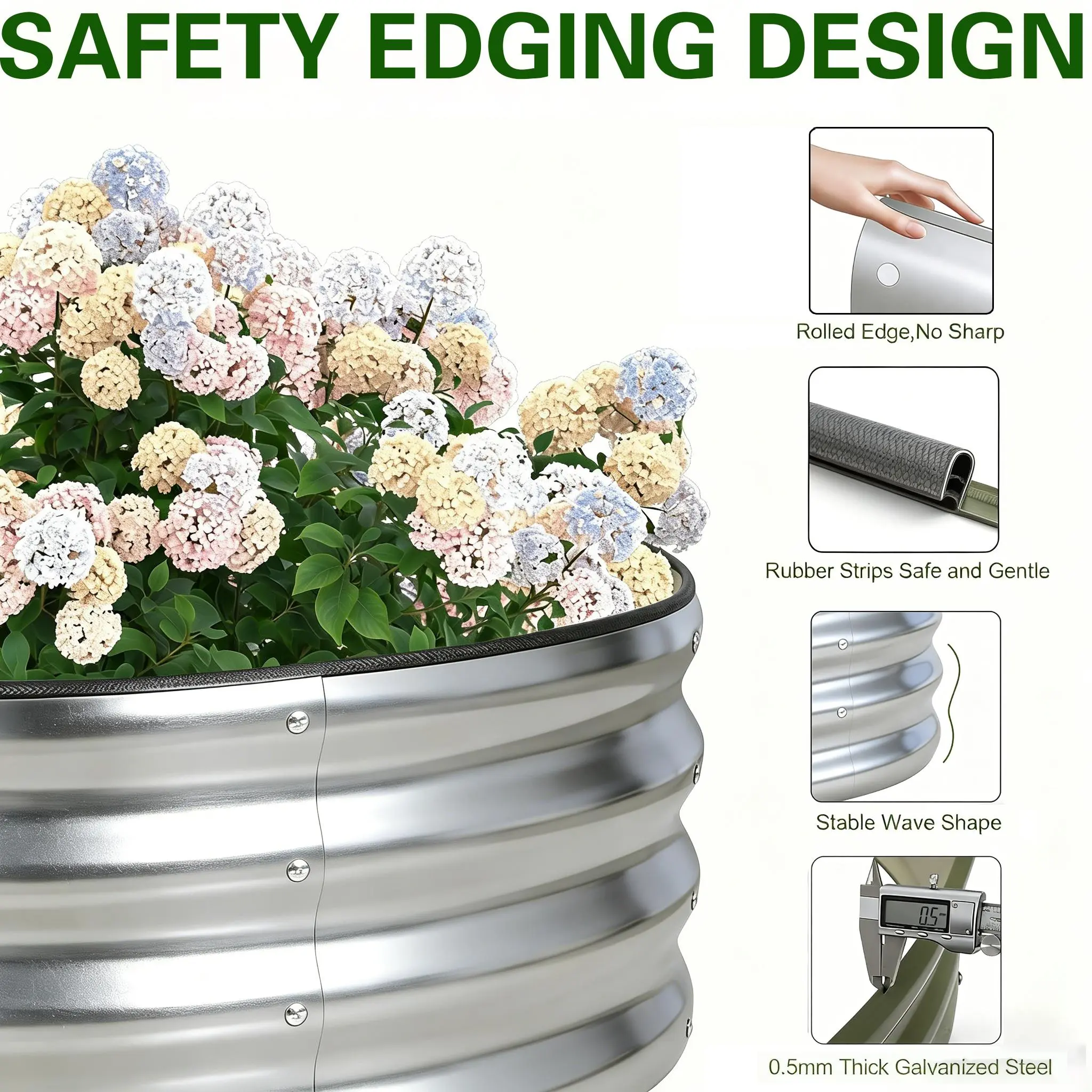 High-Quality Galvanized Steel, Durable & Rust-Resistant This round planter is made of 0.6mm galvanized steel, featuring a durable design that can withstand various outdoor climates. The hot-dip galvanized layer effectively isolates the steel from air and moisture, preventing rust and aging, ensuring long-term outdoor use and low maintenance costs. The convenient elevated design makes gardening much easier—no more bending or kneeling!