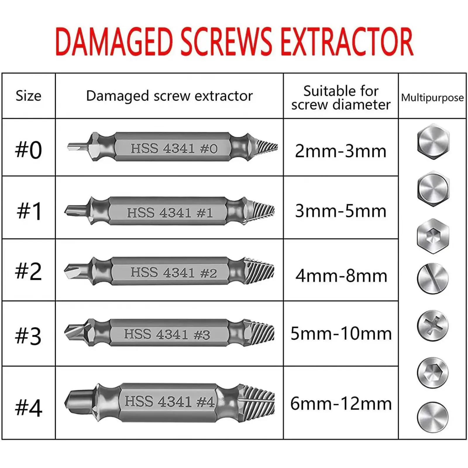 Extractor kit meets the needs of different screws and bolt sizes.