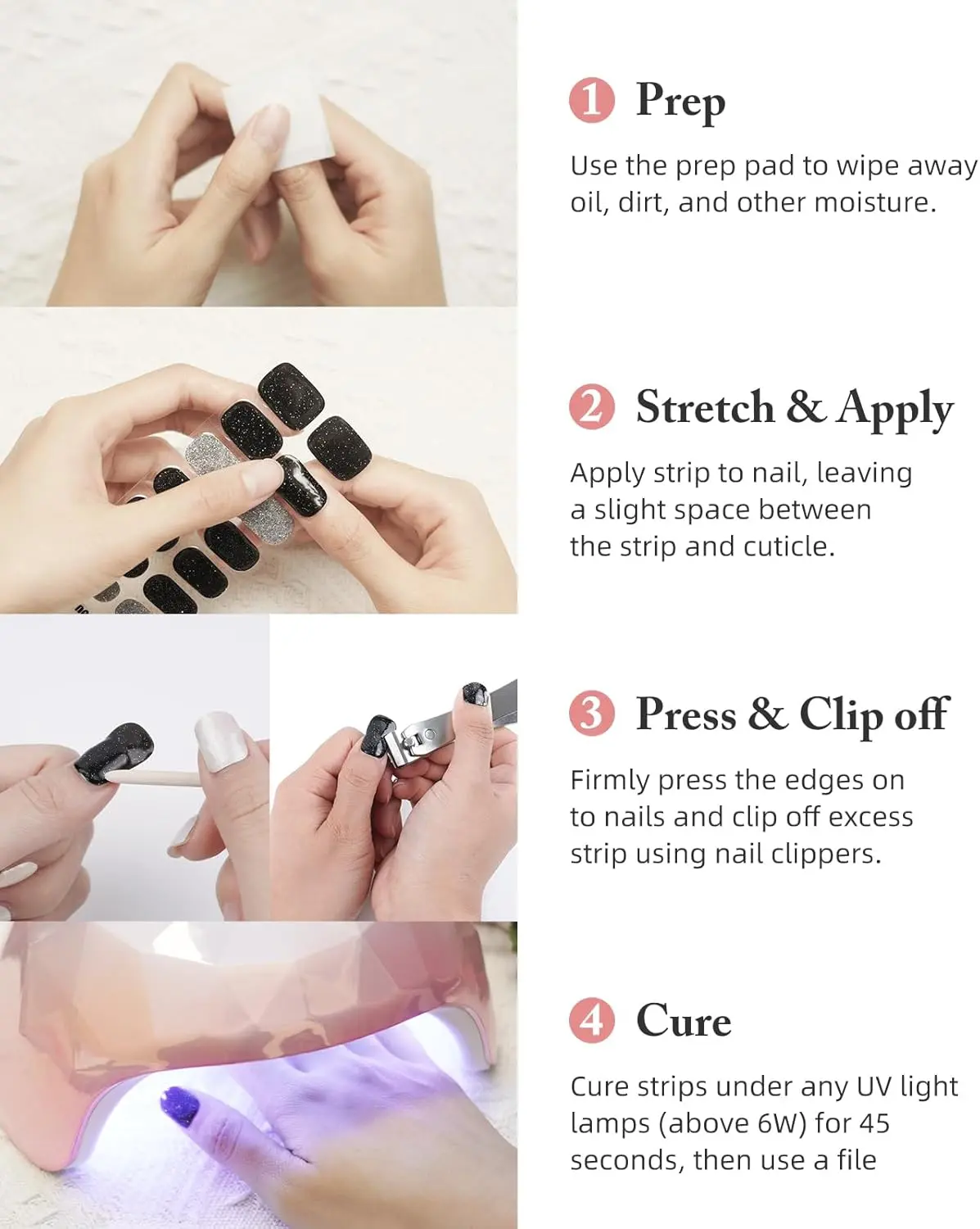 ·14 Days Long Lasting: UV gel nail stickers are suitable for use with any UV nail lamp (Not Included). Shine UV Nail Lamp for 60 seconds 2-3 times, cool for 30 minutes to allow the nail strips to fully cure. Get a stylish manicure done at home