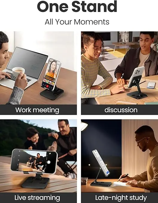 ·Ultra-Portable Collapsible Phone Stand:Fully Collapsible to Palm-Size (Only 5×3.2×0.8in) – easily slips into your pocket, backpack or purse for on-the-go use.