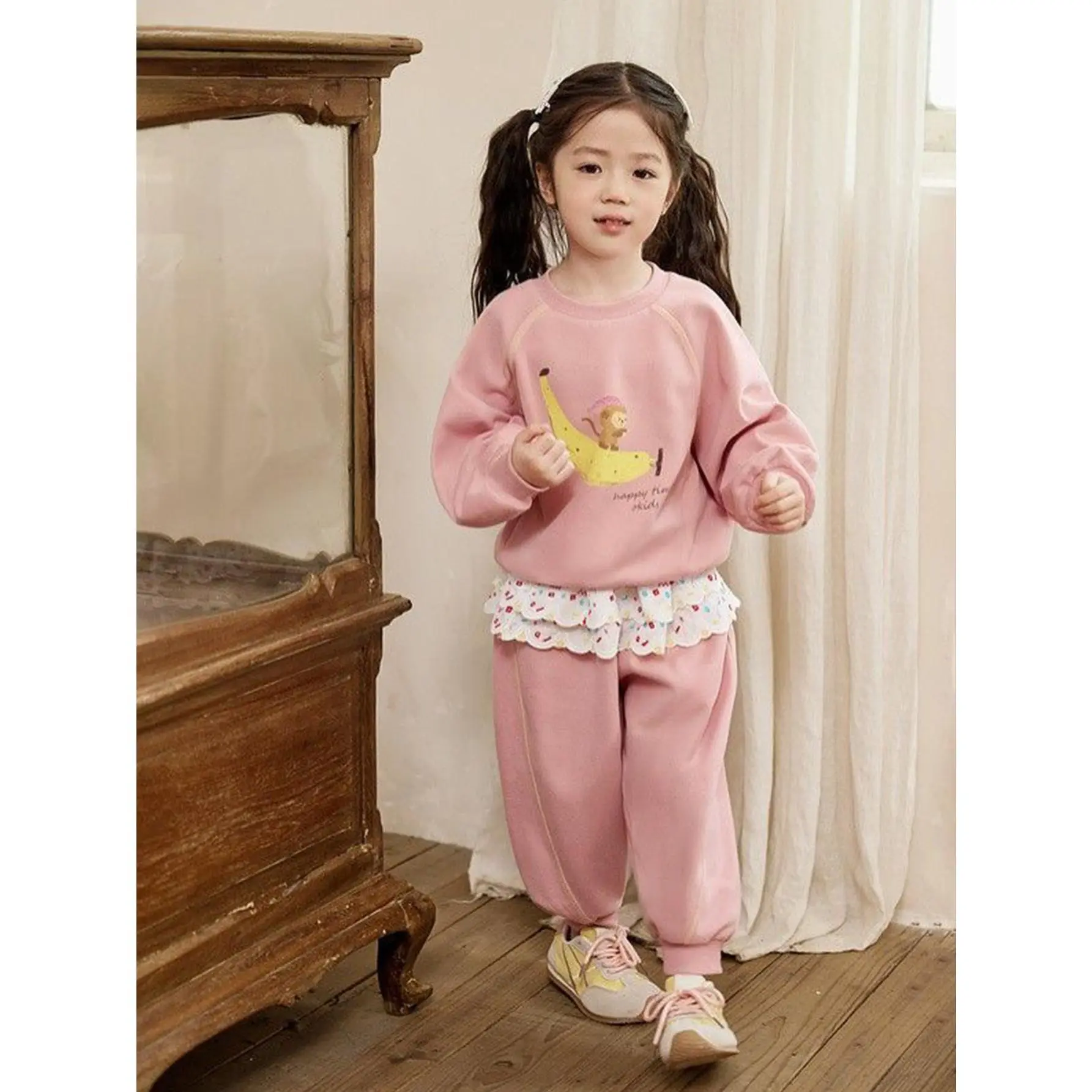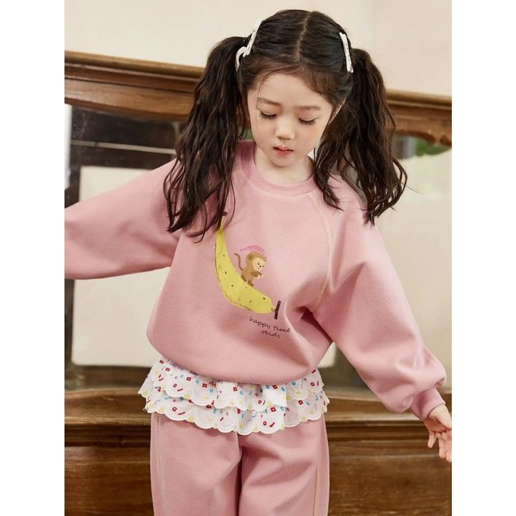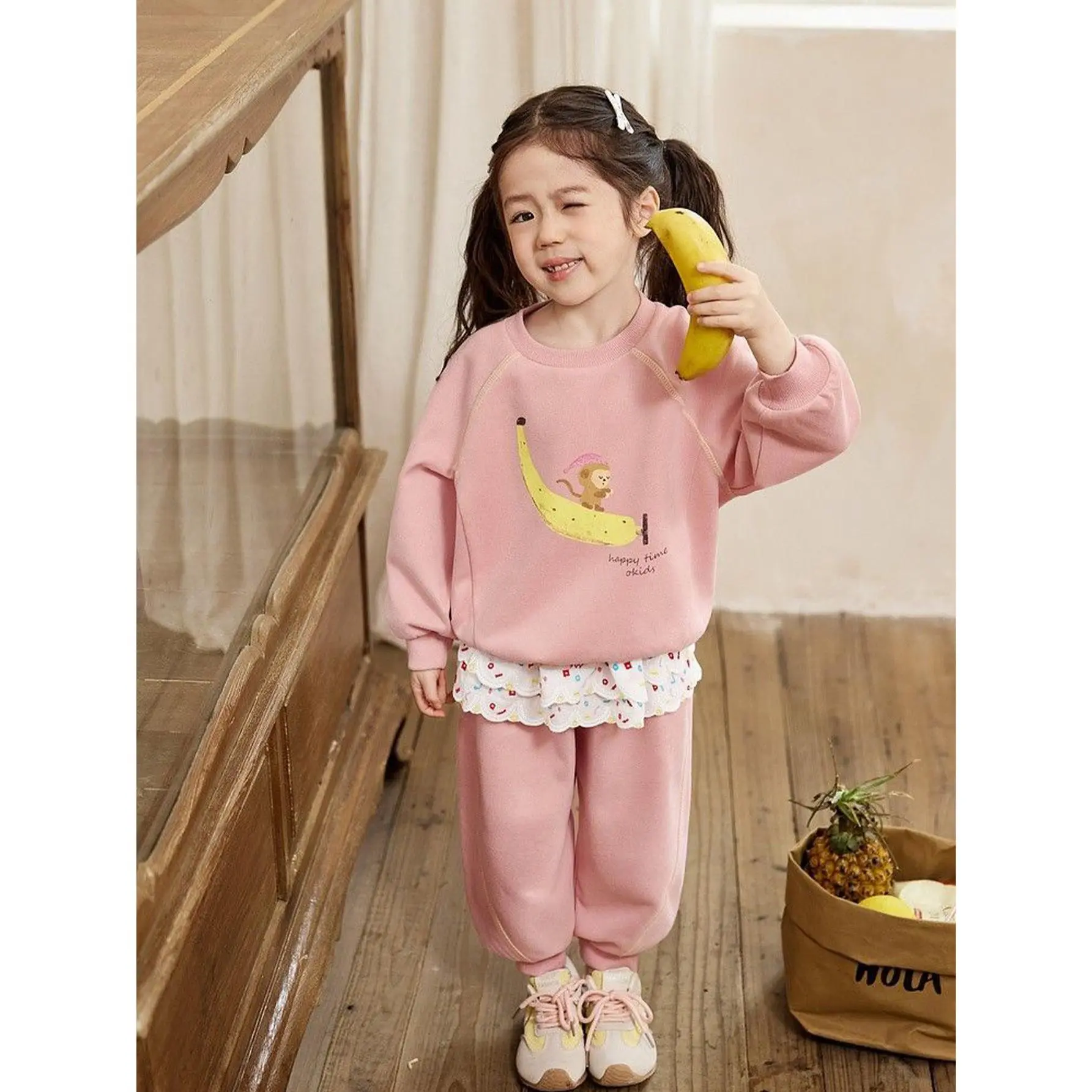 (New)Girls' Spring And Autumn Pink Cartoon Monkey Banana Hoodie Set, Two Piece Set, Cute Lace Leg Tights, for Outdoor