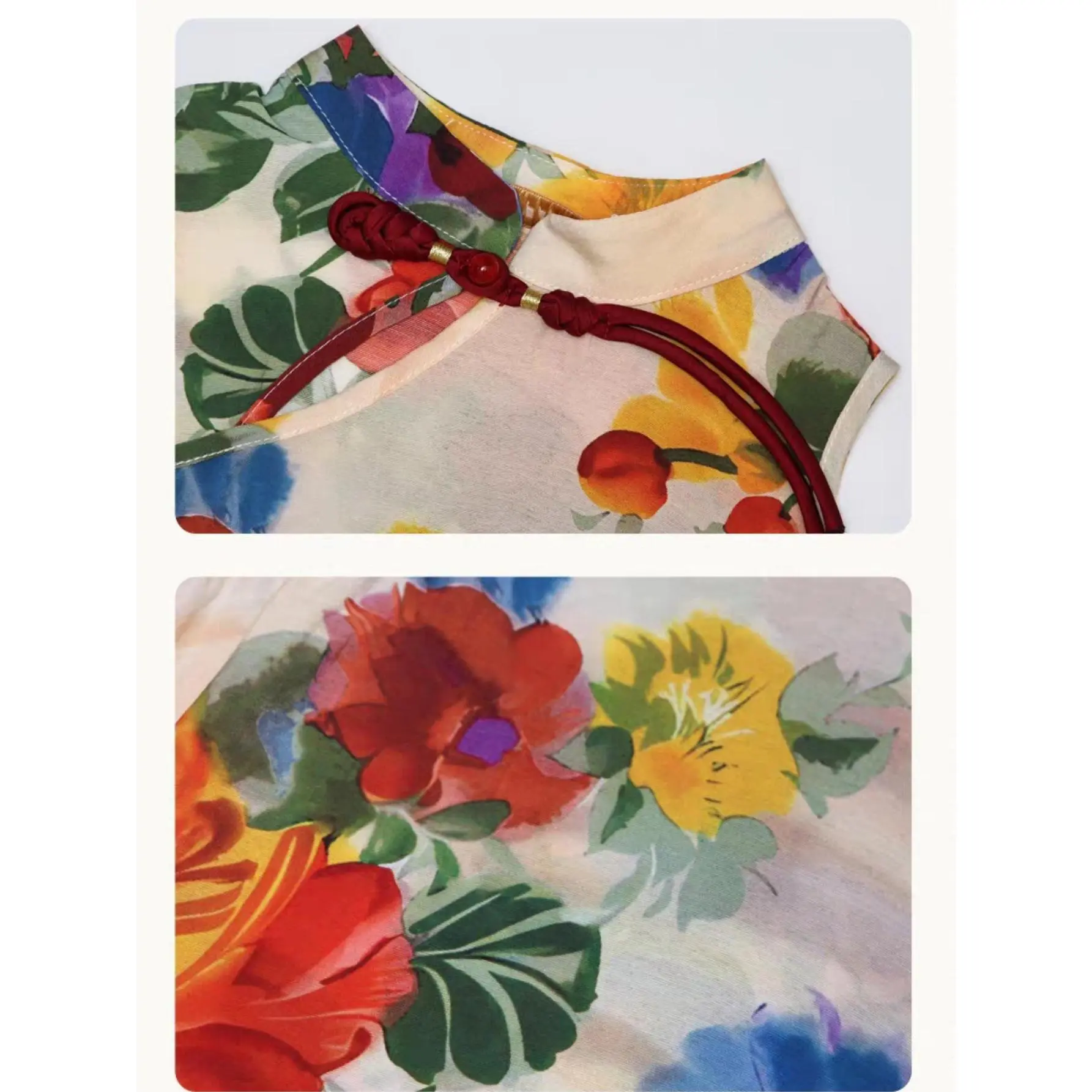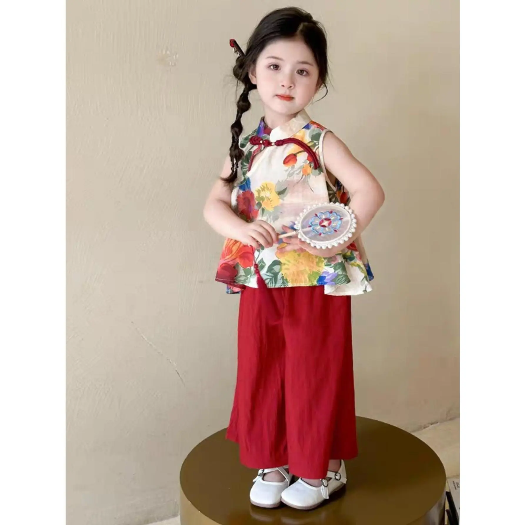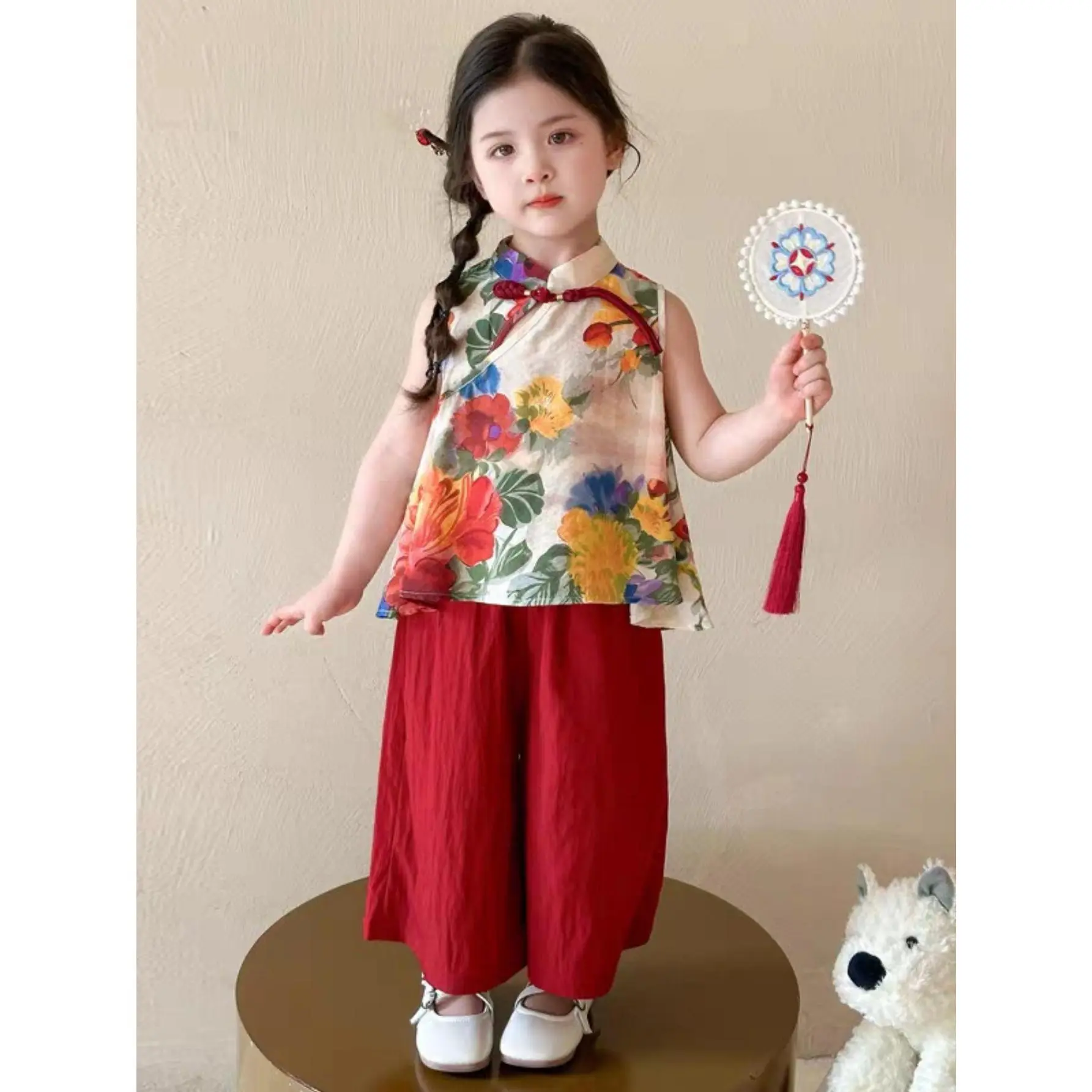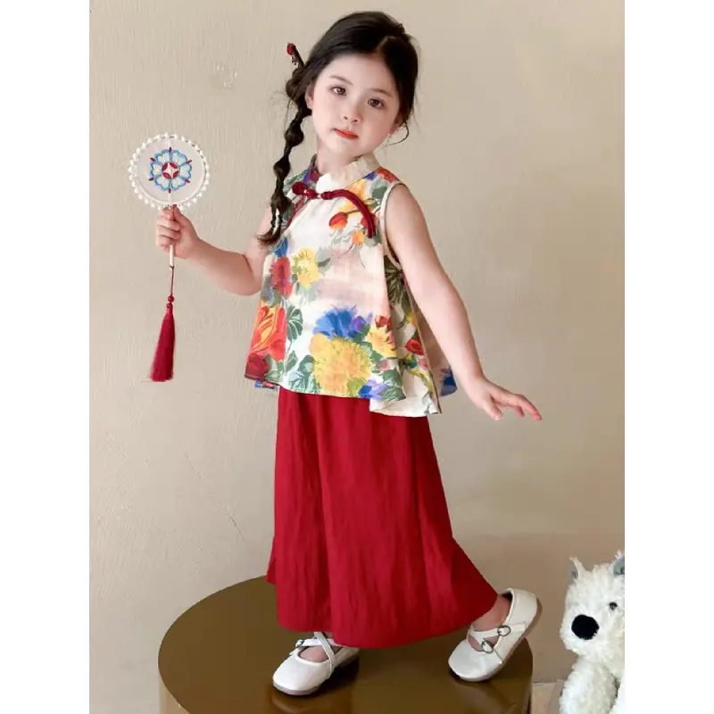 (New)A Two-Piece Outfit for Girls Featuring a New Chinese Style with a Hanfu And Qipao Set, Perfect for Summer. This Includes a Floral Vest Top with Traditional Buttons And Solid Color Casual Pants, for Outdoor