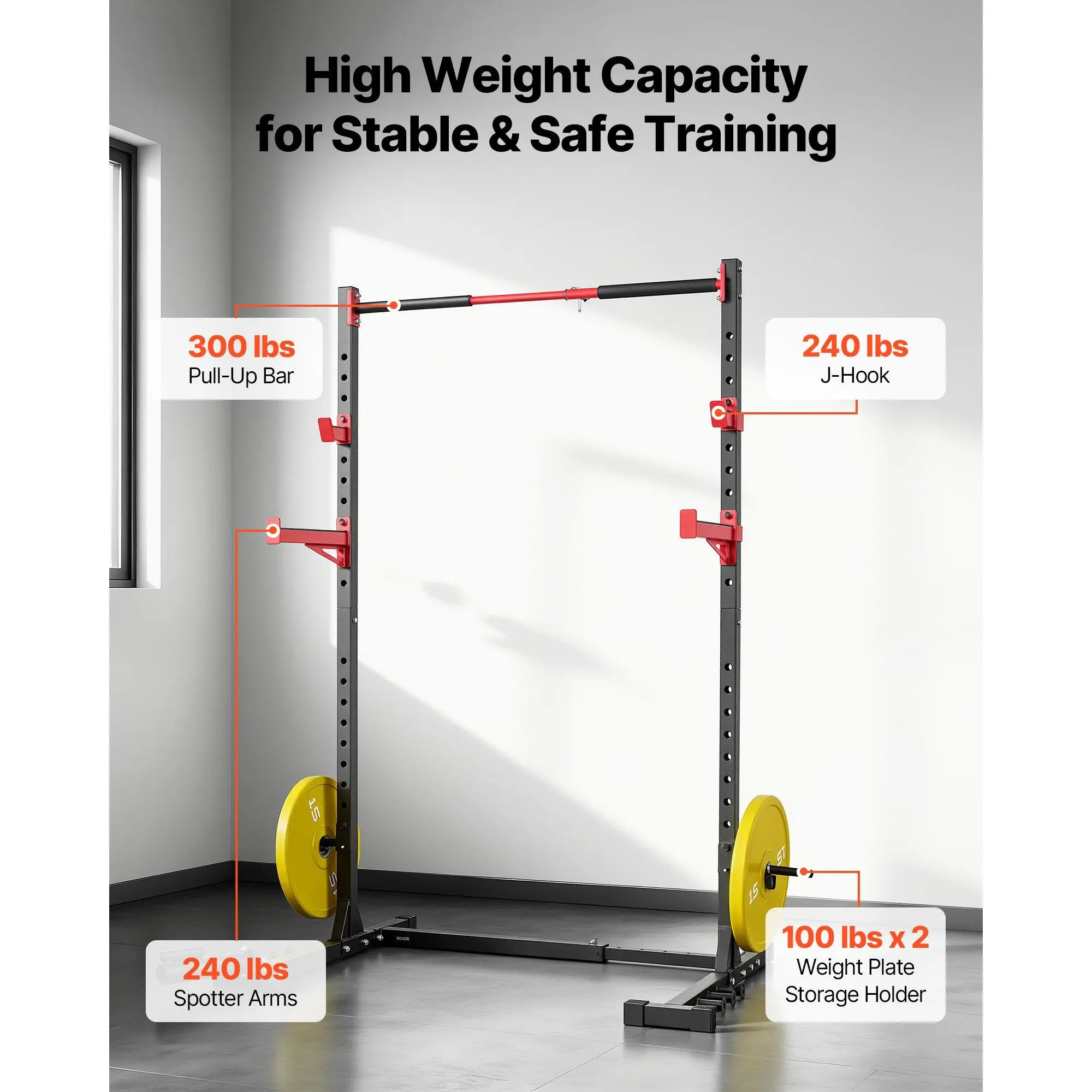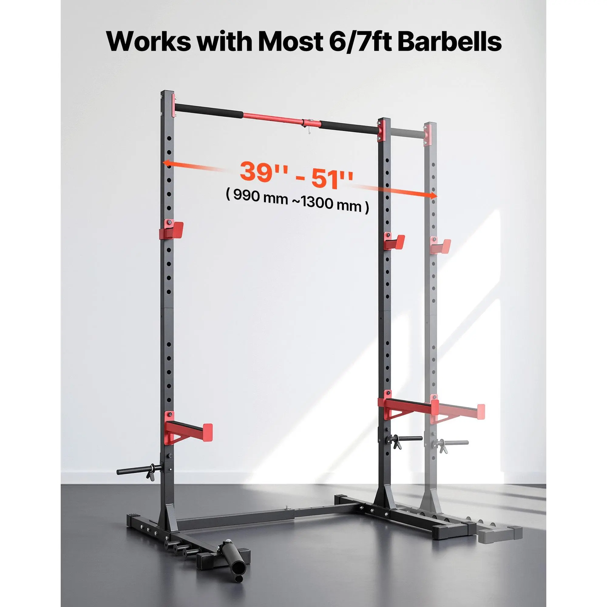 Multifunctional Home Gym: Enjoy full-body strength training at home with VEVOR multi-functional power cage squat rack.It supports barbell squats, bench presses, pull-ups, landmine row and more training exercises, helping you train more effectively, confidently, and safely (Weight Plates NOT Included)Fully Equipped & Versatile: This power rack for home gym comes with a set of training attachments to expand your workouts.It includes 2 * 1-inch weight plate storage holders (with clamps), 2 J-hooks, 1 pull-up handle with padded foam, 2 safety bars, 6 band pegs, and a landmine attachmentAdjustable Height & Width: Our workout strength training equipment features 22 adjustment holes for the J-hooks and safety bars, along with 5-level width settings (58.2–62.3 inch) to meet different users' diverse training needs, improving training comfort, stability, and efficiencySturdy and Stable: Constructed from powder-coated carbon steel with a reinforced 2" x 2" main frame, this weight lifting workout cage delivers high stability and 980 pounds total weight support for safer, more confident strength training - no deformation, no wobblingSpace-Saving: Covering only 20.1 sq.ft., this bench press power cage occupies minimal space while supporting a full range of exercises.Multi-functional home exercise equipment helps boost body strength, builds core muscle, and improves overall physical healthVEVOR Power Cage Rack, Multifunctional Squat Rack for Home Gym, Width-Adjustable Workout Strength Training Equipment with 6 Band Pegs, Landmine Attachment & Safety Bars for Bench Press Squats Pull-Up