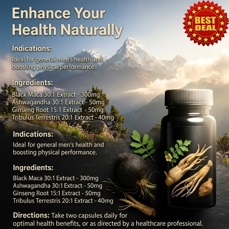 Take two capsules daily for enhanced energy, mental clarity, and physical stamina. Ideal for active lifestyles and daily health regimes. Boost your wellness with proven herbal ingredients. Indications: General men's health and physical performance. Black Maca 30:1 Extract - 300mg, Ashwagandha 30:1 Extract - 50mg, Ginseng Root 15:1 Extract - 50mg, Tribulus Terrestris 20:1 Extract - 40mg. Directions: Take two capsules daily or as directed by a healthcare professional.