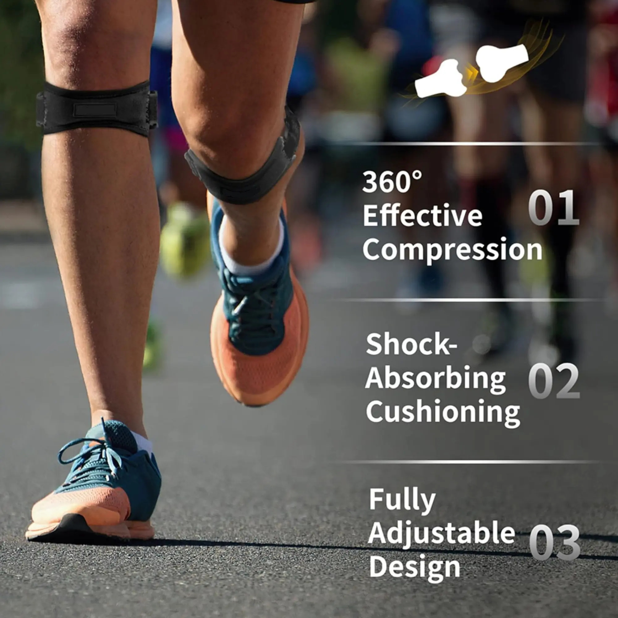 ·A built-in silicone compression pad delivers consistent pressure to absorb impact and reduce stress on the patellar tendon during activities such as volleyball, running, jumping, squats, and stair climbing.