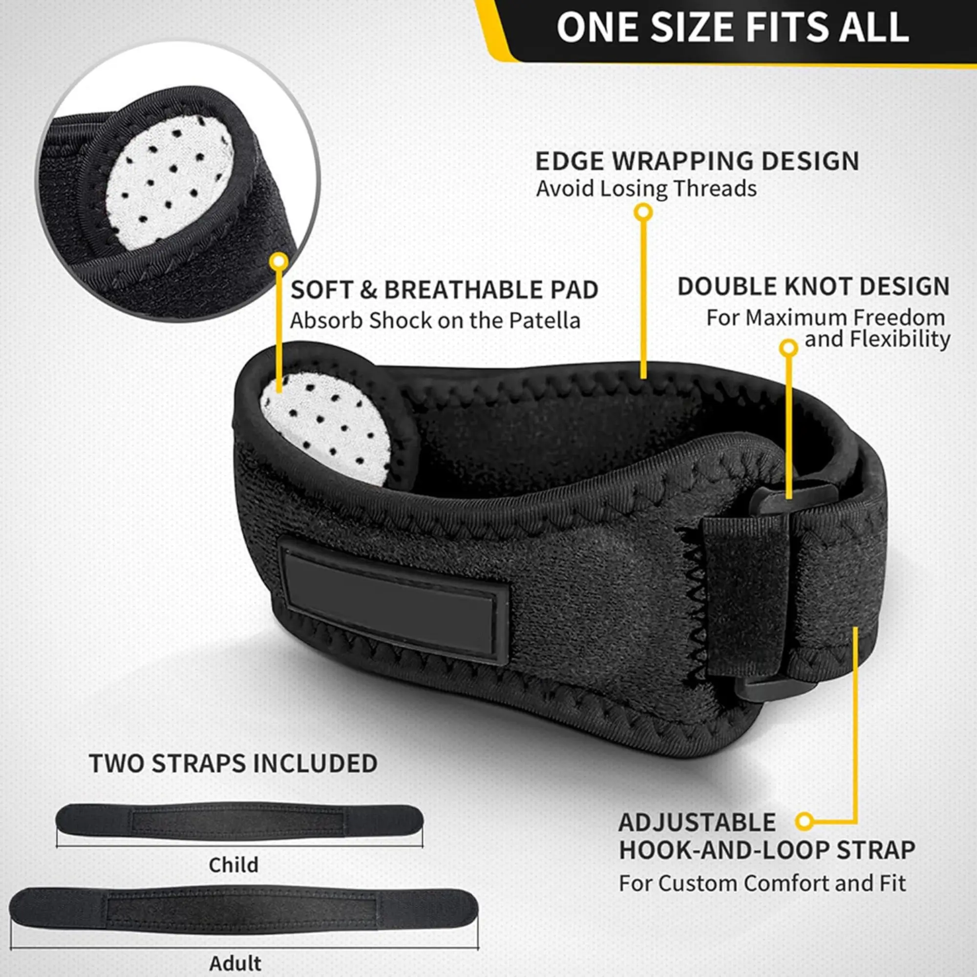·Included are extra interchangeable straps in different lengths, so users can customize the fit and compression level based on their leg size or activity intensity, adding flexibility beyond standard patella straps.