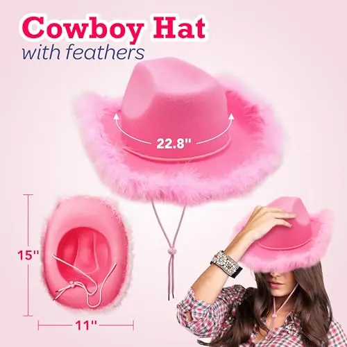 BOLD LOOK, ULTIMATE COMFORT: This pink feather cowgirl hat adult size combines style and comfort with a felt design that boasts a 22.8" inner circumference, perfect for most adults. Measuring 11" wide and 15" long, this pink cowboy hat for women comes complete with a chin strap, ensuring a snug fit for wild rides, parties, and fun adventures. The cowboy hat with feathers brings out the best in any cowgirl hat collection!