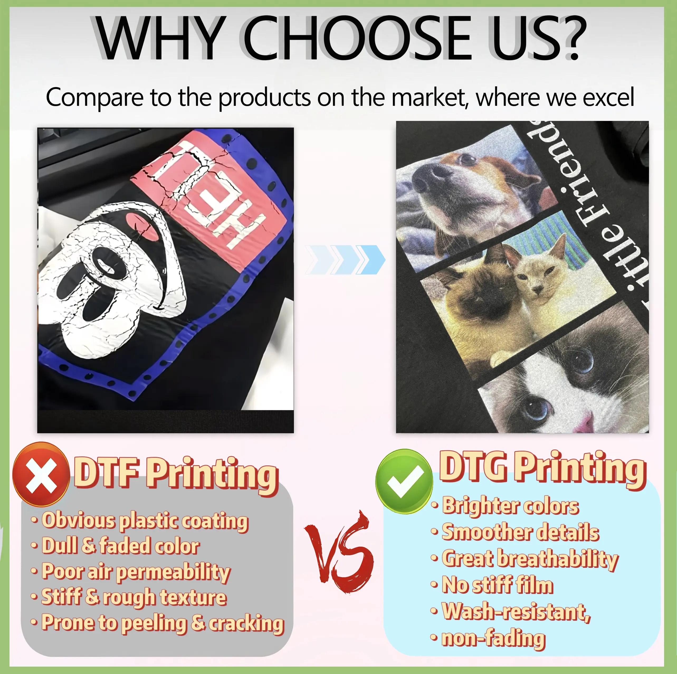 ·We specialize in premium POD tees with years of DTG printing expertise. Our strict control over print precision and ink quality ensures no compromises. Your designs will look stunning and feel amazing.