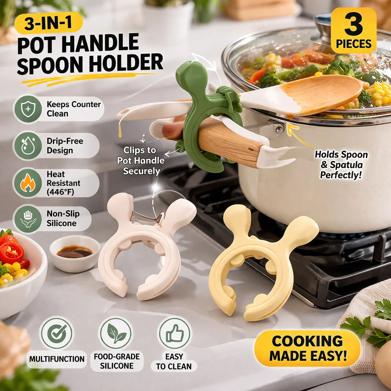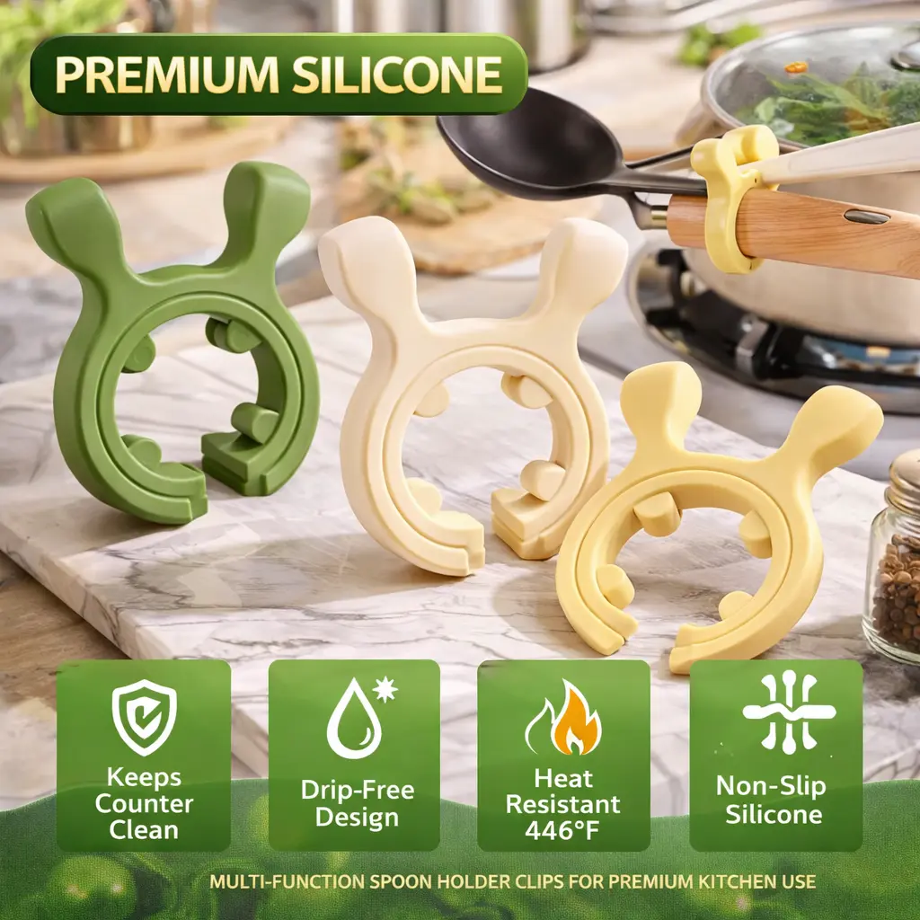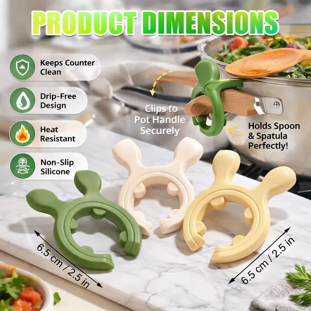 Make cooking easier, cleaner, and more convenient with this 3-Pack Multifunction Silicone Pot Handle Spoon Holder. Designed to clip securely onto pot handles or cookware edges, this innovative kitchen tool keeps your spatulas, ladles, and spoons in place while preventing spills and countertop mess.