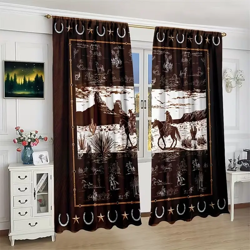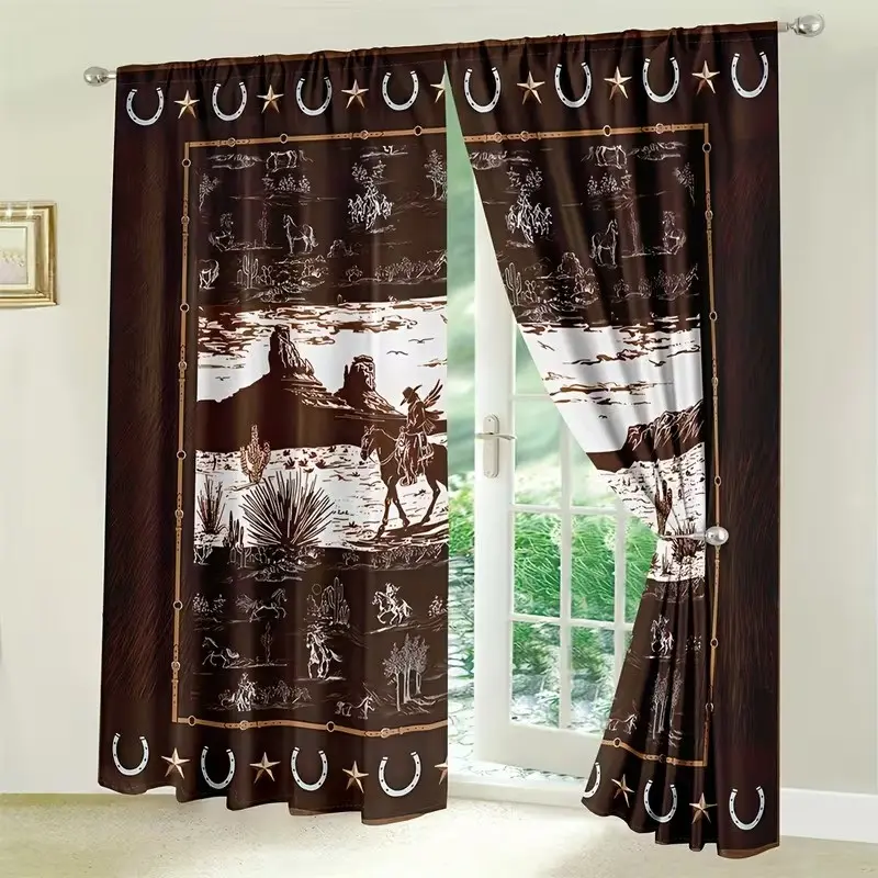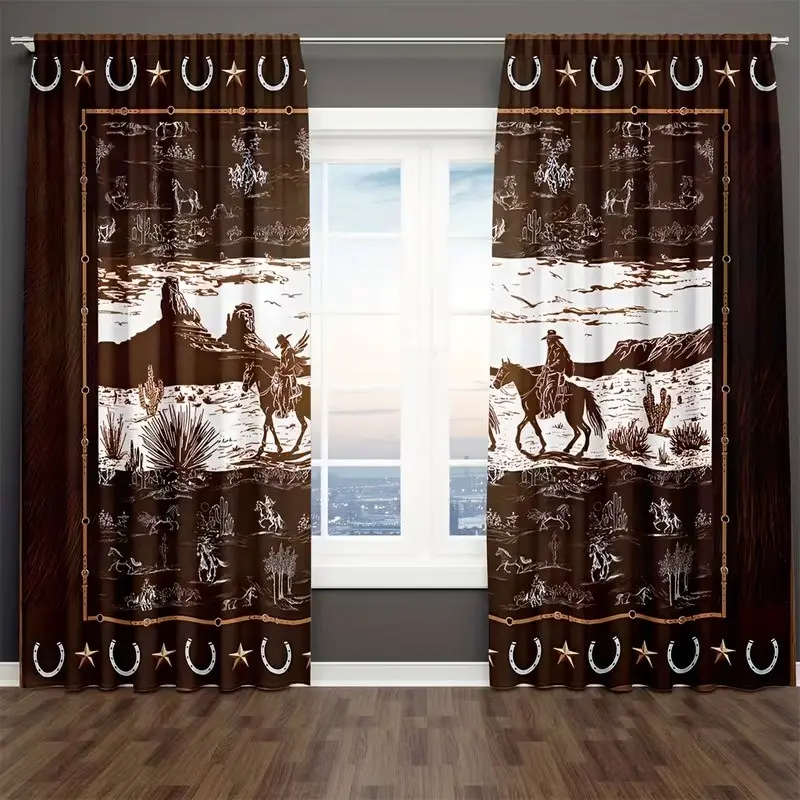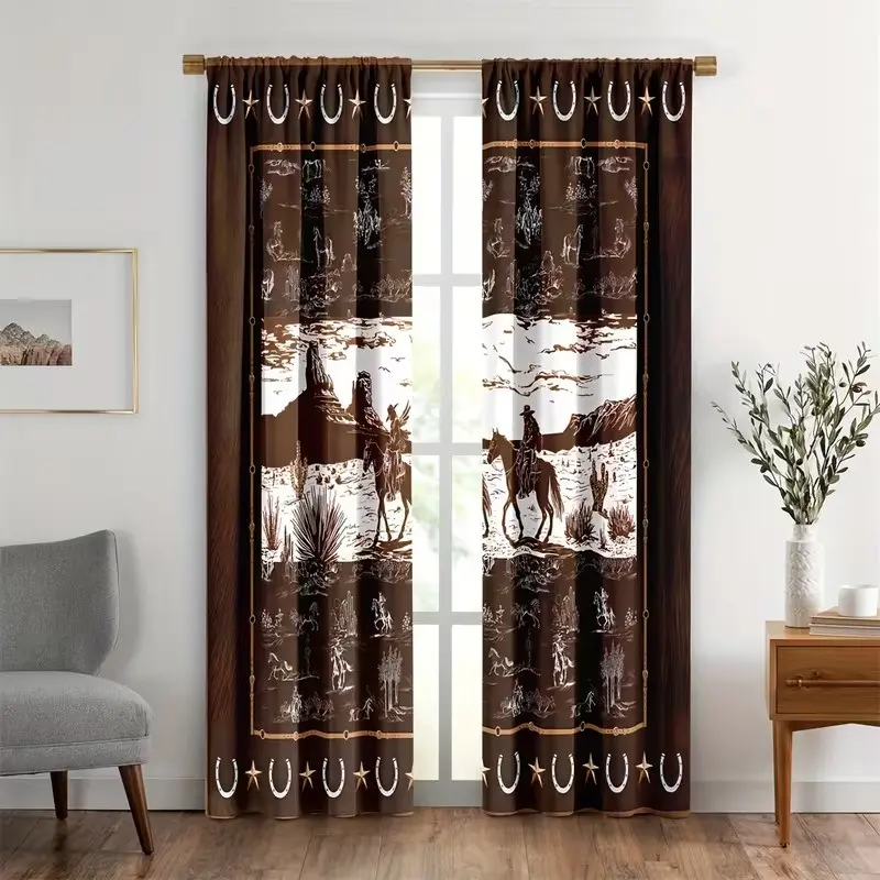 2 pieces of high-definition digital 2 Western-style cactus and palm brown design printed curtains. Made of polyester, semi-transparent, machine washable, suitable for bedrooms, living rooms and home decoration curtains.