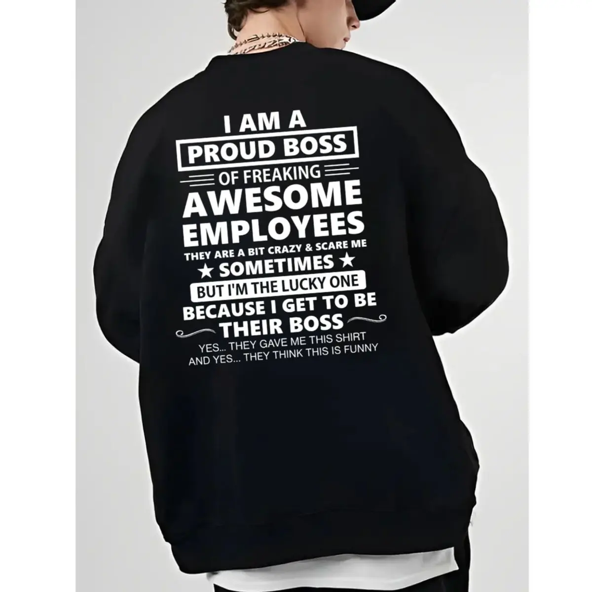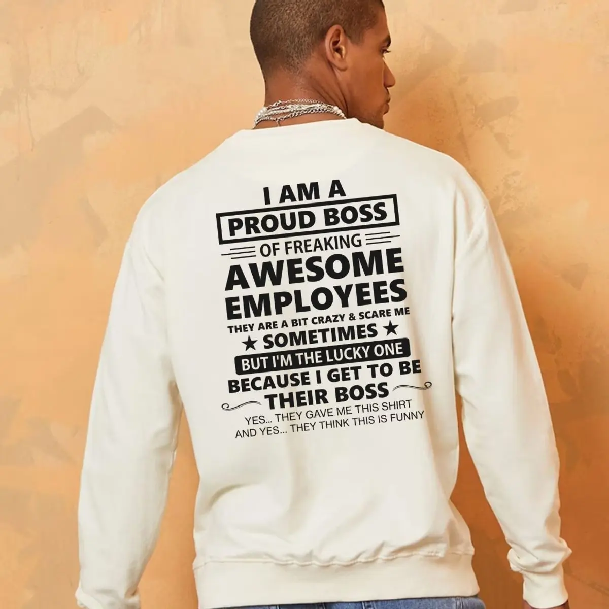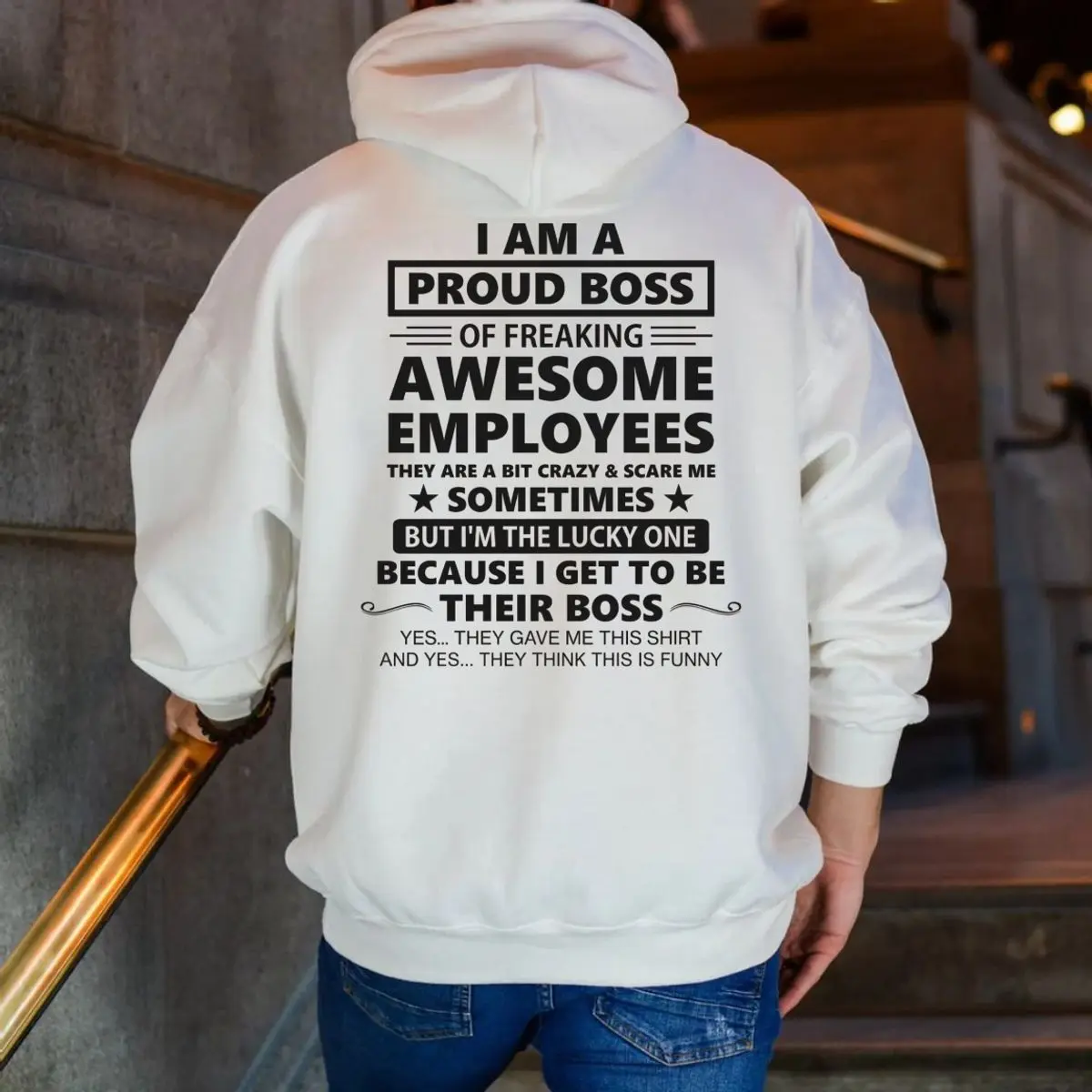 I am a proud boss shirt back print, funny boss t shirt, boss day tee, boss appreciation hoodie, boss birthday gift, unisex long sleeve crewneck tee, casual clothing