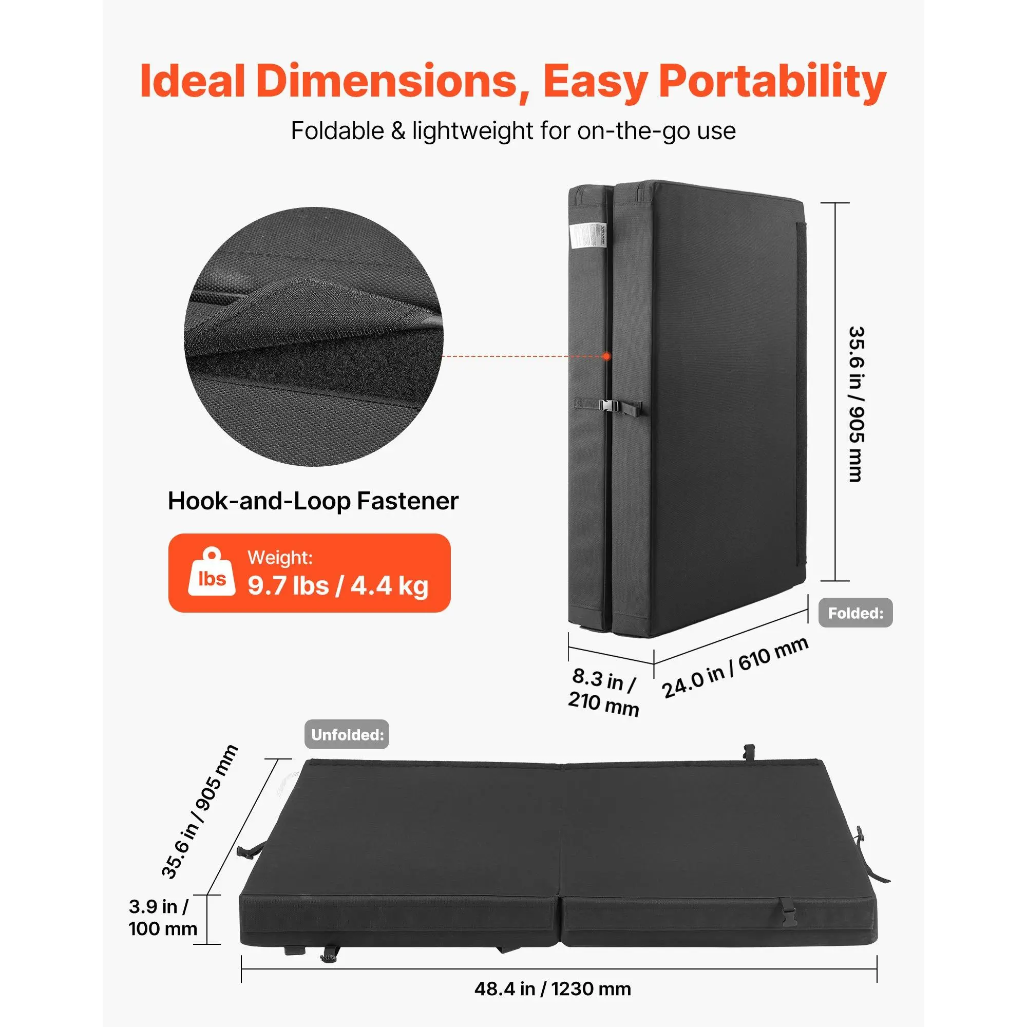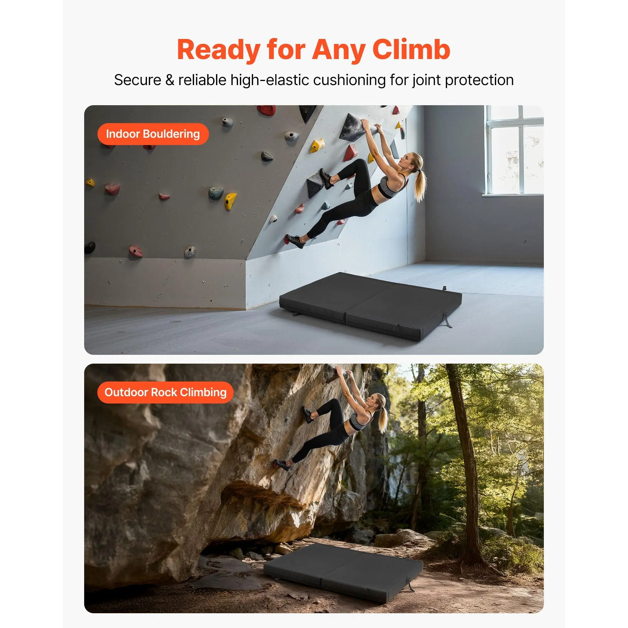 Reliable Cushioning: This bouldering crash pad adopts a sandwich-structured foam design that absorbs hard landings, relieves joint pressure, and keeps you protected during outdoor bouldering or gym training.It avoids bottoming out even on rocky terrainBuilt for Rugged Outdoor Use: Engineered to withstand rocks, dirt, and repeated folding, the rock climbing crash pad features a 900D Oxford fabric cover that's tear-resistant and waterproof.It delivers long-lasting durability in harsh outdoor conditionsThree Carrying Options: Designed for climbers, our bouldering pad includes backpack straps, a waist belt, and a side handle for easy carrying.Adjustable straps and a waist belt allow hands-free hiking, while the side handle makes repositioning effortlessSmart Design: The textured bottom grips slopes and gravel securely to avoid slipping.This foldable climbing crash pad is easy to store or carry and can double as a camping mattress, yoga mat, or workout mat - suitable for nearly any surfaceVersatile Uses: Providing dependable fall protection, this climbing crash pad combines security, durability, and style in one essential piece of bouldering gear.Whether indoors or outdoors, it ensures consistent cushioning and comfort for every sessionVEVOR Bouldering Crash Pad, Bi-Fold Rock Climbing Crash Pad with Adjustable Backpack Straps and Handle, Foldable Lightweight for Indoor Bouldering & Outdoor Climbing, Folded Size 35.6" x 24" x 8.3"