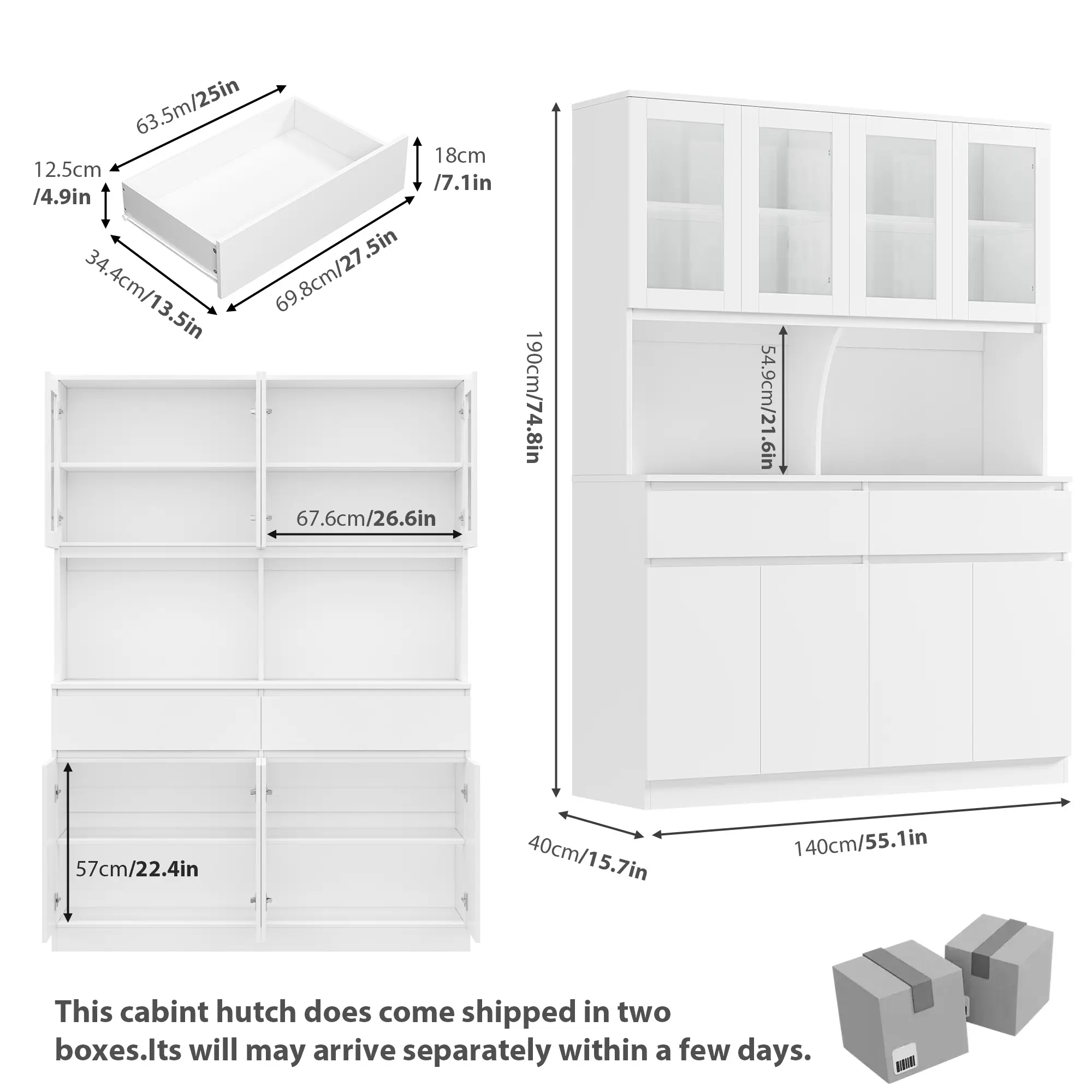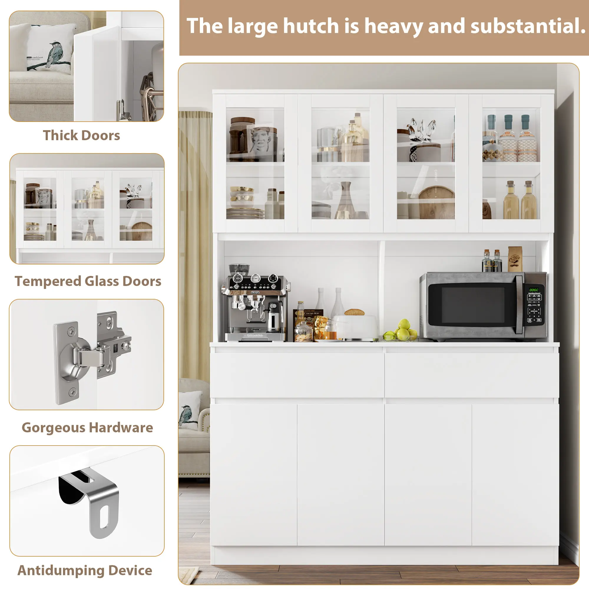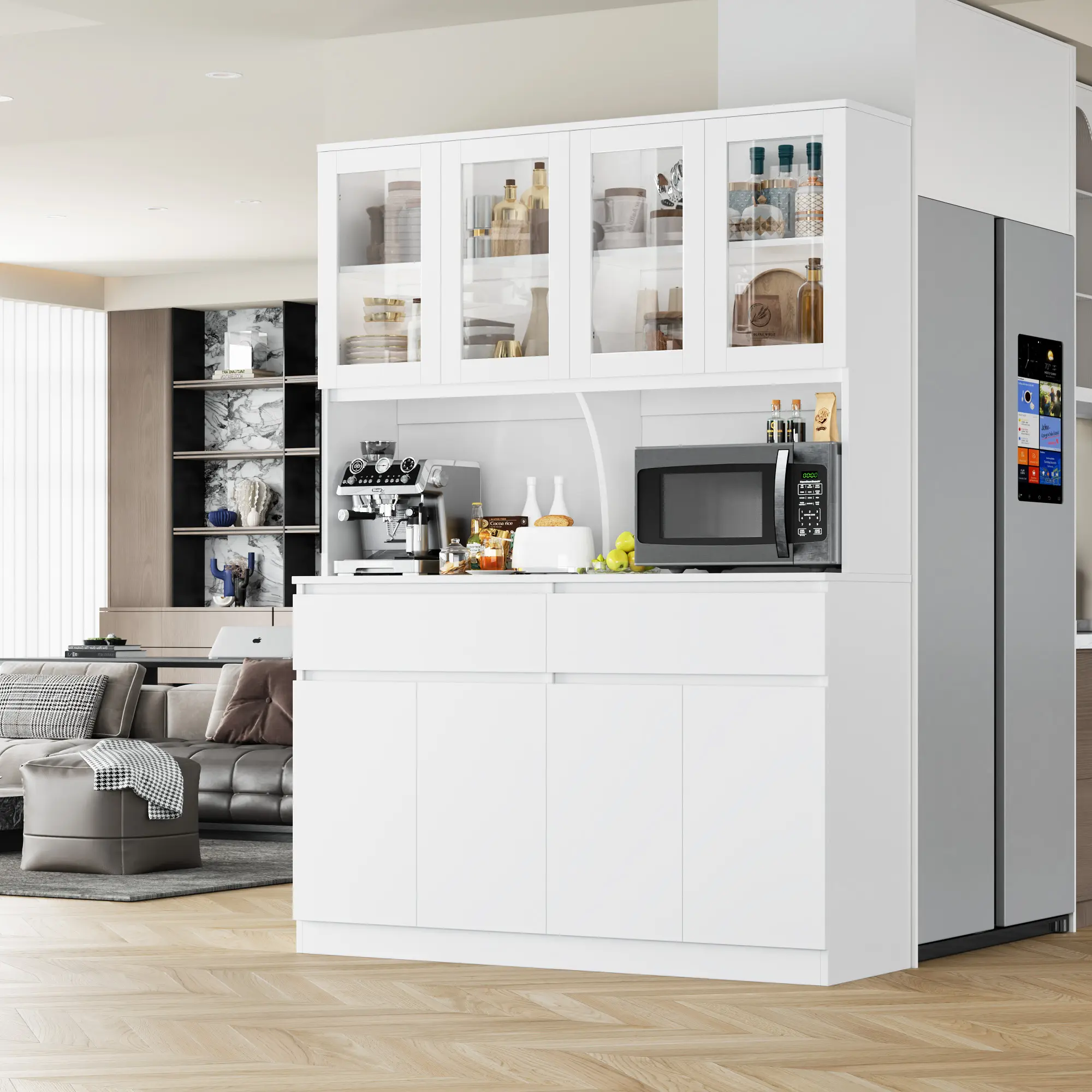 FOTOSOK 74.8" Tall Pantry Cabinet, 55.1" Wide Kitchen Pantry Cabinet with 2 Drawers, Kitchen Hutch with Microwave Stand, Tall Storage Cabinet for Living Room, White