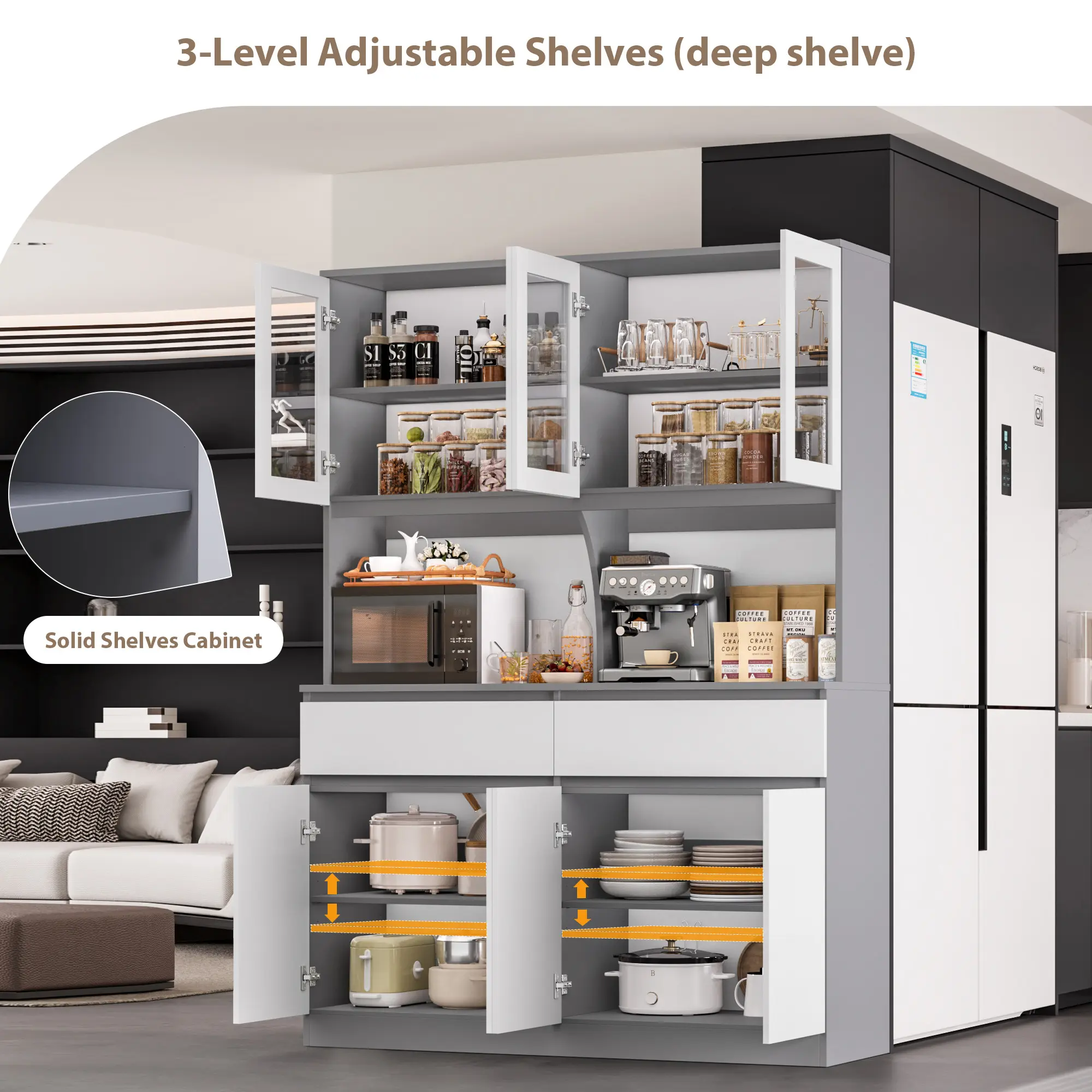 Obsessed with this 73" Wash Gray Storage Case! It’s extremely sturdy and built to last. The 5-tier storage and countertop are perfect for a kitchen pantry or office. It looks high-end, handles heavy items easily, and the doors hide all the clutter. A stylish must-have!