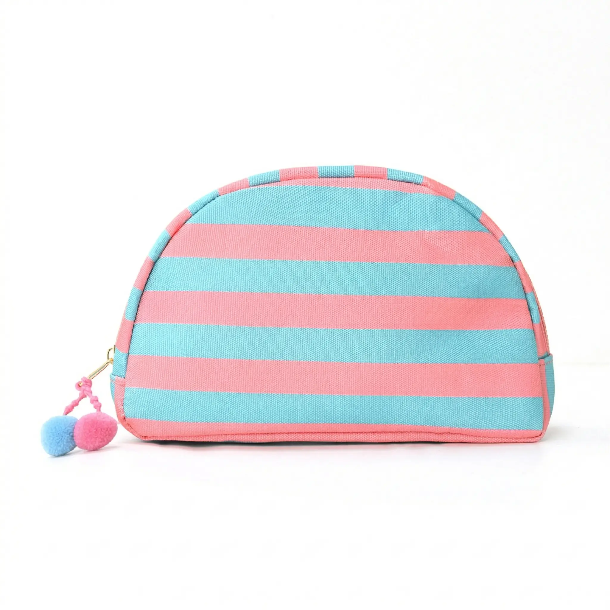 The timeless striped pattern and pom-pom zipper accents make this bag a stylish choice. The smart half-moon shape has a flat base for upright placement and a curved top for large capacity. It fits lotions, palettes, and brushes effortlessly. Stay organized without sacrificing style.