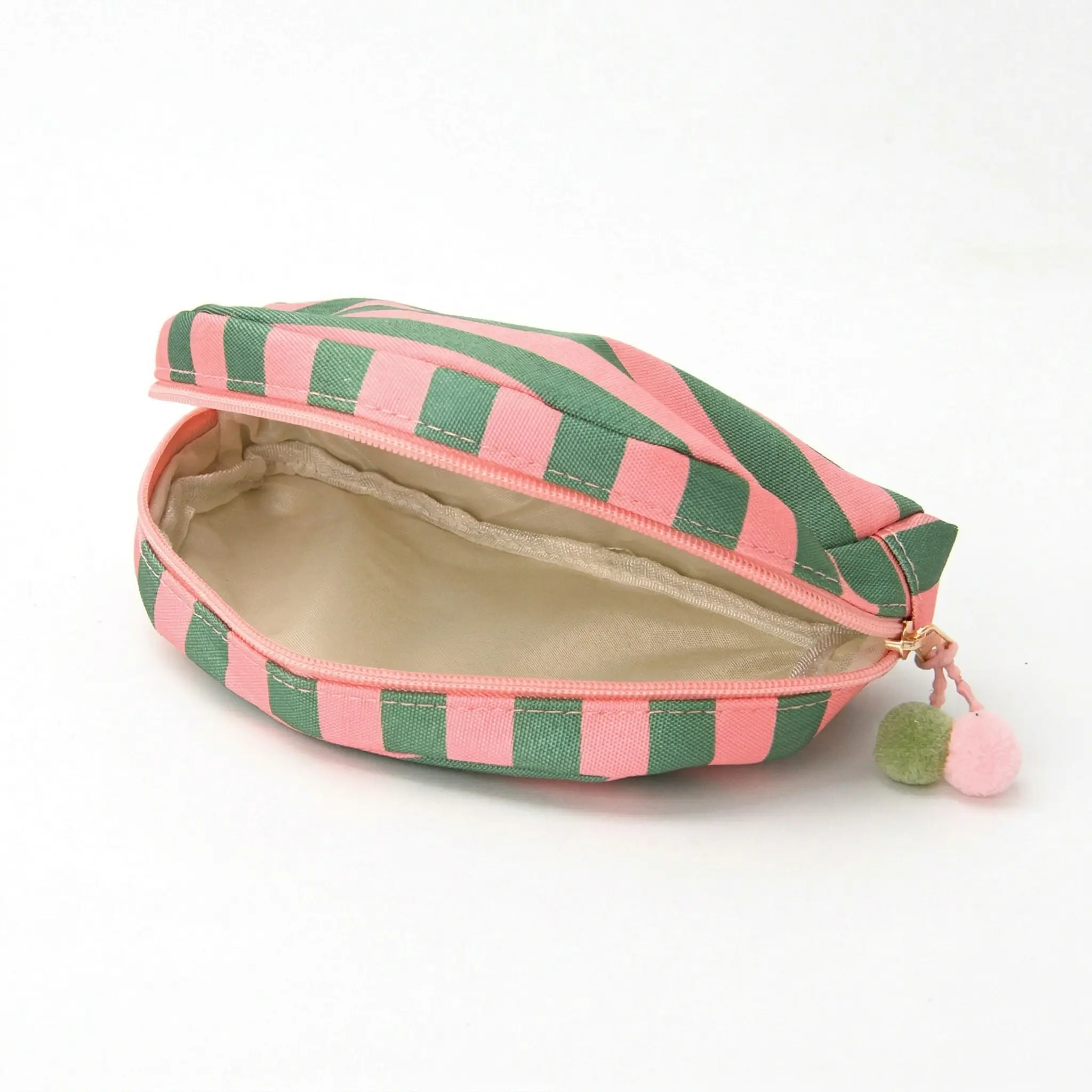 Add a splash of color to your daily routine! This preppy canvas cosmetic pouch is perfect for women and teen girls. It combines fashion and function, keeping your beauty essentials organized. The eye-catching striped pattern and playful pom-pom zipper make it a trendy accessory. Upgrade your storage game today!