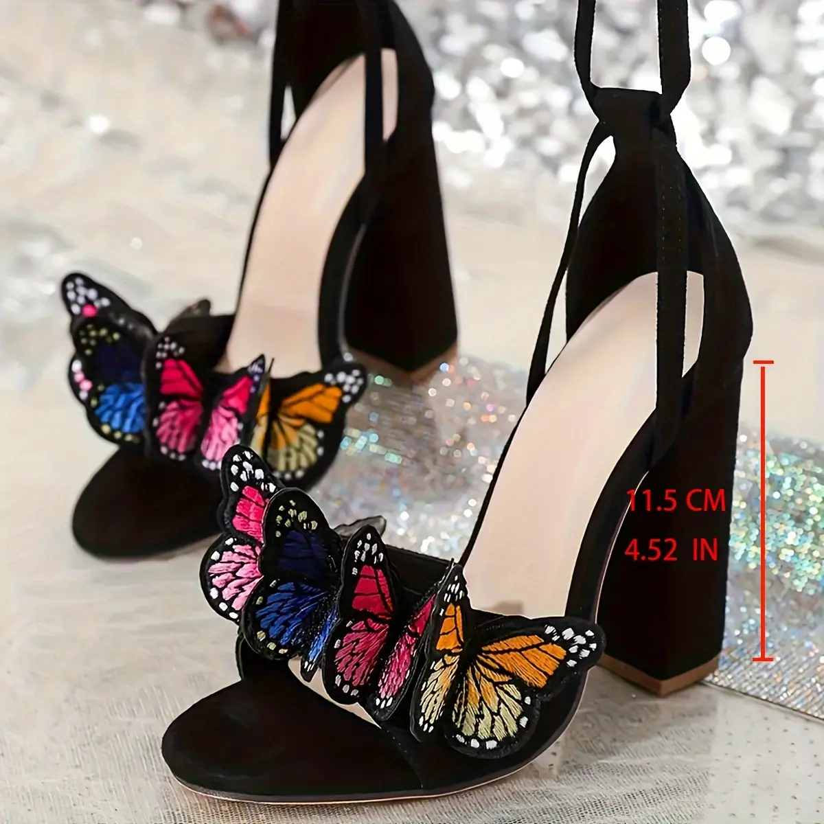 Women's Colorized Butterfly High Heel Sandals, Square Toe with Cross Lace-up Ankle Strap, Thick Heel Party SandalsWomen's Colorized Butterfly High Heel Sandals, Square Toe with Cross Lace-up Ankle Strap, Thick Heel Party Sandals