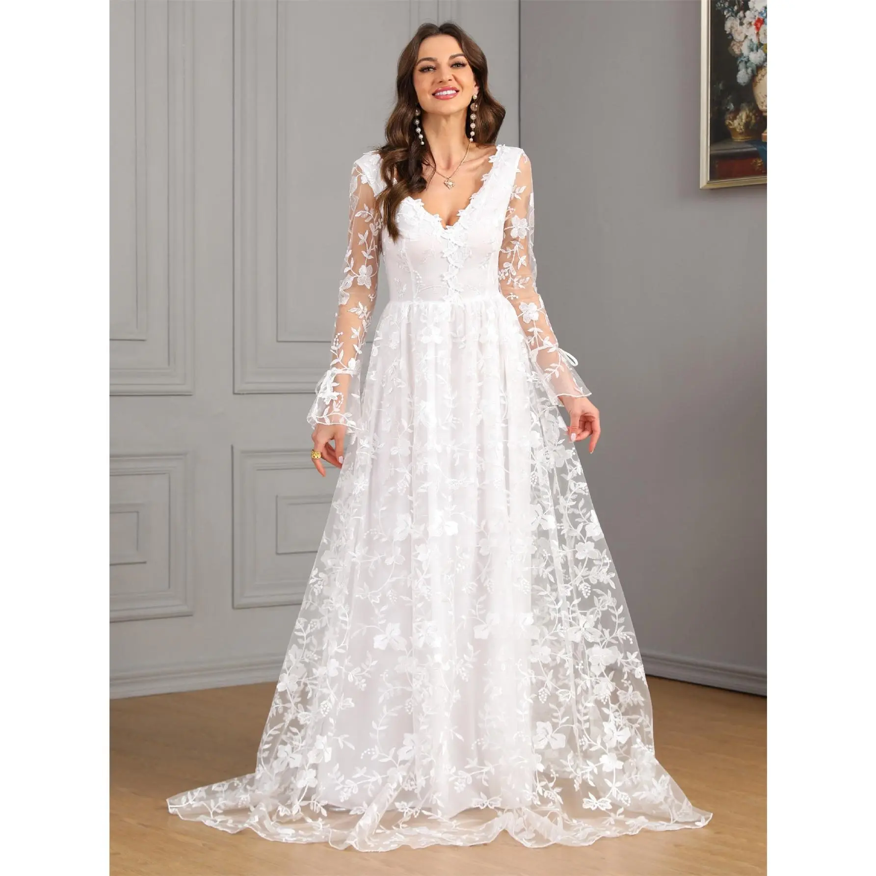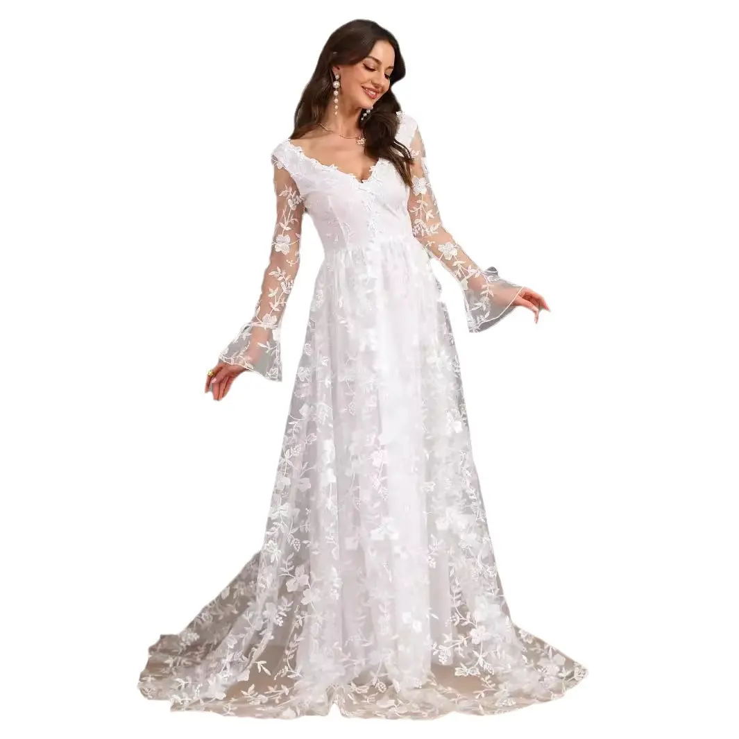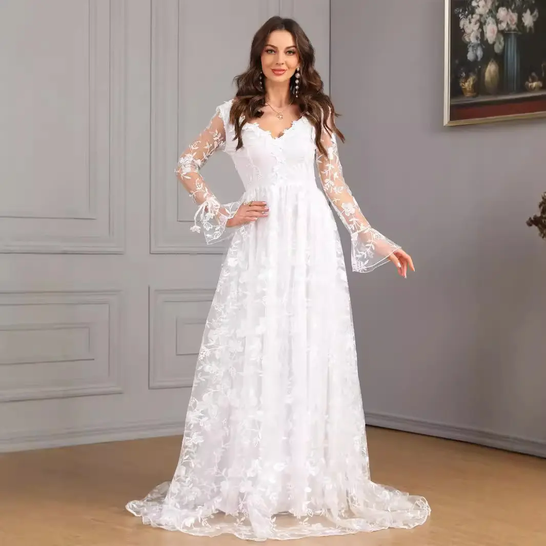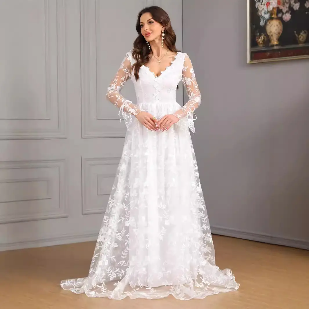 Long Sleeve V-Neck Lace Wedding Dress for Women – Fall/Winter New Style, Full A-Line Train Bridal Gown, Elegant Ceremony Dress