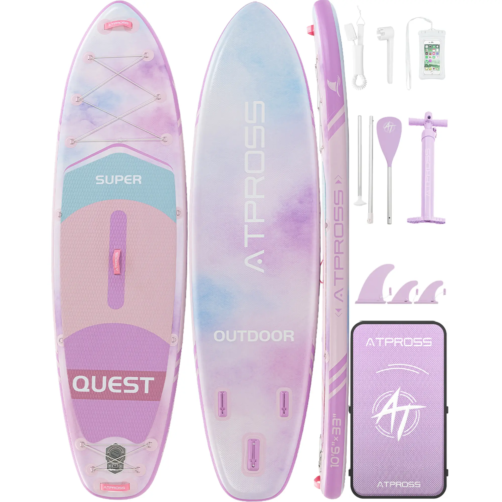 ·【One Set Is Enough & Worry-Free】Complete inflatable paddle board accessories, including 600D Oxford backpack, detachable large and small fins, single and dual paddles, safety leash, two-way hand pump, PVC repair cylinder with wrench, kayak seat, waterproof phone bag and 5L waterproof dry storage bag.