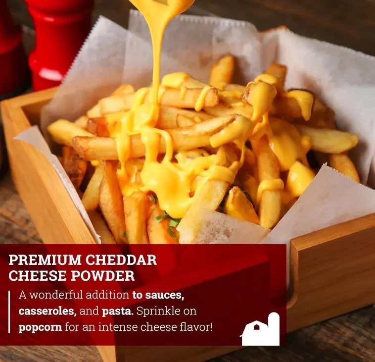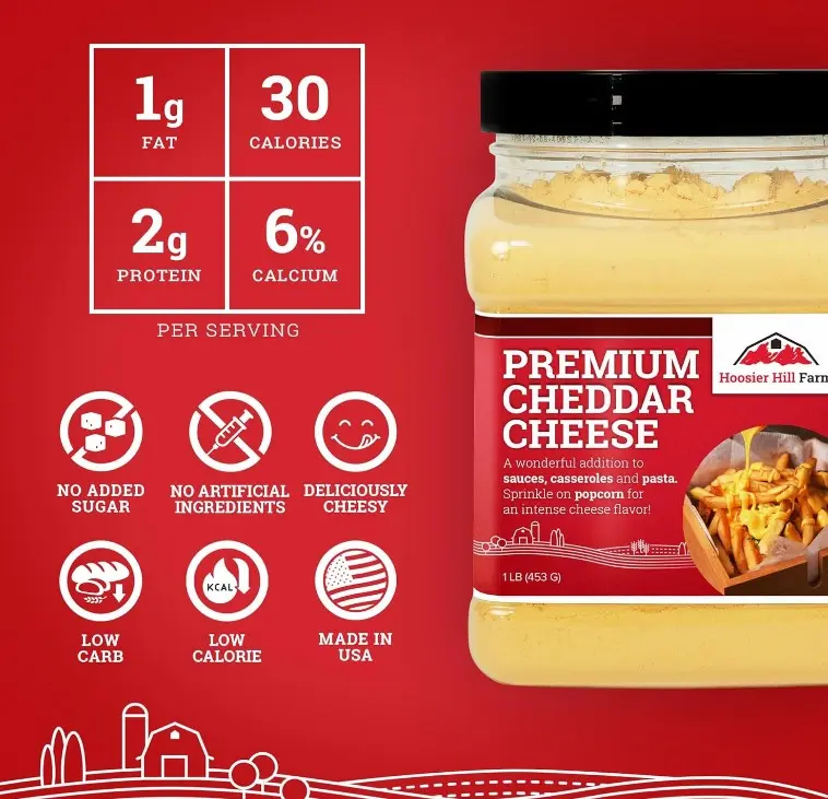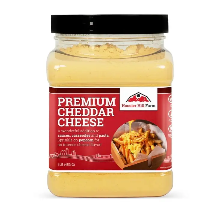 ·Hoosier Hill Farm’s Premium Cheddar Cheese Powder is the natural choice for your kitchen, free from artificial colors and flavoring with bold cheese flavor. Premium Cheddar Cheese Powder offers the same great taste of our best-selling cheddar cheese flavor with no artificial colors.