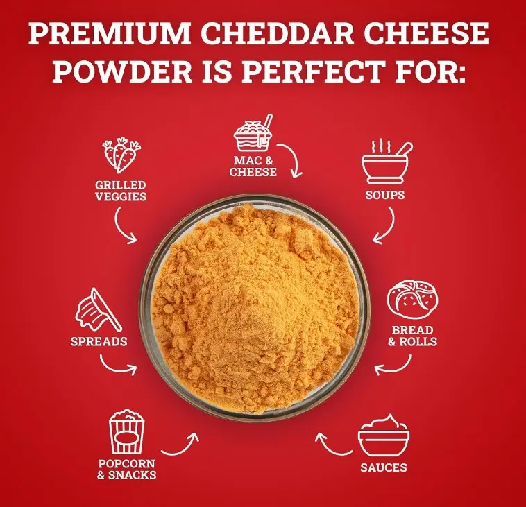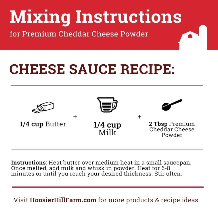 ·Make a Basic Cheese Sauce: To mix a cheddar cheese sauce, melt 1/4 cup of butter or margarine over medium heat in a small saucepan. Once melted, add 1/4 cup of milk and whisk in 2 tablespoons of Premium Cheddar Powder to the pan. Heat until sauce reaches 180F, then cook for an additional 5 minutes, stirring occasionally, until the sauce is thickened. Serve with french fries, soft pretzels, or tortilla chips. Or, pour the sauce over cooked pasta for an easy stovetop macaroni and cheese.