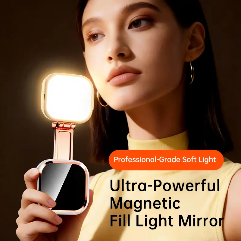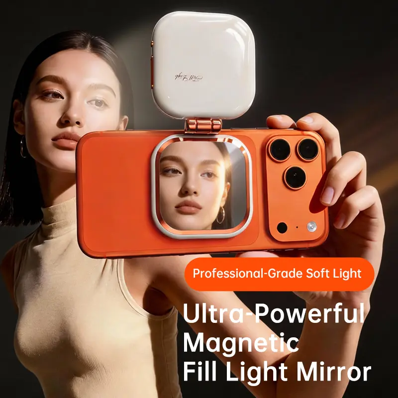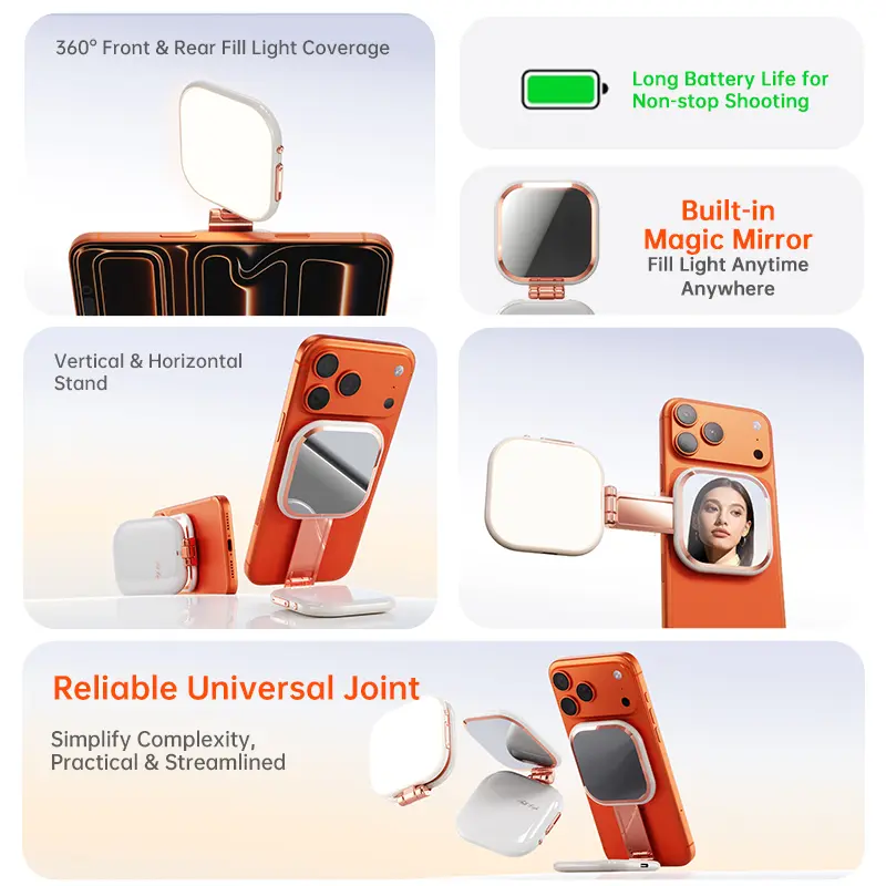 Professional Magnetic Fill Light Mirror, 49 LEDs, Front/Rear 360° Fill, 3 CCT (Warm/Natural/White), Vert/Horiz Stand, Long Battery, Portable Selfie Mirror w/ Universal Joint for Makeup, Vlog, Food Photo