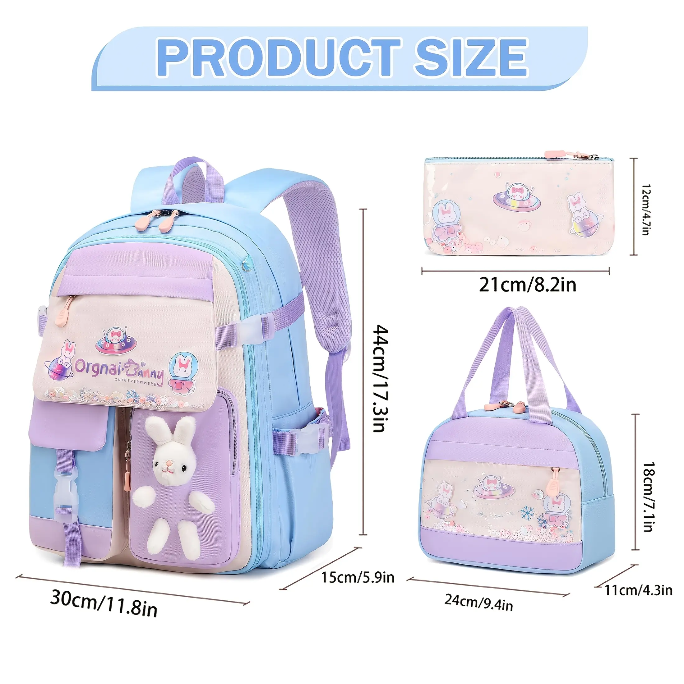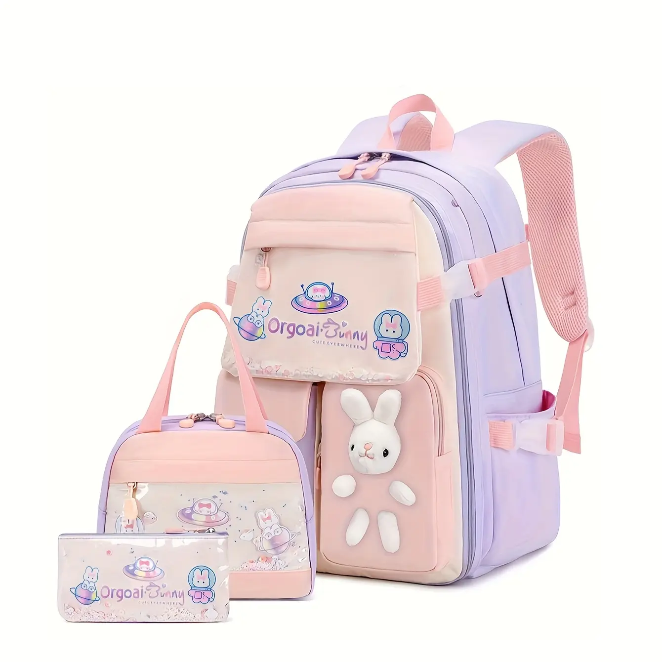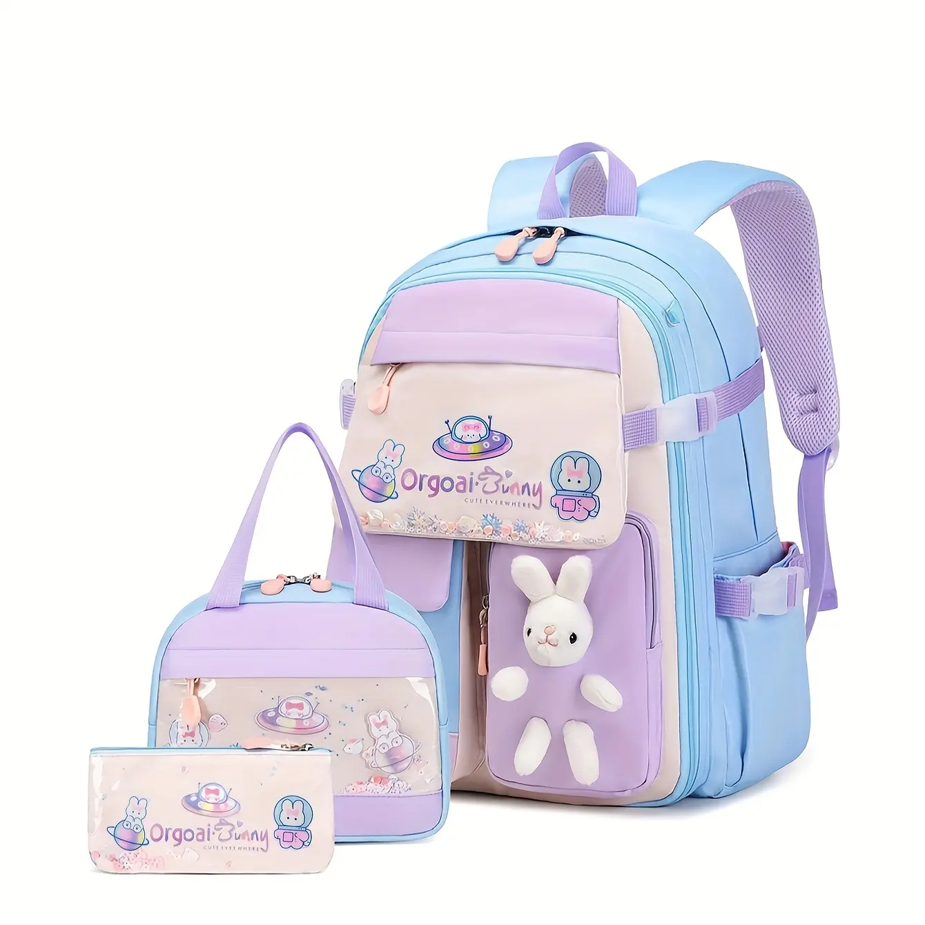 (New)Cute Rabbit Girls Backpack Three-Piece Set: Includes Handbag and Pencil Case, Lightweight Nylon Material, Adjustable Straps