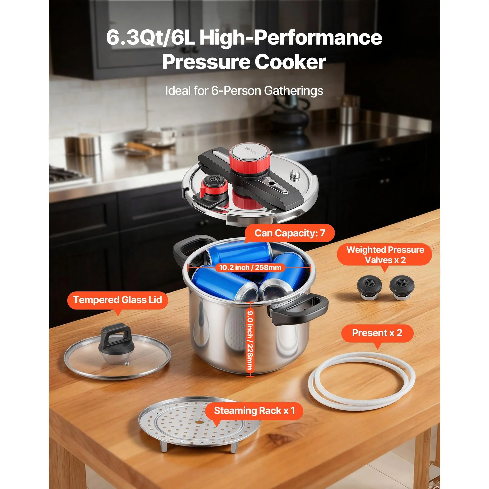 Three-in-One Design: With a 6.3QT/6L capacity, the stovetop pressure cooker brings together a soup pot, steaming rack, and pressure mode.Choose manual release, 60kPa, or 100kPa to match your dish, allowing fast, even cooking that helps retain natural taste and key nutrients under high pressureHigh-Pressure Efficiency: At 100kPa, the pressure rice cooker is up to 70% faster than standard cookware, saving nearly half an hour each use.Its efficient exhaust system shortens waiting, offering households an easy way to enjoy quick preparation and flavored mealsEven-Heat Structure: A triple-layer bottom lets the pressure cooker heat rapidly and evenly on induction, ceramic, electric, or gas stovetops.It fits varied cooking setups without limitation and supports energy savings of up to 75% while keeping mealtime flexible and efficientQuality Stainless Build: Built from 304 stainless steel, our multi cooker maintains shape under heat, limits marks, and slows rust.Its food-grade polished interior helps minimize sticking and wipes clean fast, giving the pot a look that suits a wide range of kitchen spacesSmooth Locking Design: A gradual locking design with a rotating knob lets our multicooker pressure cooker open and close with simple one-hand control. Its ergonomic soft-touch handle and heat-resistant side grips help keep every cooking step steady and comfortable for everyday useVEVOR Pressure Cooker, 6.3Qt Pressure Cooker Stainless Steel, Pressures Canner with Steaming Rack, Tempered Glass Lid, Three Pressures Settings for Meat, Beans, Rice, Soup, Sauces, Cook up to 100 kPa