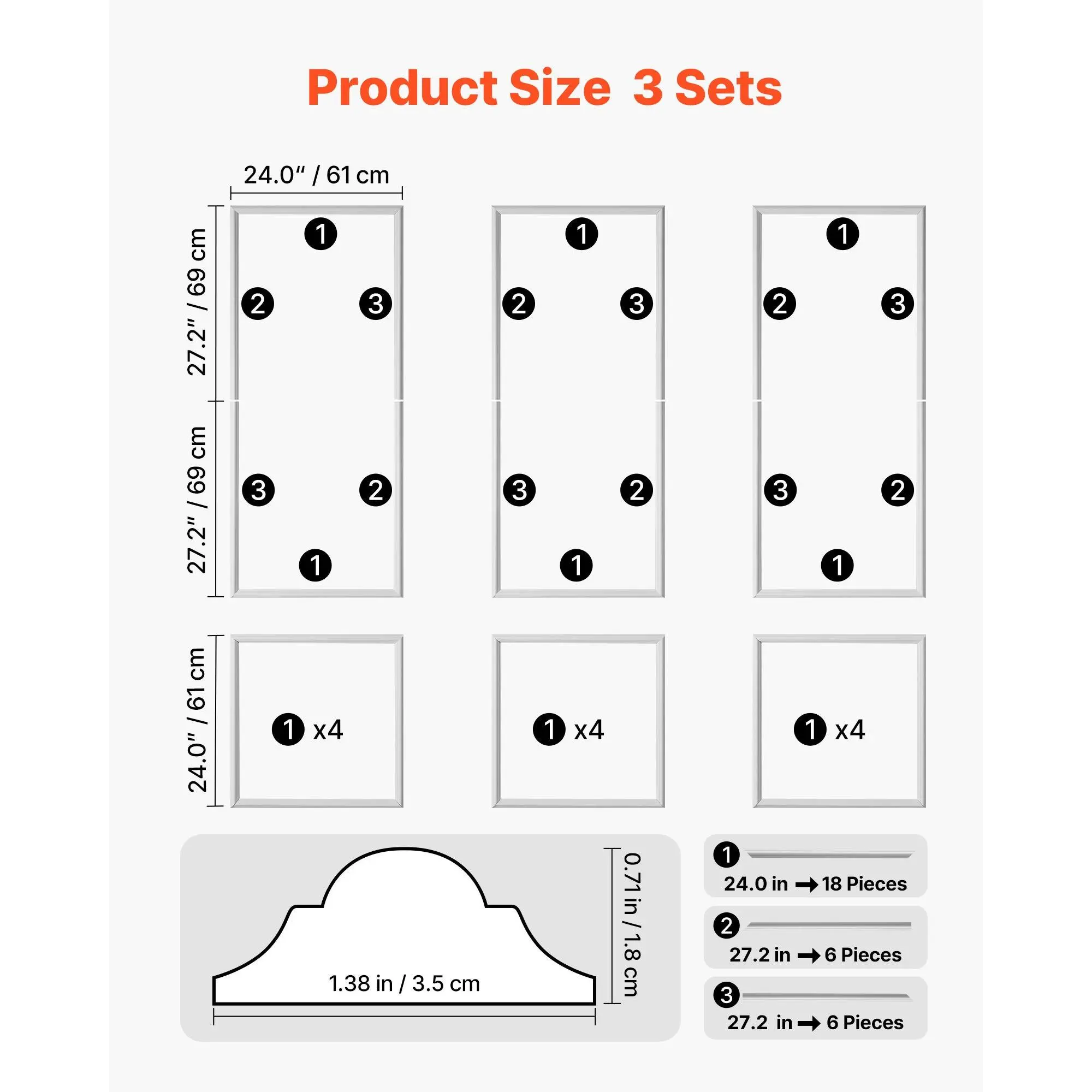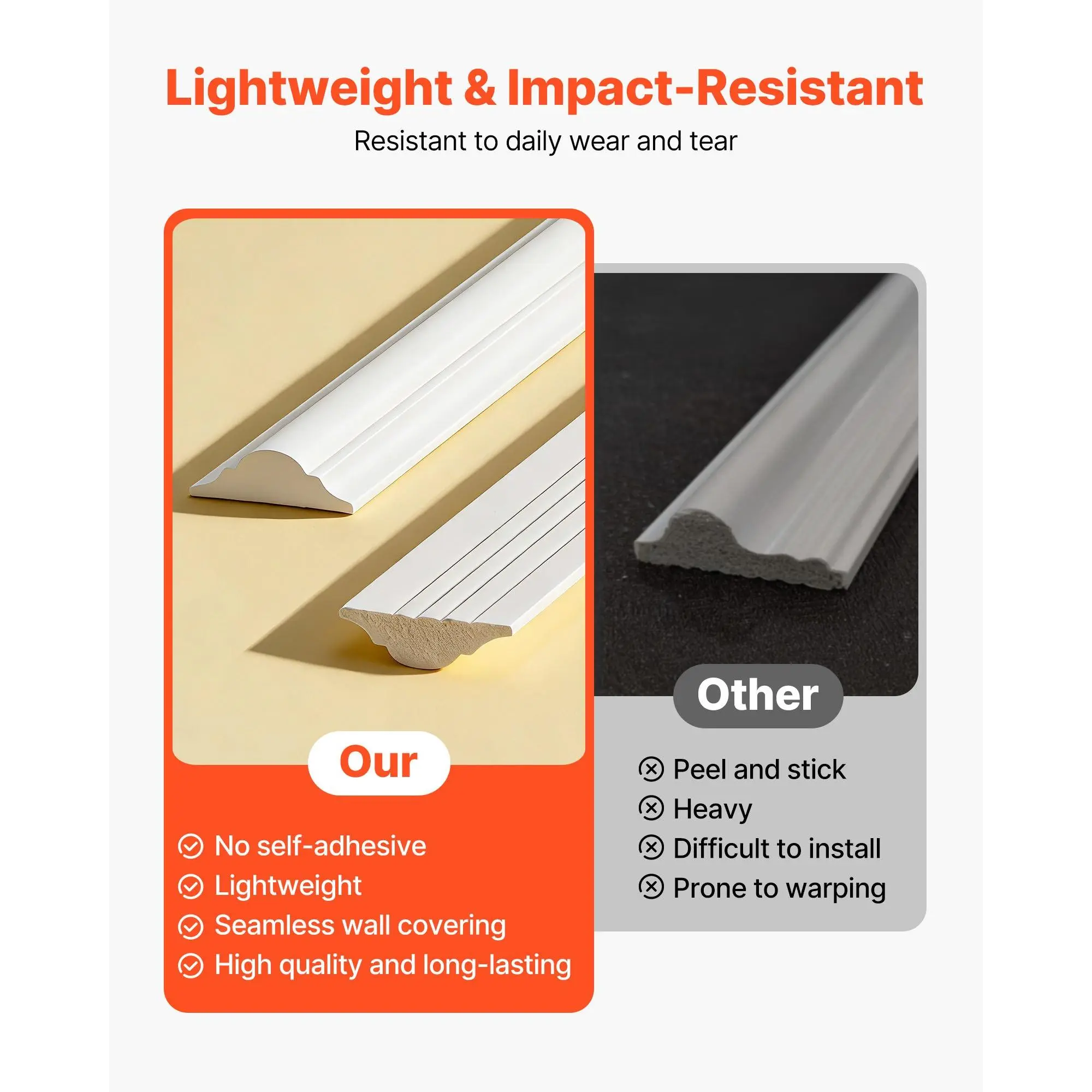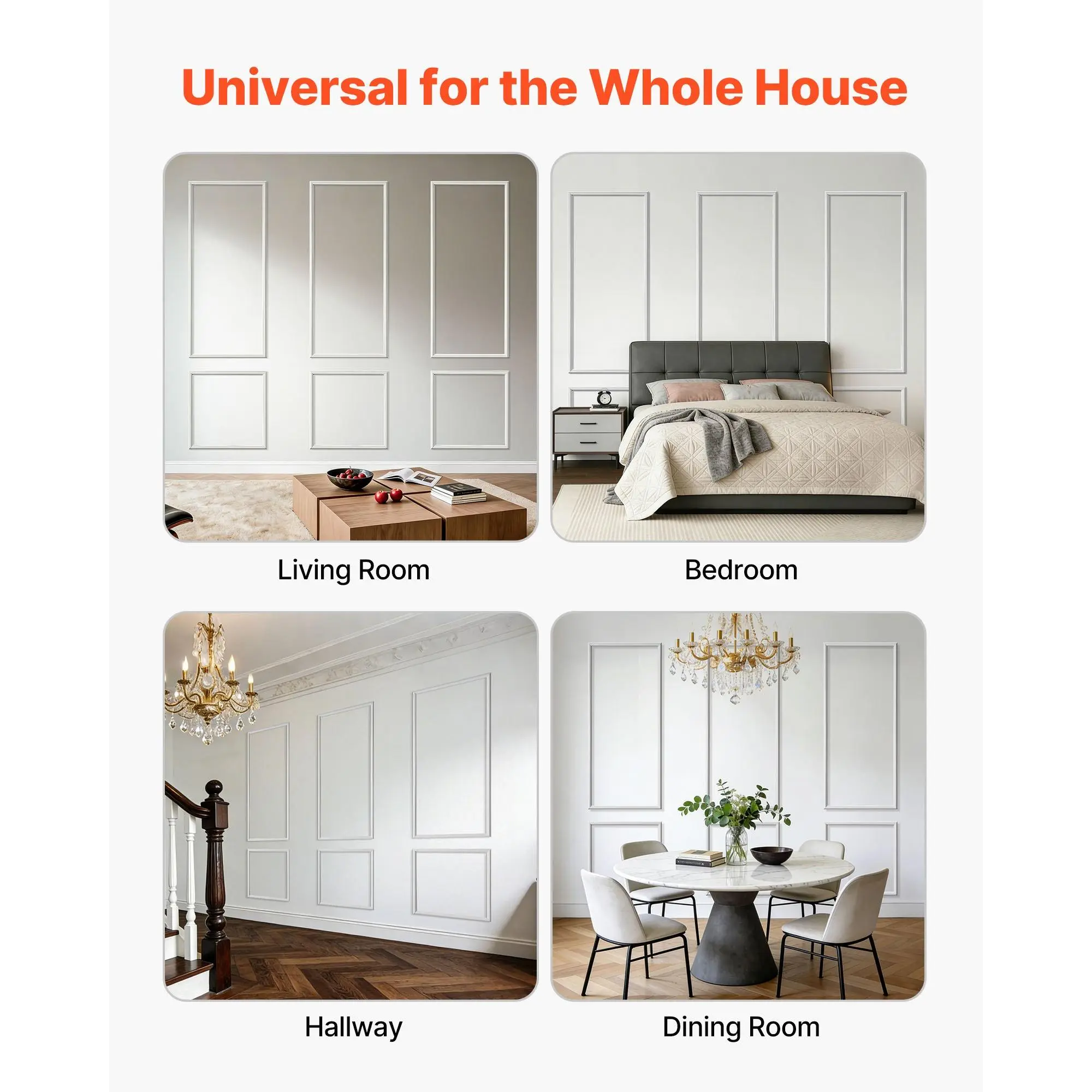 Modern Design for Any Space: This wall molding features clean modern lines that elevate any room with a refined look.Use it as wainscoting panels to create a visual focal point or as accent wall panels to highlight décor and upgrade your interior styleLightweight Premium Construction: Made from sturdy polystyrene, this wall trim is lightweight yet long-lasting.The molding trim resists damp, warping, and cracking, ensuring stable alignment and reliable indoor performance for years to comePre-Cut for Easy Installation: Each piece of molding trim is machine-cut with precise angles, allowing you to install without cutting or measuring.Apply with adhesive for fast, mess-free setup, ideal for renters needing removable accent wall panelsDIY-Ready Paintable Surface: These wainscoting panels feature a smooth, paintable surface for limitless creativity.Customize your wall trim with paint, decals, or décor.Waterproof testing ensures adhesion stays strong even after painting, long-term useVersatile for Multiple Rooms: This molding trim works with 10+ interior styles, from modern to classic.Use it as wall molding or accent wall panels in living rooms, bedrooms, hallways, or bathrooms to transform plain walls into stylish, elevated spacesVEVOR Wall Molding 3 Pack, Wainscoting Panels Kit, Lightweight Paintable Polystyrene, Easy to Install, Waterproof Accent Wide Profile Trim for Interior Living Room, Bedroom,White (24x54 + 24x24 in)