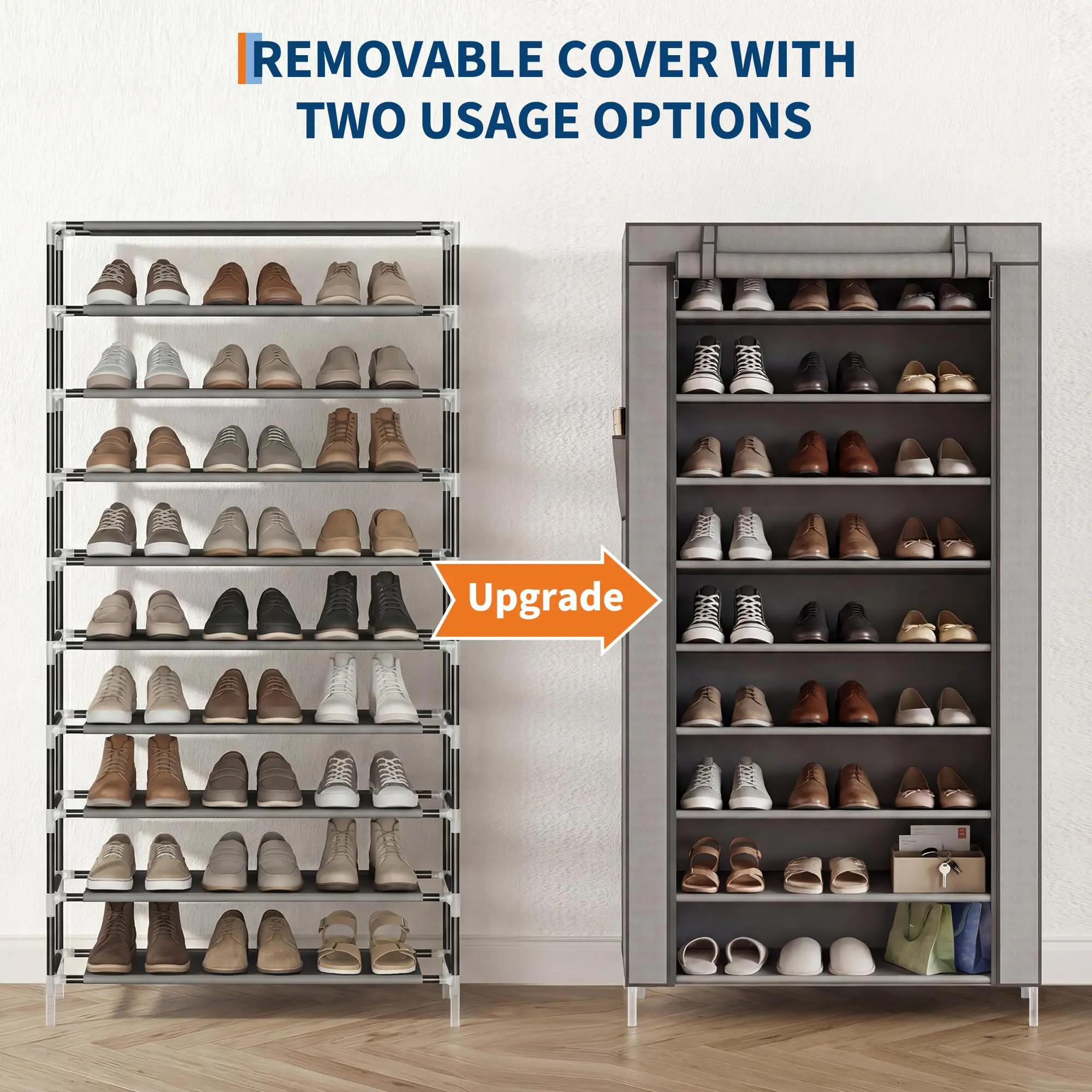 · Extra-Large Capacity for 40–50 Pairs---Measuring 34.6“L x 11”W x 63"H, this tall 10-tier shoe rack holds about 40–50 pairs of shoes. Removable tiers allow you to increase shelf height to store long boots, making it ideal for sneakers, heels, flats, ankle boots, and tall boots.