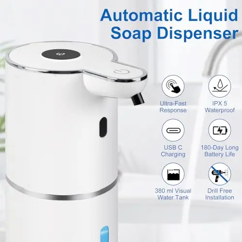 ·6-Level Adjustable Dispensing: This hands free soap dispenser features 6 adjustable levels to control soap volume precisely and reduce waste. It works with a wide range of liquids, making it suitable as a liquid soap dispenser, a dish soap dispenser for kitchen, or a hand soap dispenser for bathroom depending on your needs.