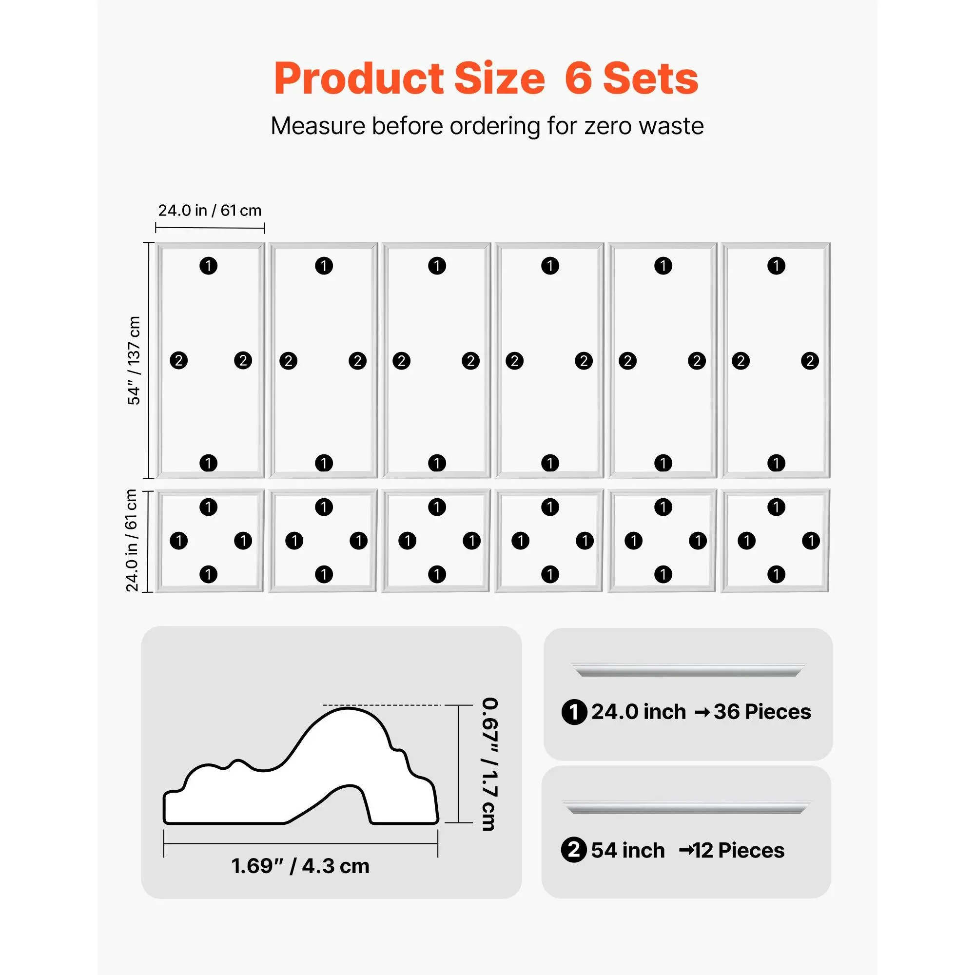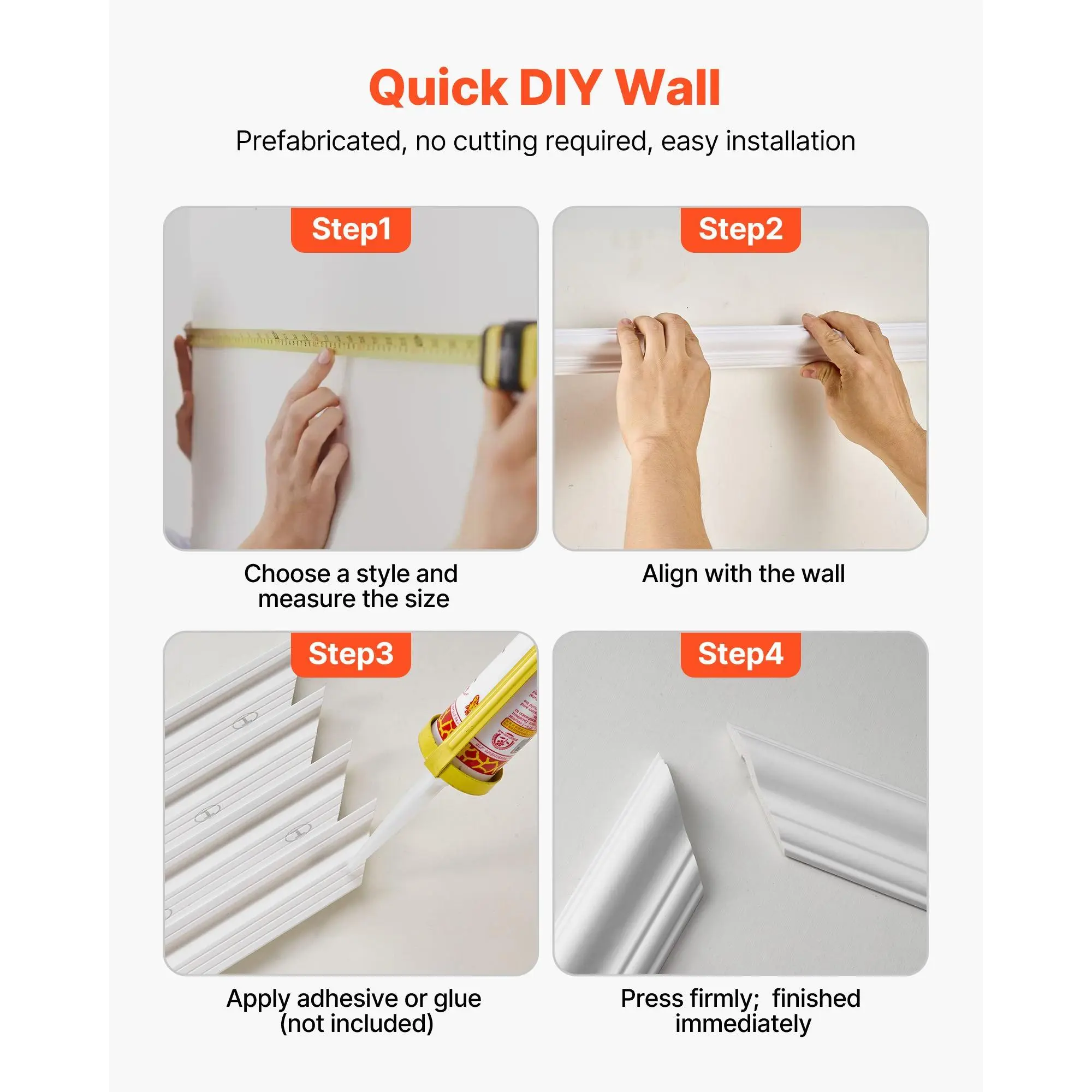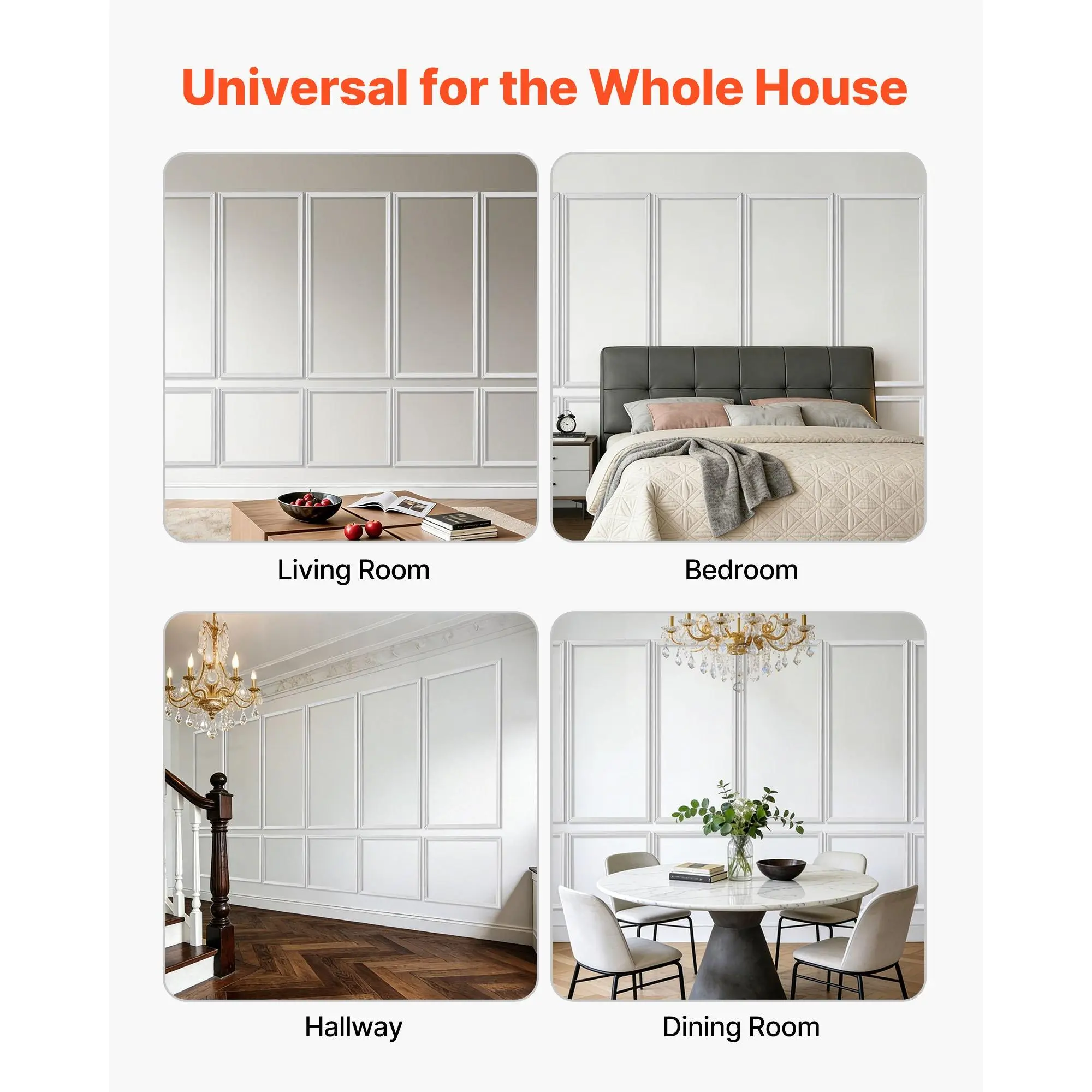 Modern Design for Any Space: This wall molding features clean modern lines that elevate any room with a refined look.Use it as wainscoting panels to create a visual focal point or as accent wall panels to highlight décor and upgrade your interior styleLightweight Premium Construction: Made from sturdy polystyrene, this wall trim is lightweight yet long-lasting.The molding trim resists damp, warping, and cracking, ensuring stable alignment and reliable indoor performance for years to comePre-Cut for Easy Installation: Each piece of molding trim is machine-cut with precise angles, allowing you to install without cutting or measuring.Apply with adhesive for fast, mess-free setup, ideal for renters needing removable accent wall panelsDIY-Ready Paintable Surface: These wainscoting panels feature a smooth, paintable surface for limitless creativity.Customize your wall trim with paint, decals, or décor.Waterproof testing ensures adhesion stays strong even after painting, long-term useVersatile for Multiple Rooms: This molding trim works with 10+ interior styles, from modern to classic.Use it as wall molding or accent wall panels in living rooms, bedrooms, hallways, or bathrooms to transform plain walls into stylish, elevated spacesVEVOR Wall Molding 6 Pack, Wainscoting Panels Kit, Lightweight Paintable Polystyrene, Easy to Install, Waterproof Accent Wall Trim for Interior Décor Living Room, Bedroom, White (24x54 + 24x24 in)