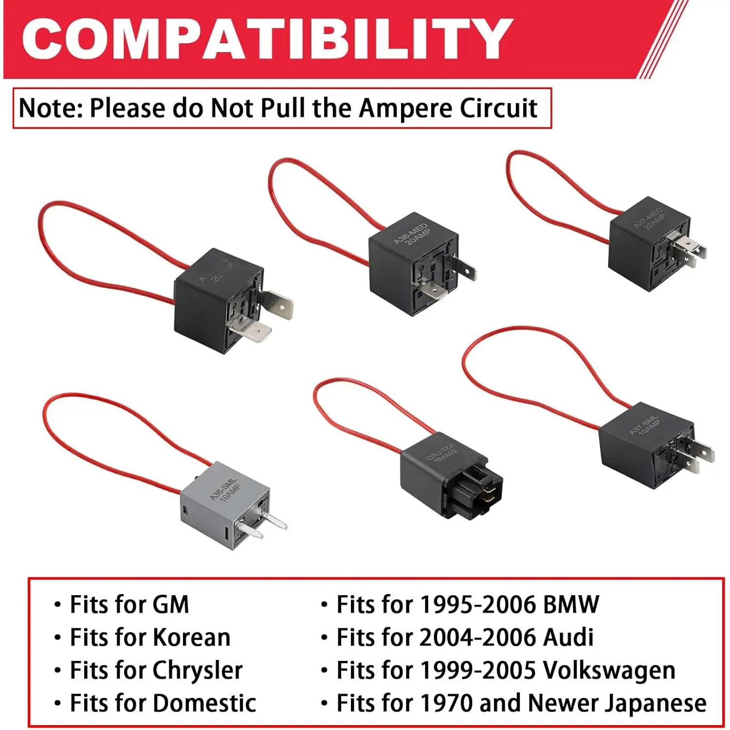 【Compatible】Fits for GM; Korean; Chrysler; Domestic; 2004-2006 Audi; 1995-2006 BMW; 1999-2005 Volkswagen; 1970 and Newer Japanese.This Relay Bypass Kit has Up to 20 Ampere Continuous and 30 Ampere Surge (12V),Suitable for Most Models on the Market.