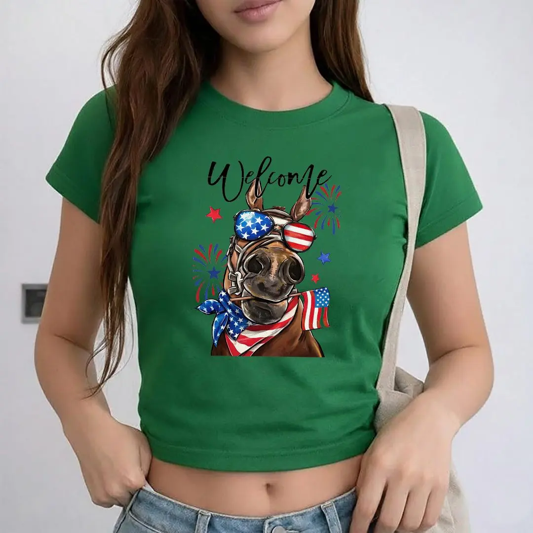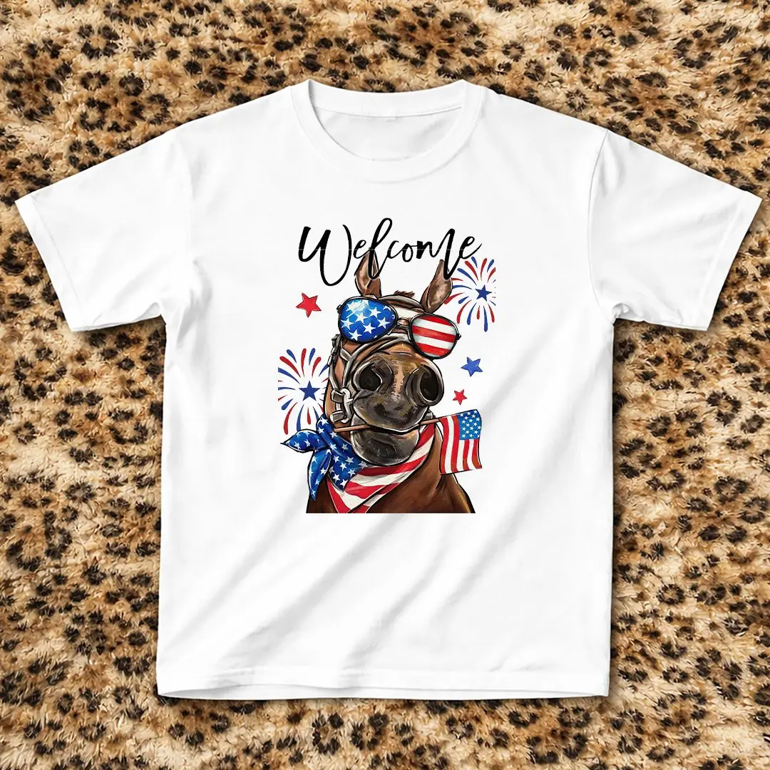 5. Welcome America Horse Baby Tee, Patriotic Cowboy Tee, USA Flag Sunglasses Graphic, 4th of July Gift Idea.