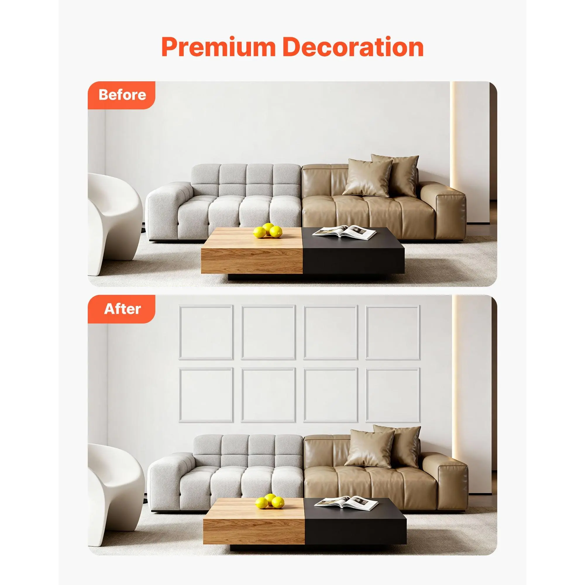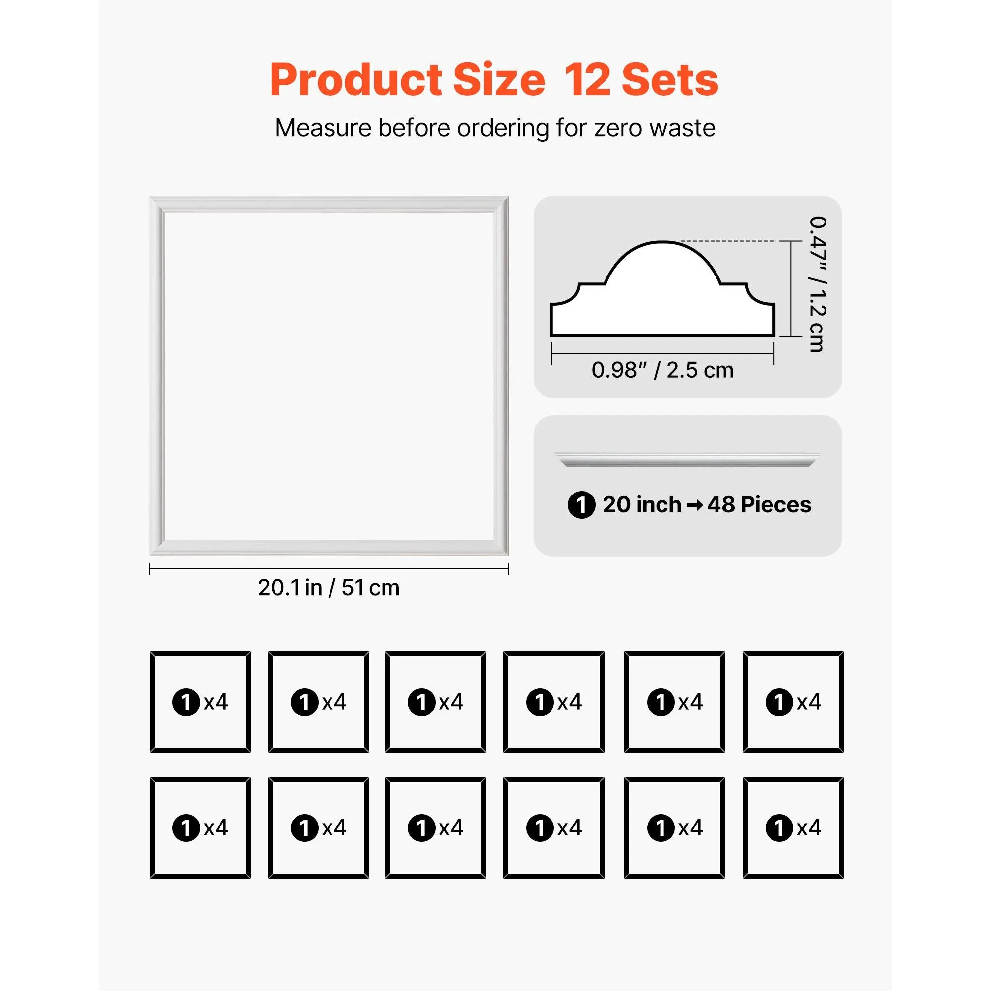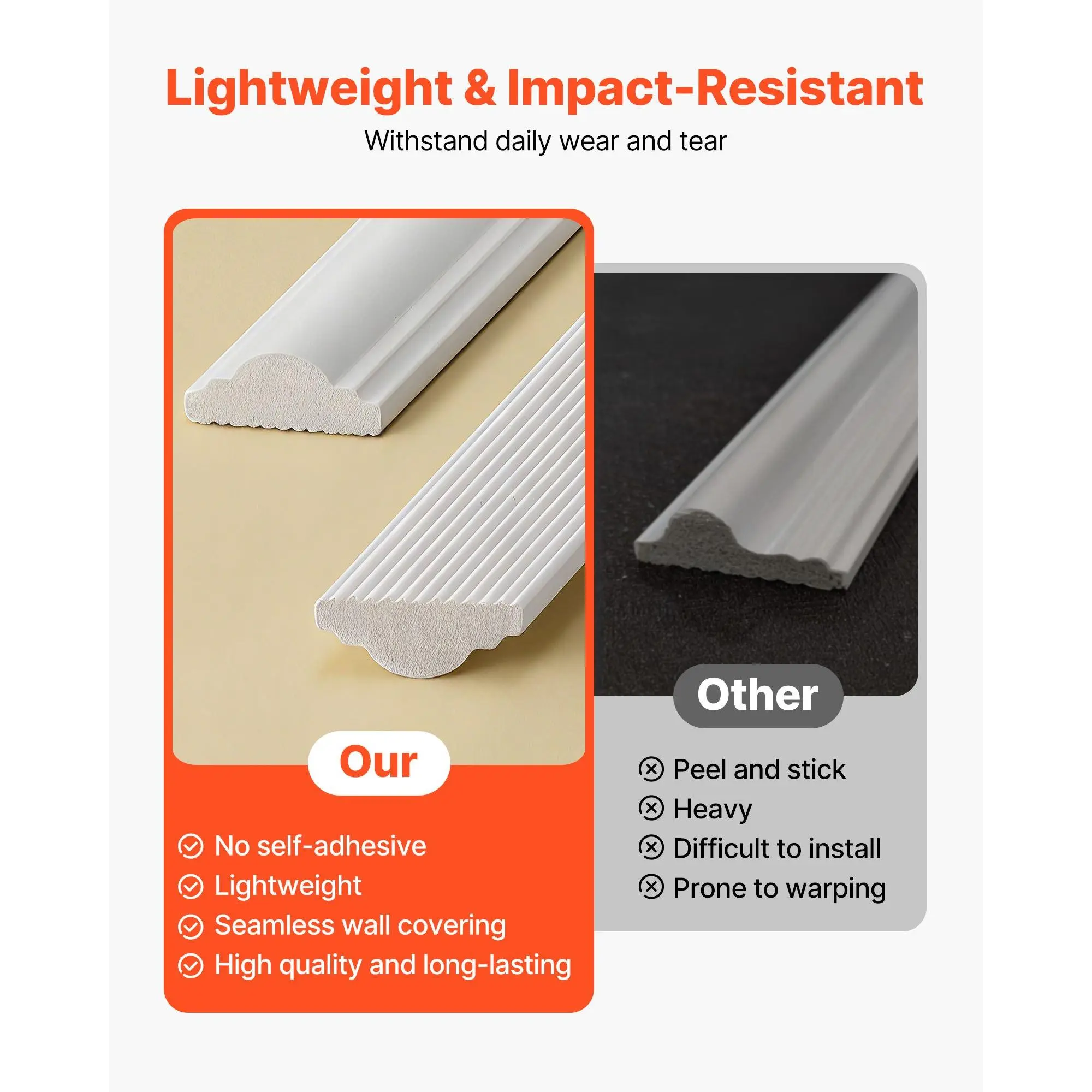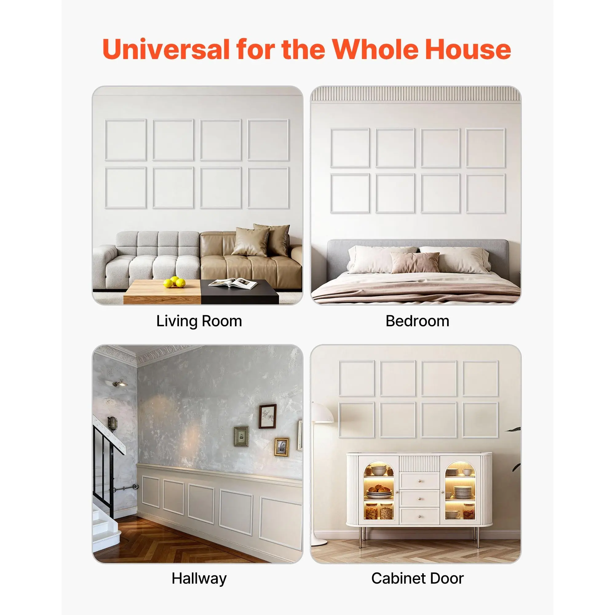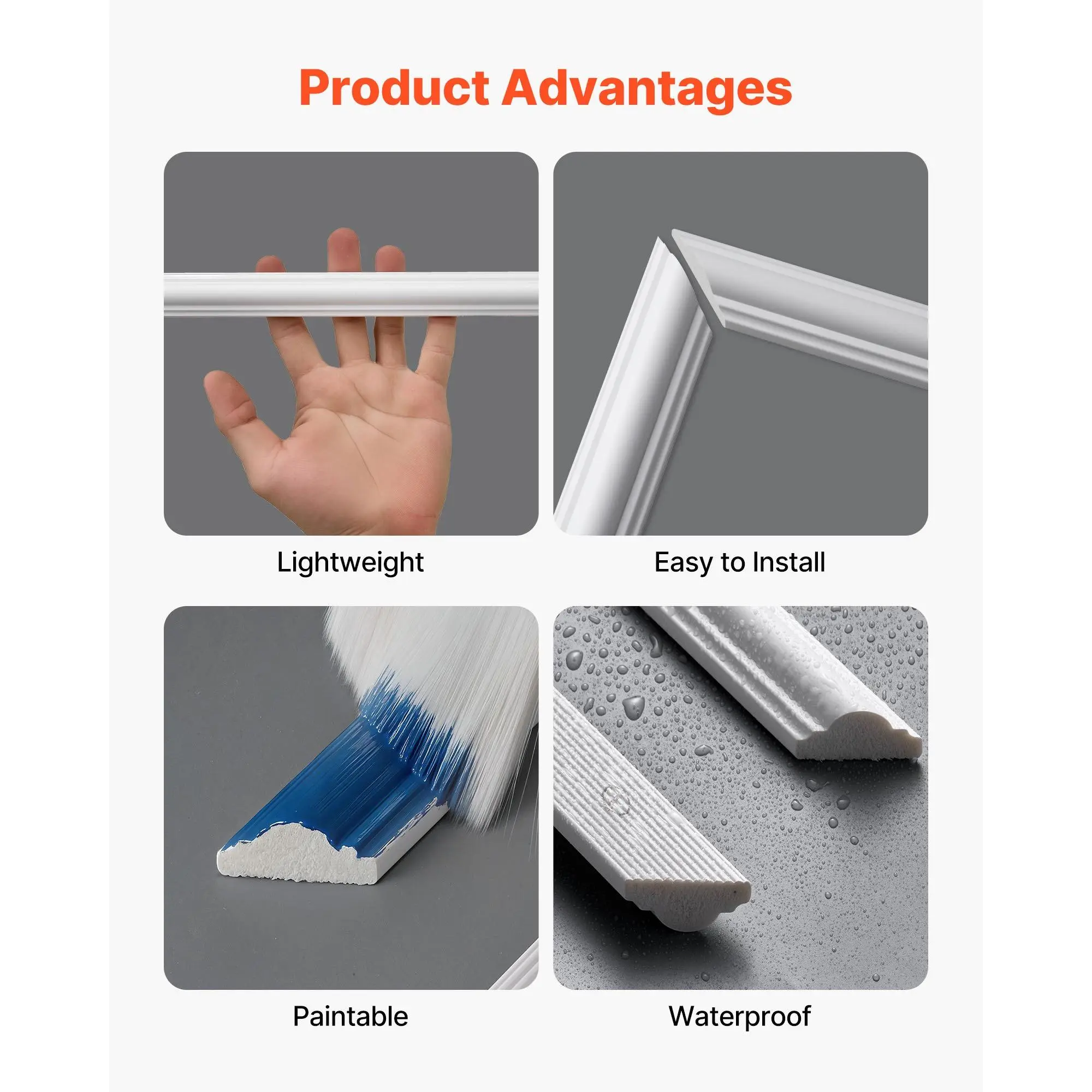 Modern Design for Any Space: This wall molding features clean modern lines that elevate any room with a refined look.Use it as wainscoting panels to create a visual focal point or as accent wall panels to highlight décor and upgrade your interior styleLightweight Premium Construction: Made from sturdy polystyrene, this wall trim is lightweight yet long-lasting.The molding trim resists damp, warping, and cracking, ensuring stable alignment and reliable indoor performance for years to comePre-Cut for Easy Installation: Each piece of molding trim is machine-cut with precise angles, allowing you to install without cutting or measuring.Apply with adhesive for fast, mess-free setup, ideal for renters needing removable accent wall panelsDIY-Ready Paintable Surface: These wainscoting panels feature a smooth, paintable surface for limitless creativity.Customize your wall trim with paint, decals, or décor.Waterproof testing ensures adhesion stays strong even after painting, long-term useVersatile for Multiple Rooms: This molding trim works with 10+ interior styles, from modern to classic.Use it as wall molding or accent wall panels in living rooms, bedrooms, hallways, or bathrooms to transform plain walls into stylish, elevated spacesVEVOR Wall Molding 12 Pack, 20 x 20 in Wainscoting Panels Kit, Lightweight Paintable Polystyrene, Easy to Install, Waterproof Accent Wall Trim for Interior Décor Living Room, Bedroom, Home, White